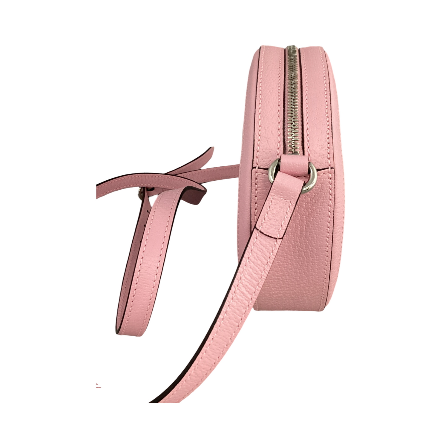 Gucci Multicolor GG supreme Psychedelic round crossbody with silver-toned hardware, a rounded crossbody bag crafted of canvas in black with multicolored Gucci monogram and stars, a calfskin leather trim in pink, an adjustable leather shoulder strap, and zip top closure. Interior features a black fabric interior.