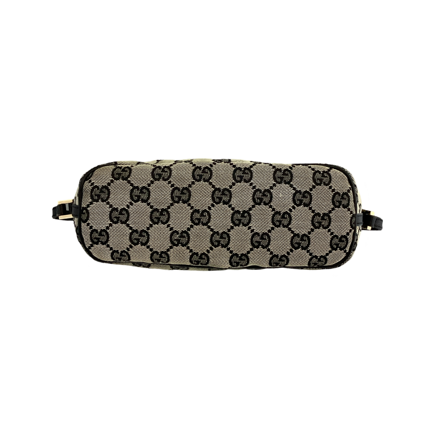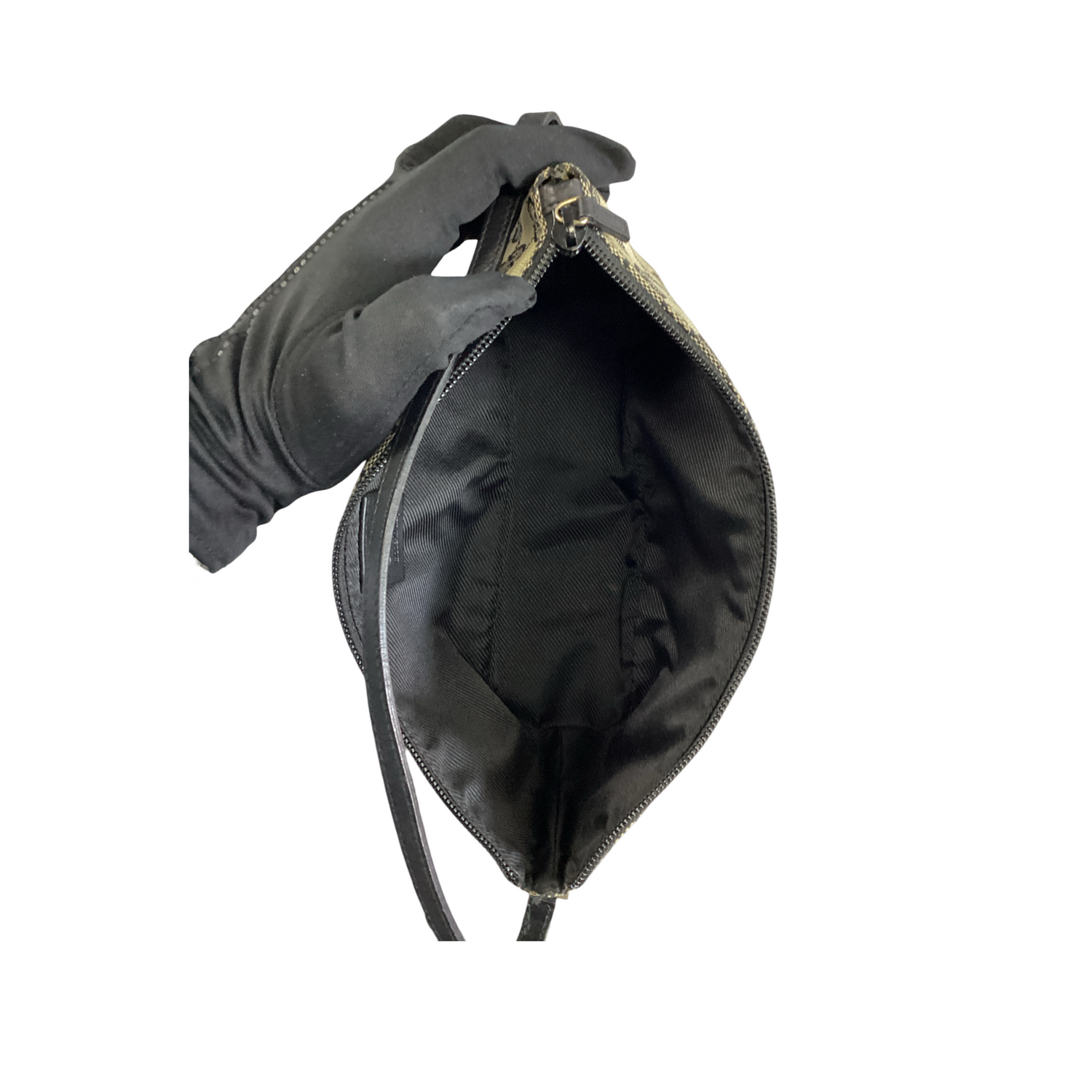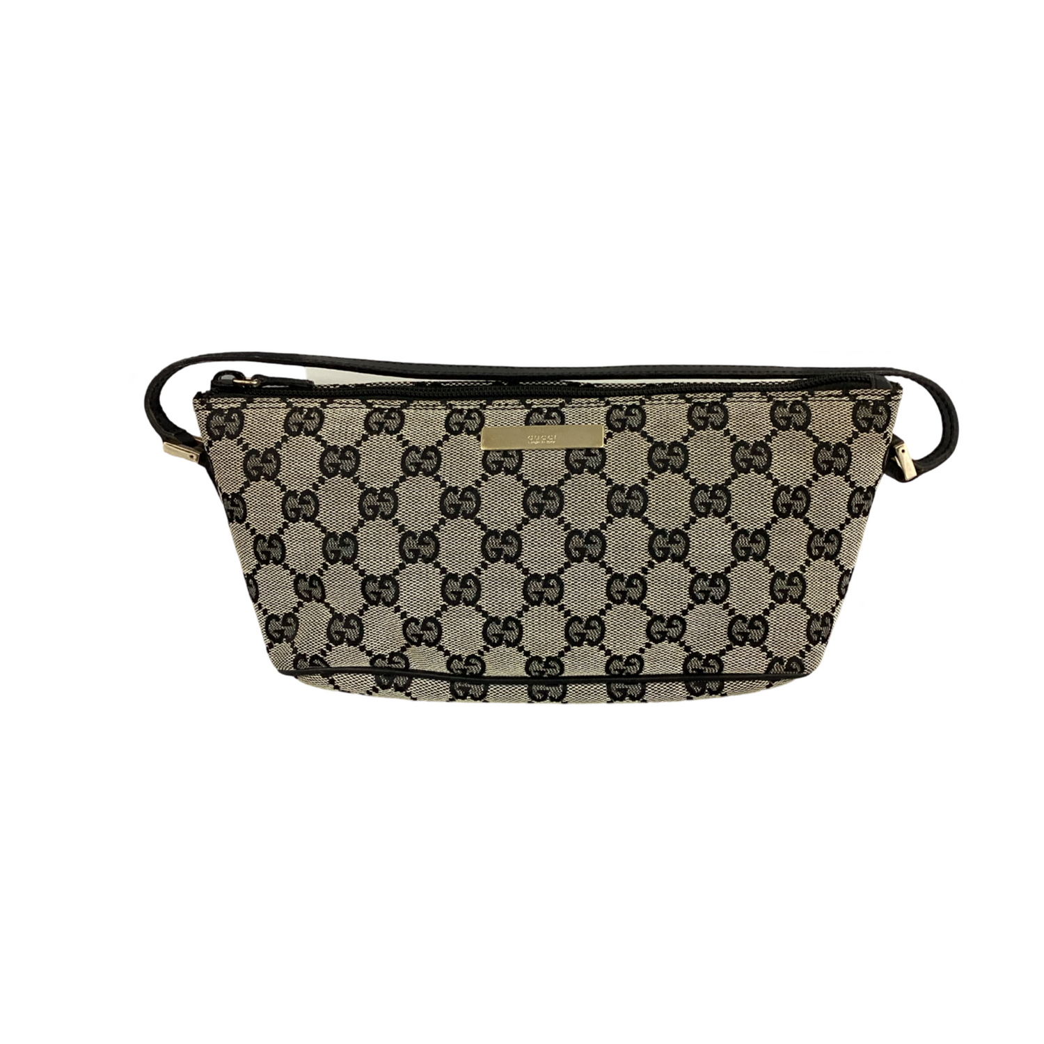 Gucci Black Monogram Boat Pochette silver hardware, crafted of Gucci GG brown on black monogram canvas, a black leather wrist strap and top zipper closure. Interior features a black fabric interior.