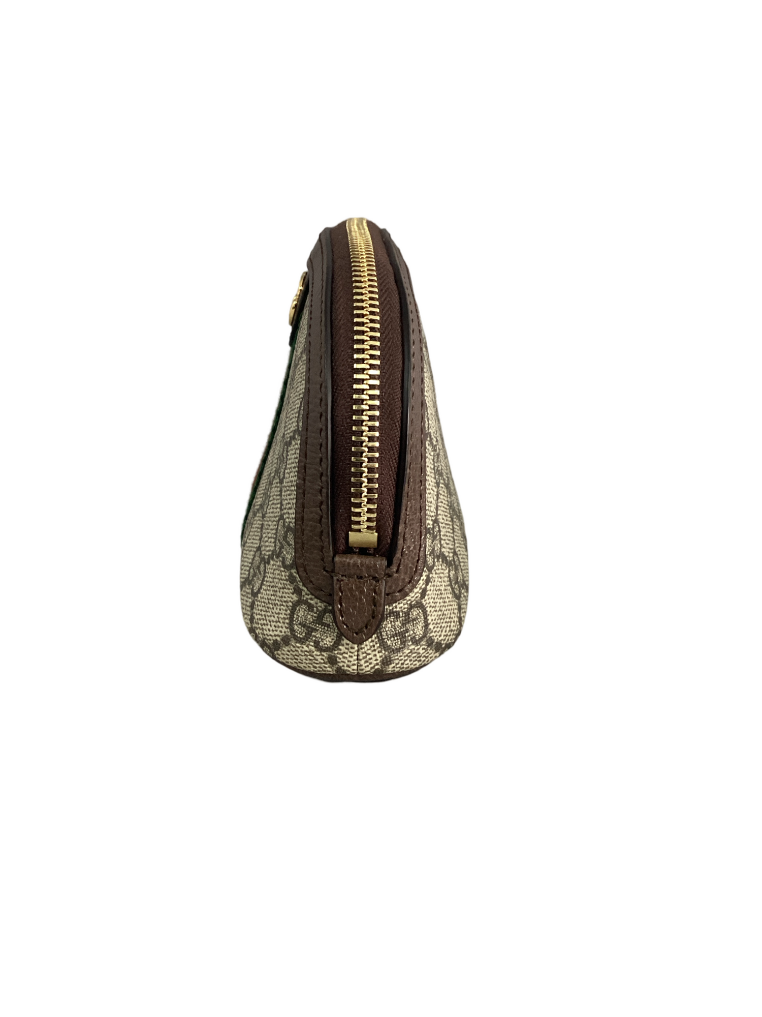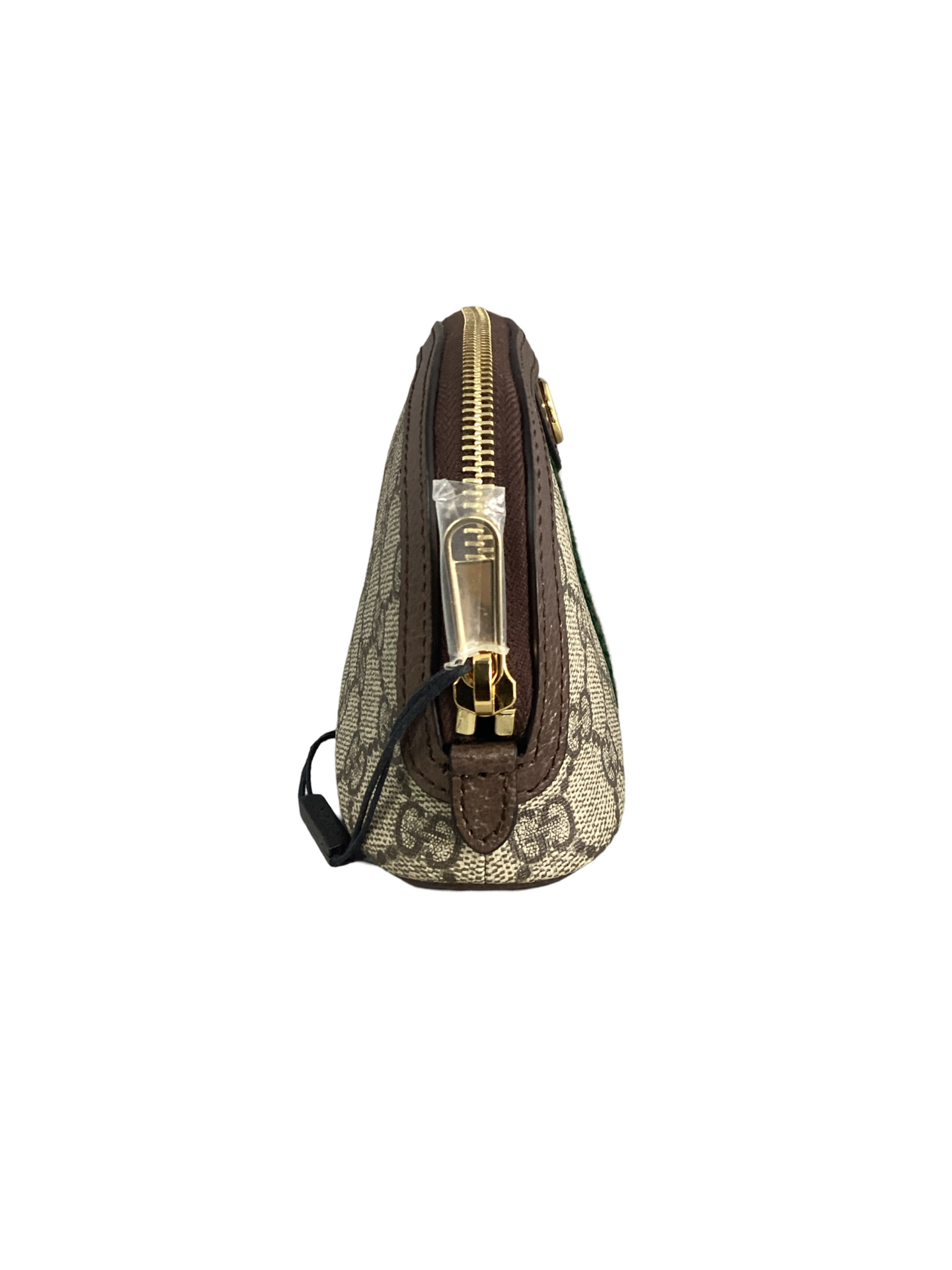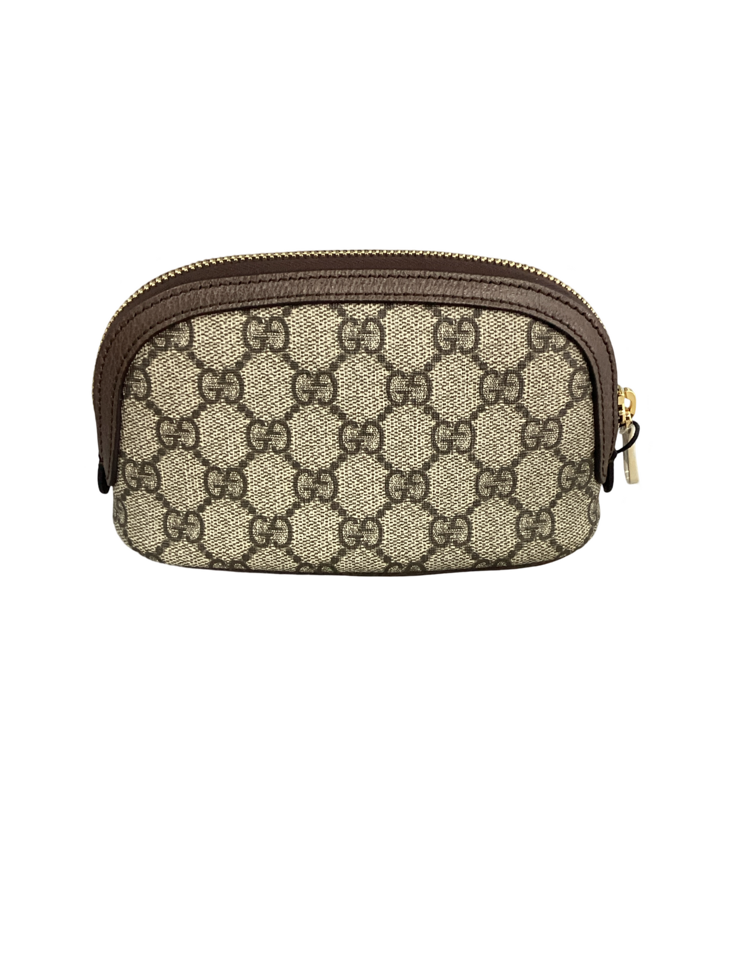 Gucci Ophidia Medium Cosmetic Case with gold toned hardware, Beige/ebony GG Supreme canvas, with brown leather trim, top zipper closure. Interior features brown fabric lining.
