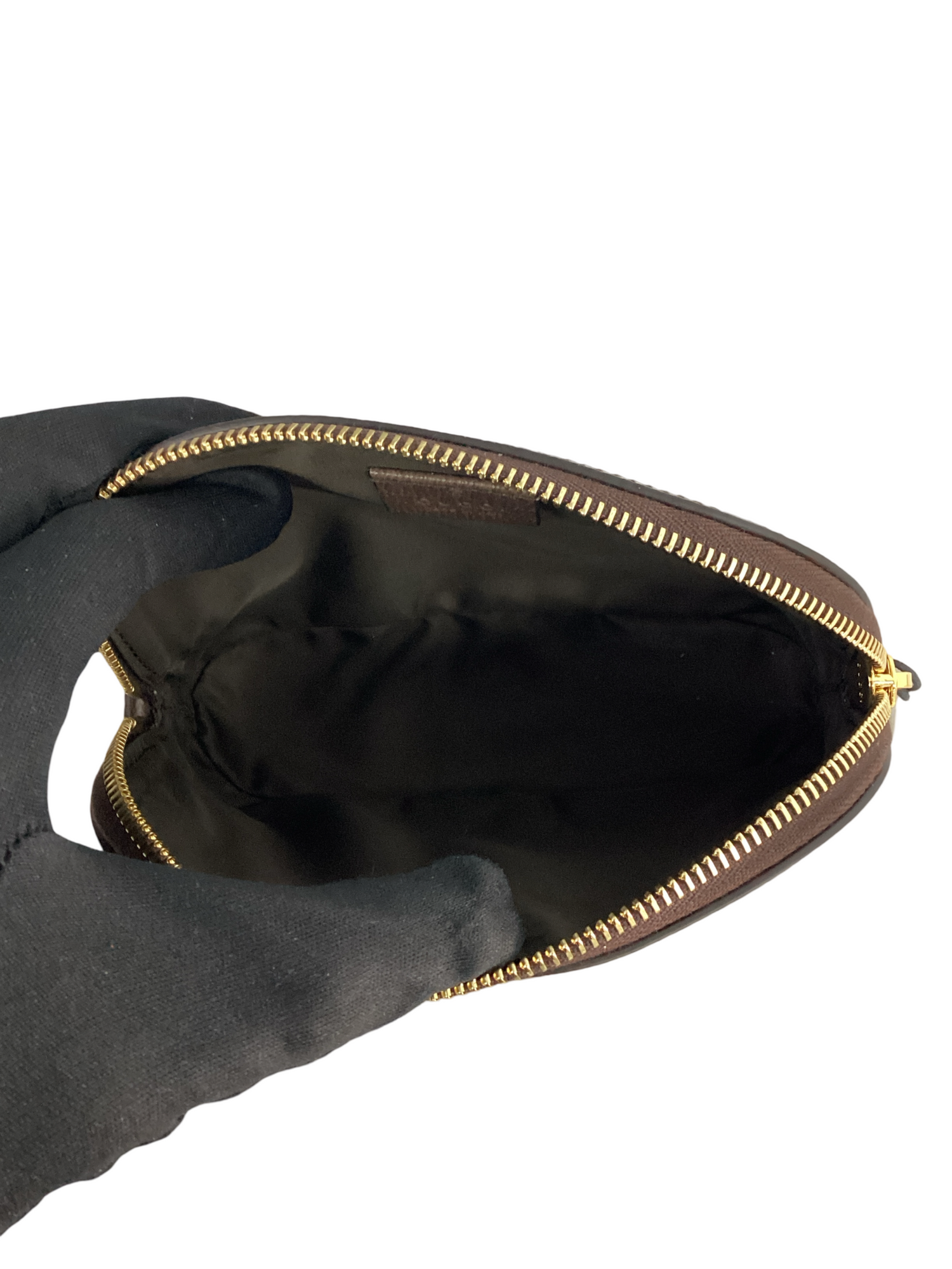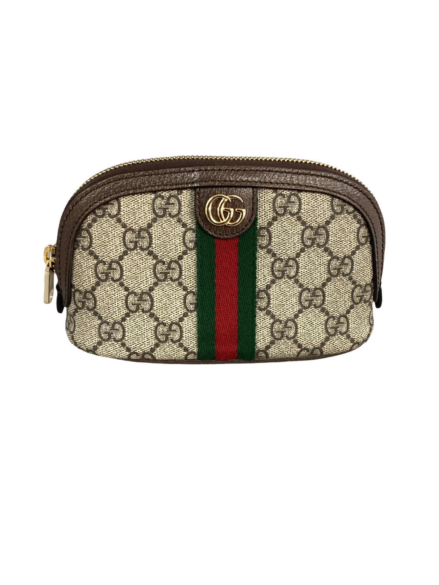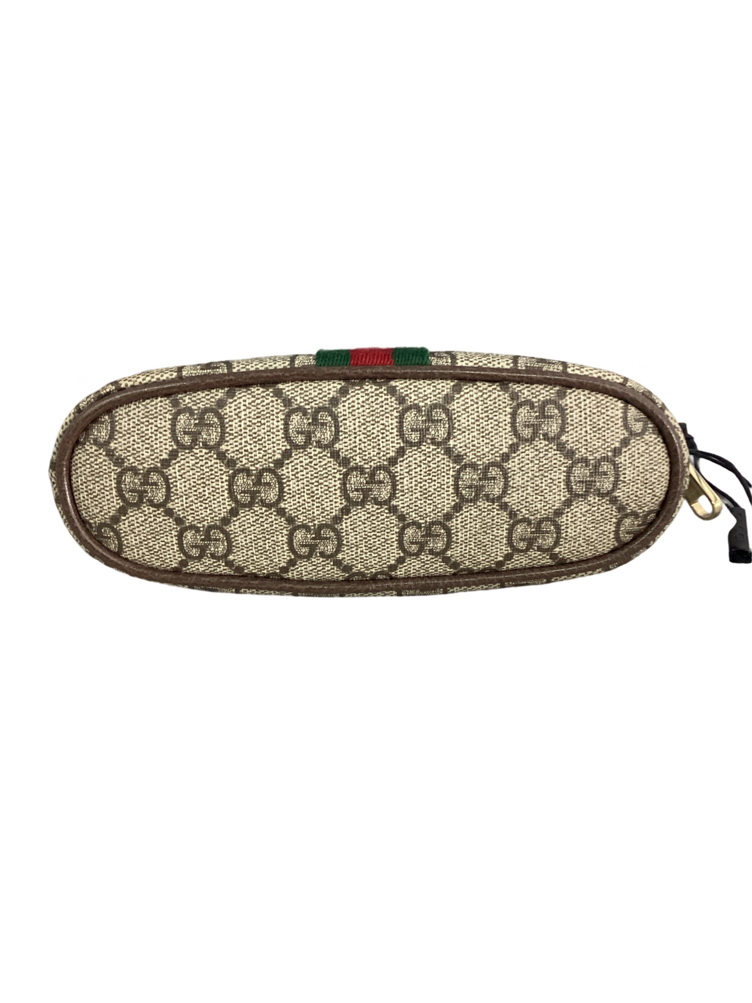 Gucci Ophidia Medium Cosmetic Case with gold toned hardware, Beige/ebony GG Supreme canvas, with brown leather trim, top zipper closure. Interior features brown fabric lining.