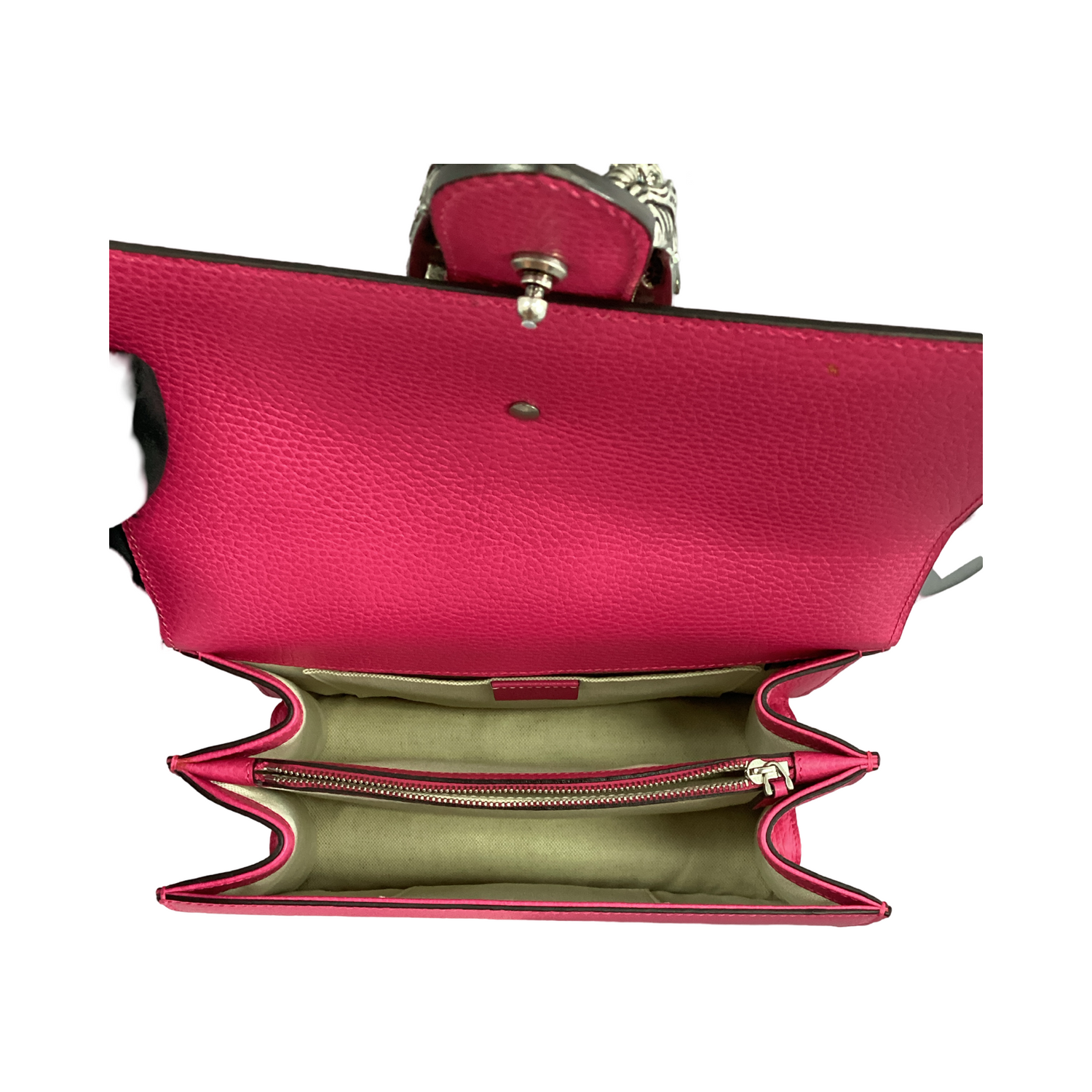 Gucci-Pink Dollar Calfskin Crystal Web Med Dionysus Bamboo Top Handle with silver-toned hardware, crafted of textured calfskin leather in pink, a sturdy bamboo top handle and a prominent embellished tiger head horseshoe flap closure. Interior features a natural fabric partitioned interior with patch pockets and a central zipper compartment.