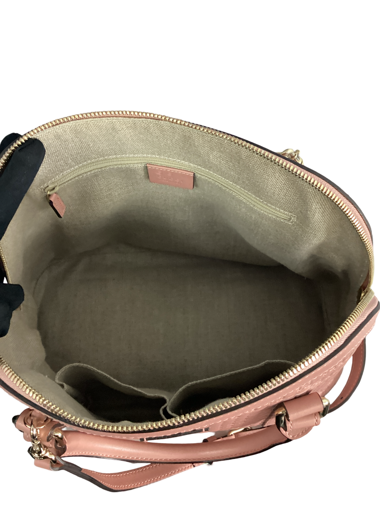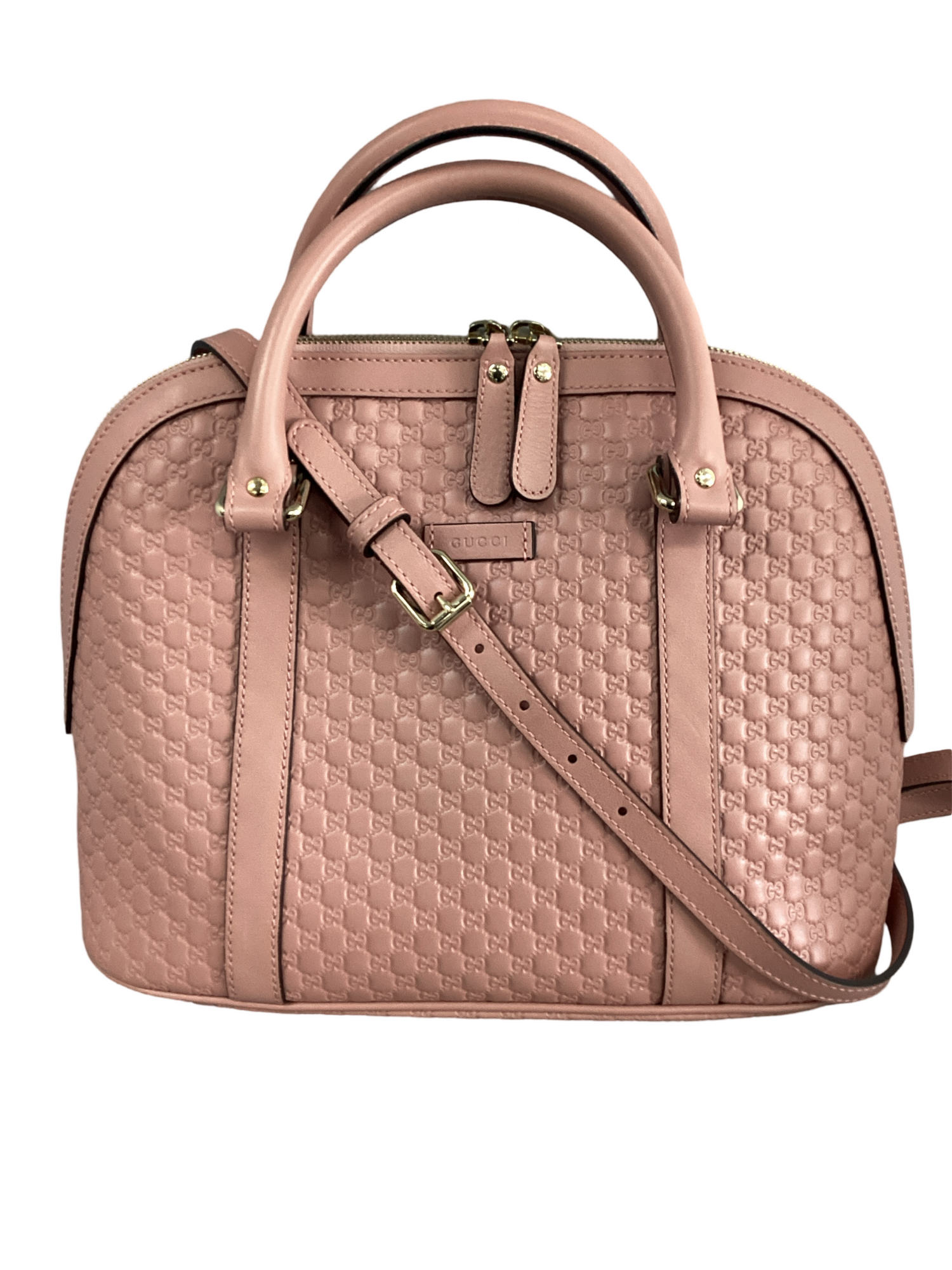 Gucci Pink Medium Microguccissima Dome Bag with gold-toned hardware, embossed microguccissima leather in pink, leather top handles, an optional adjustable shoulder strap and top zipper closure. Interior features a beige fabric interior with slip pockets and a zipper pocket.