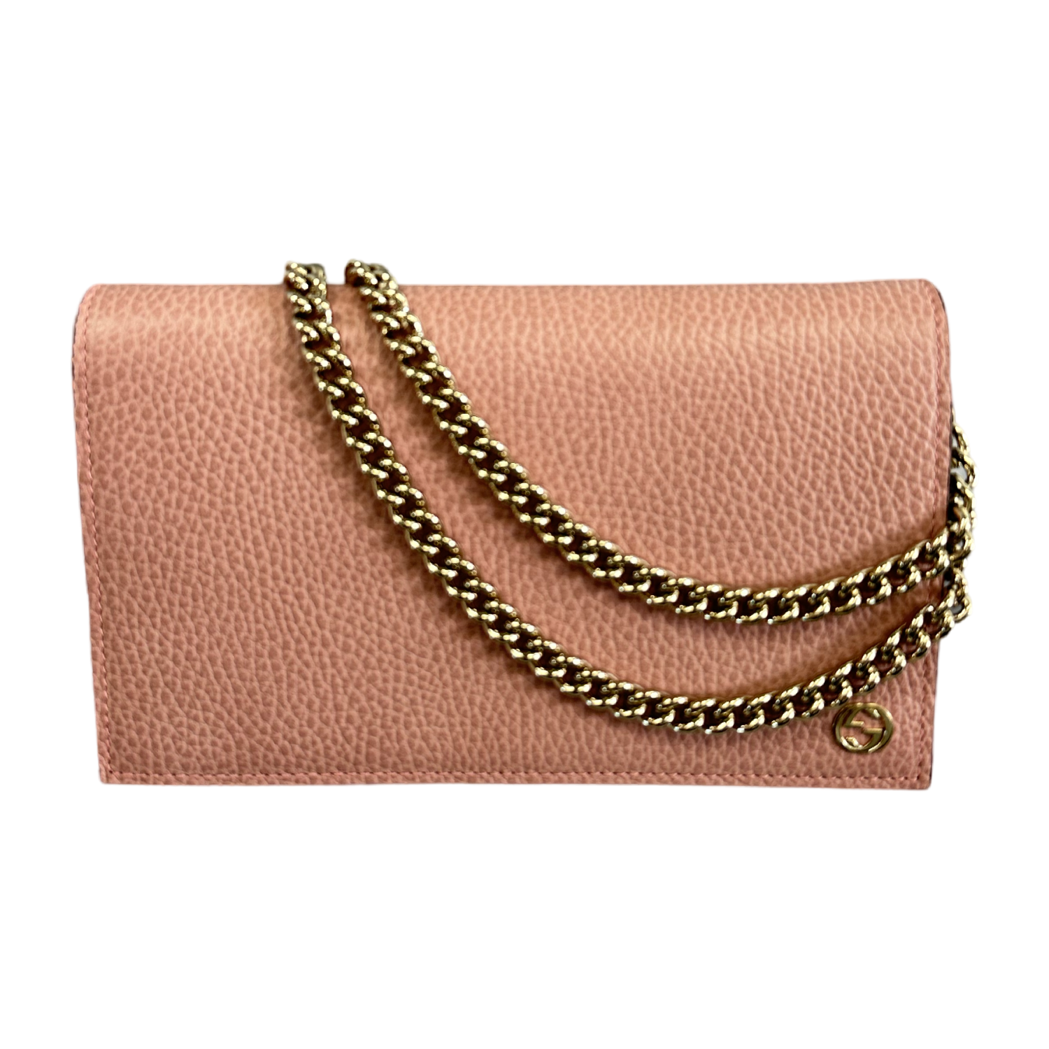 Gucci Soft Pink Wallet on Chain with gold-toned hardware, is crafted of lovely textured calfskin leather in beige, a gold chain shoulder strap that may be removed to allow the bag to be used as a stylish clutch, the front crossover flap features an interlocking gold GG logo. Interior features a leather interior that features two card slot panels for 10 cards, a zipper currency compartment.