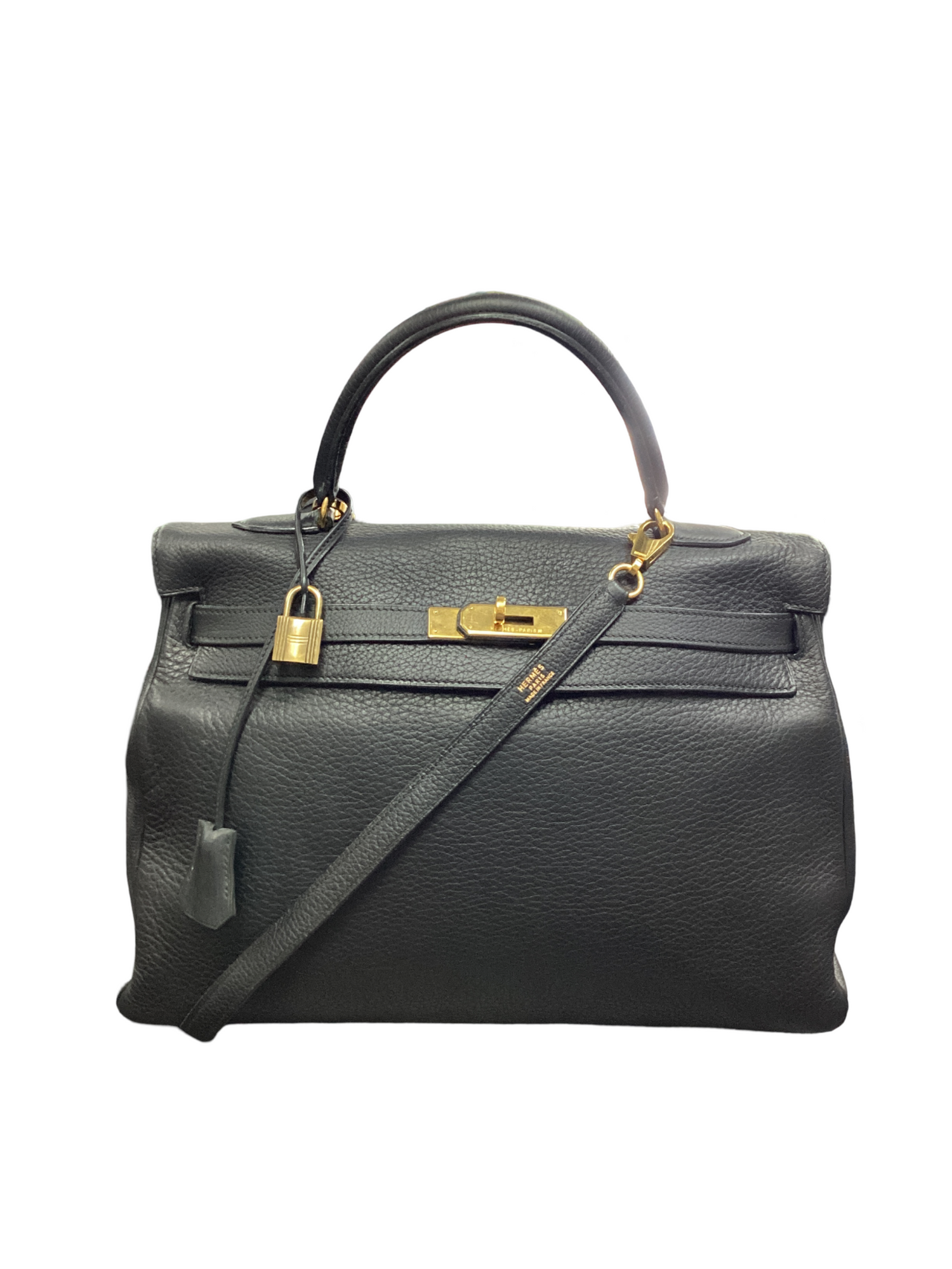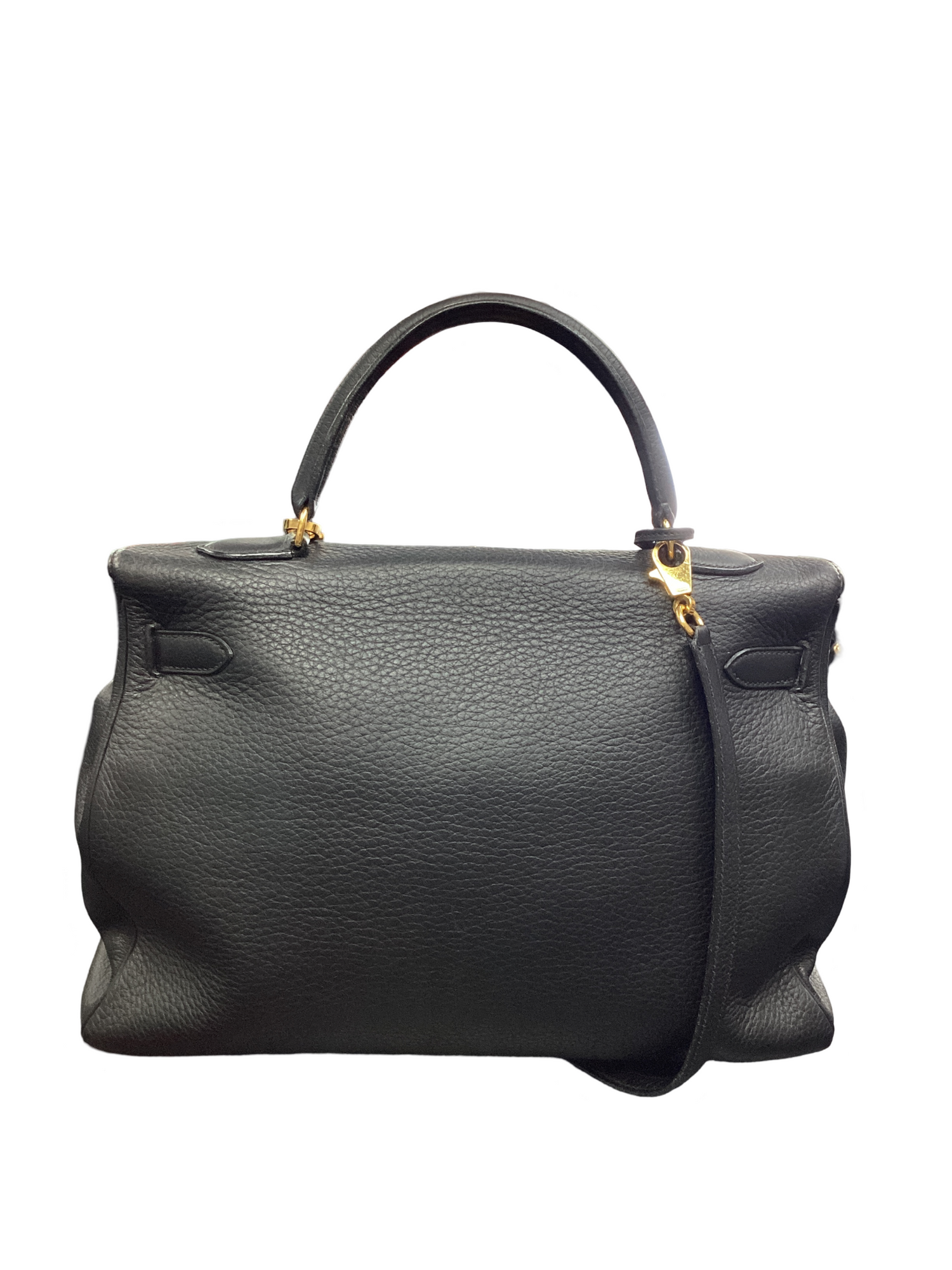 Hermes black Kelly Togo Retourne 35 with gold-tone hardware, single rolled top handle, detachable shoulder strap, turn lock closure at top. Interior features include black leather lining, 1 zipper pocket, 2 slip pockets.