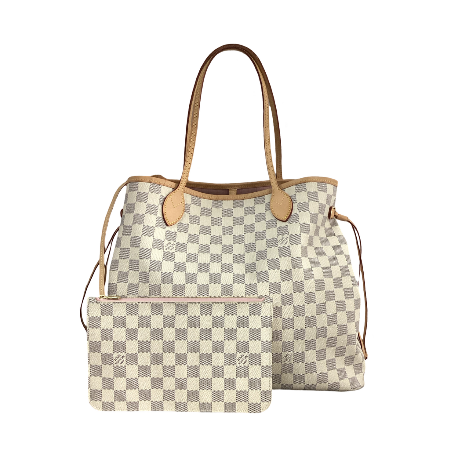 Louis Vuitton Azure Neverfull GM with Pouch with gold-tone hardware, two leather shoulder straps, clasp closure. Interior features include a canvas azure leather pouch, pink canvas lining with interior zipper pocket.