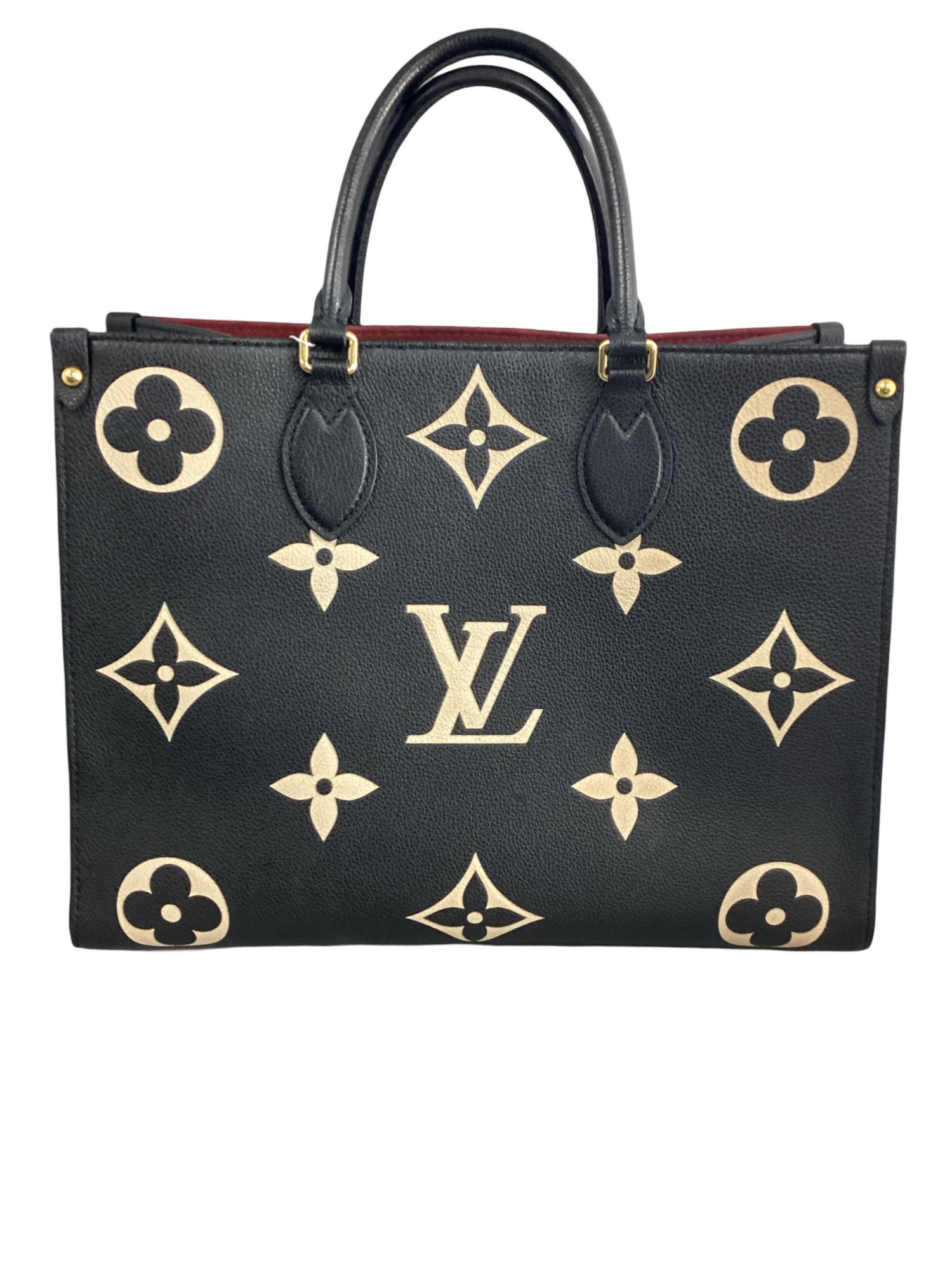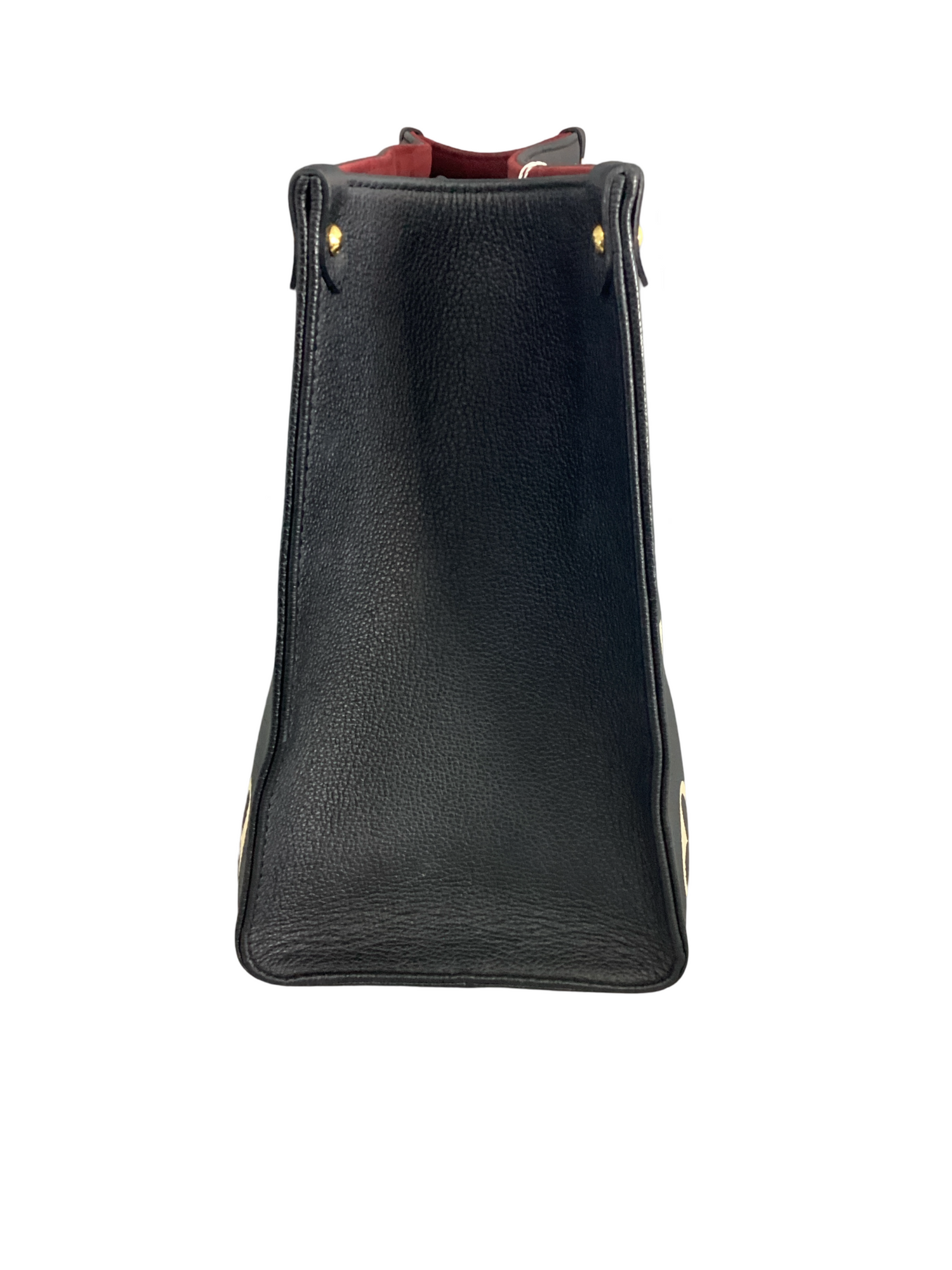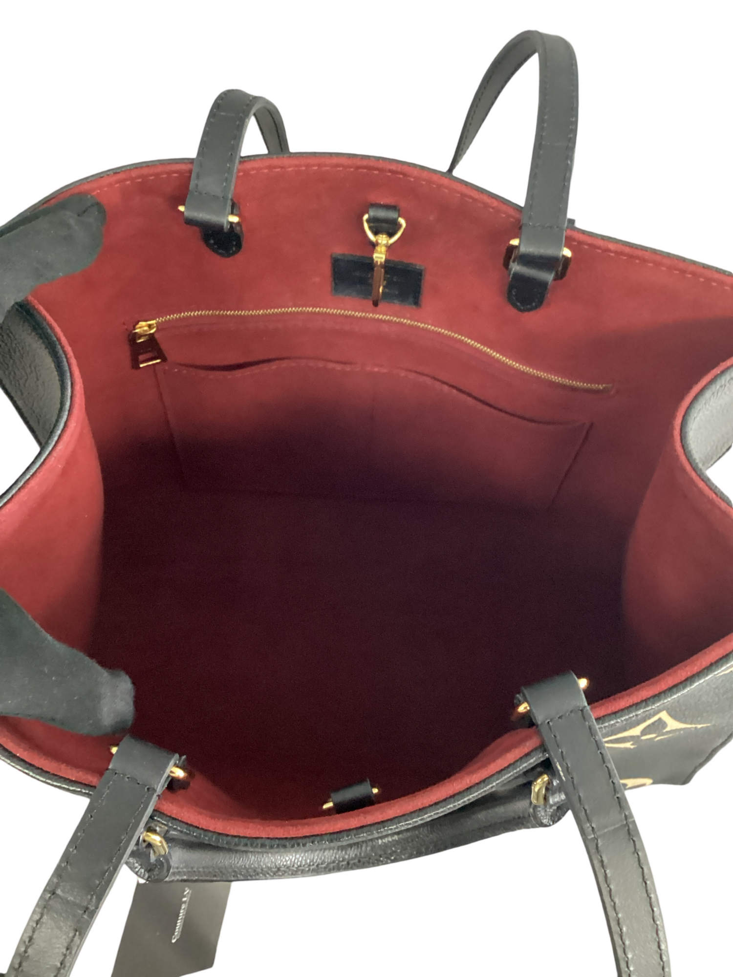 Louis Vuitton Bicolor Empreinte OnTheGo MM with gold-toned hardware, limited edition tote is crafted of oversized Louis Vuitton monogram print embossed on black calfskin leather, rolled leather dual top handles, long dual shoulder straps, and top is open and can be secured across with a hook clasp. Interior features a spacious red microfiber interior with 2 slip pockets and a zipper pocket.