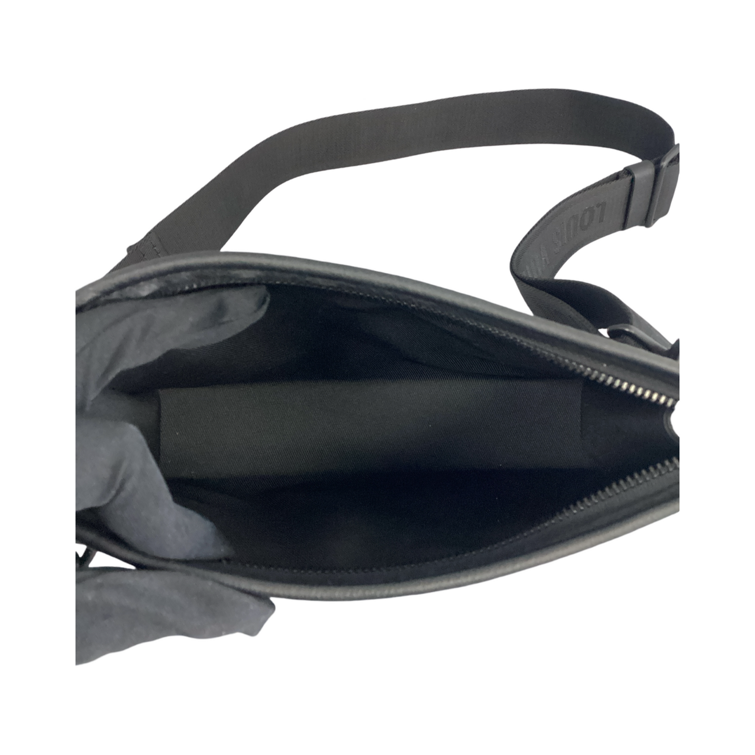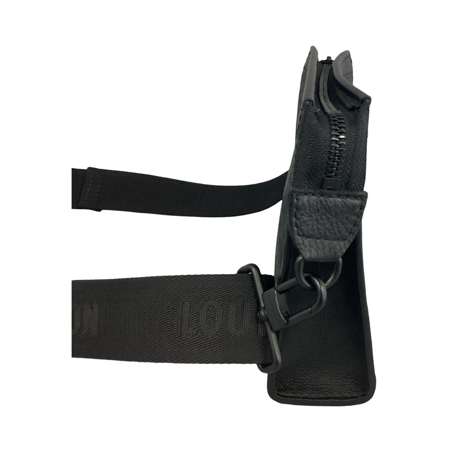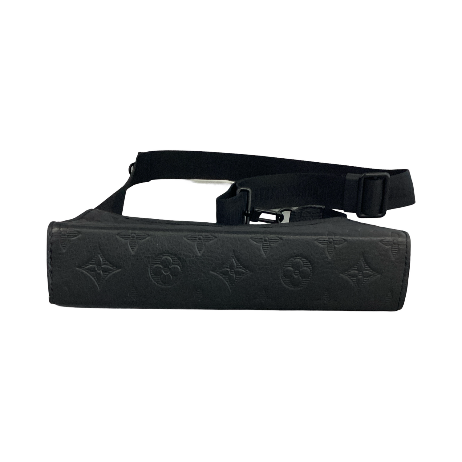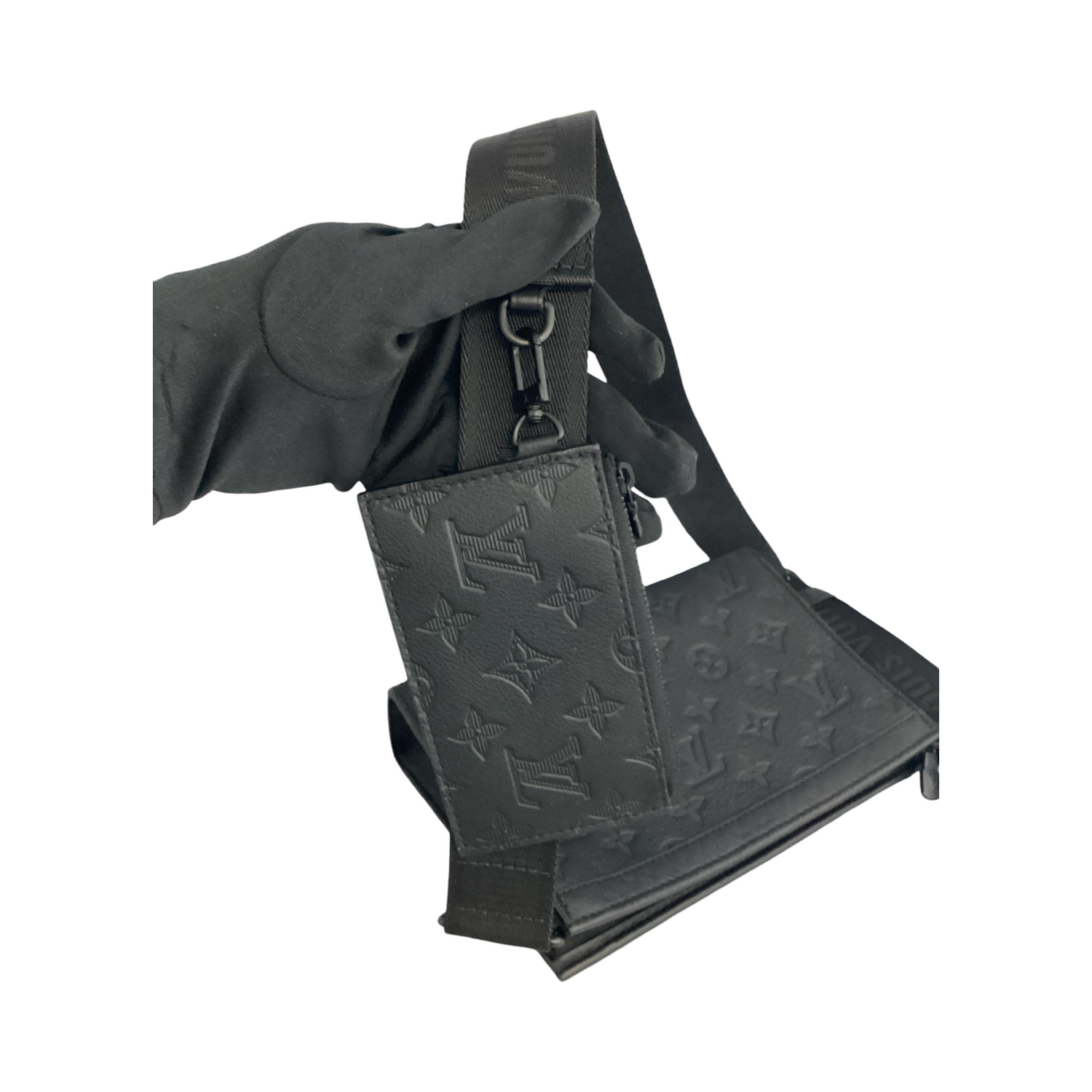 Louis Vuitton Black Empreinte Gaston Wearable Wallet with black toned hardware, a small shoulder bag is crafted of empreinte leather, a black leather trim, an adjustable nylon shoulder strap, and a removable coin pouch in matching empreinte leather. Interior features a black fabric interior.