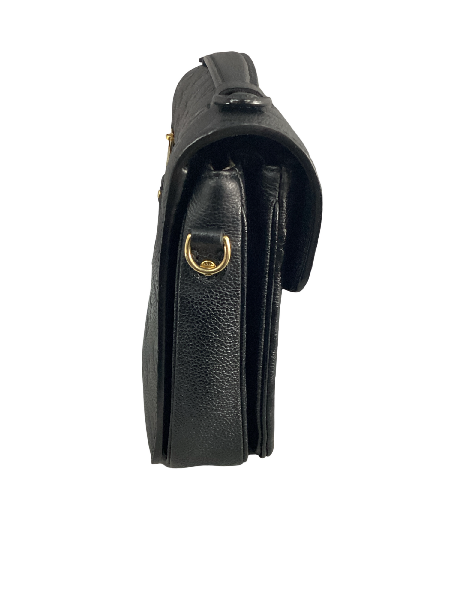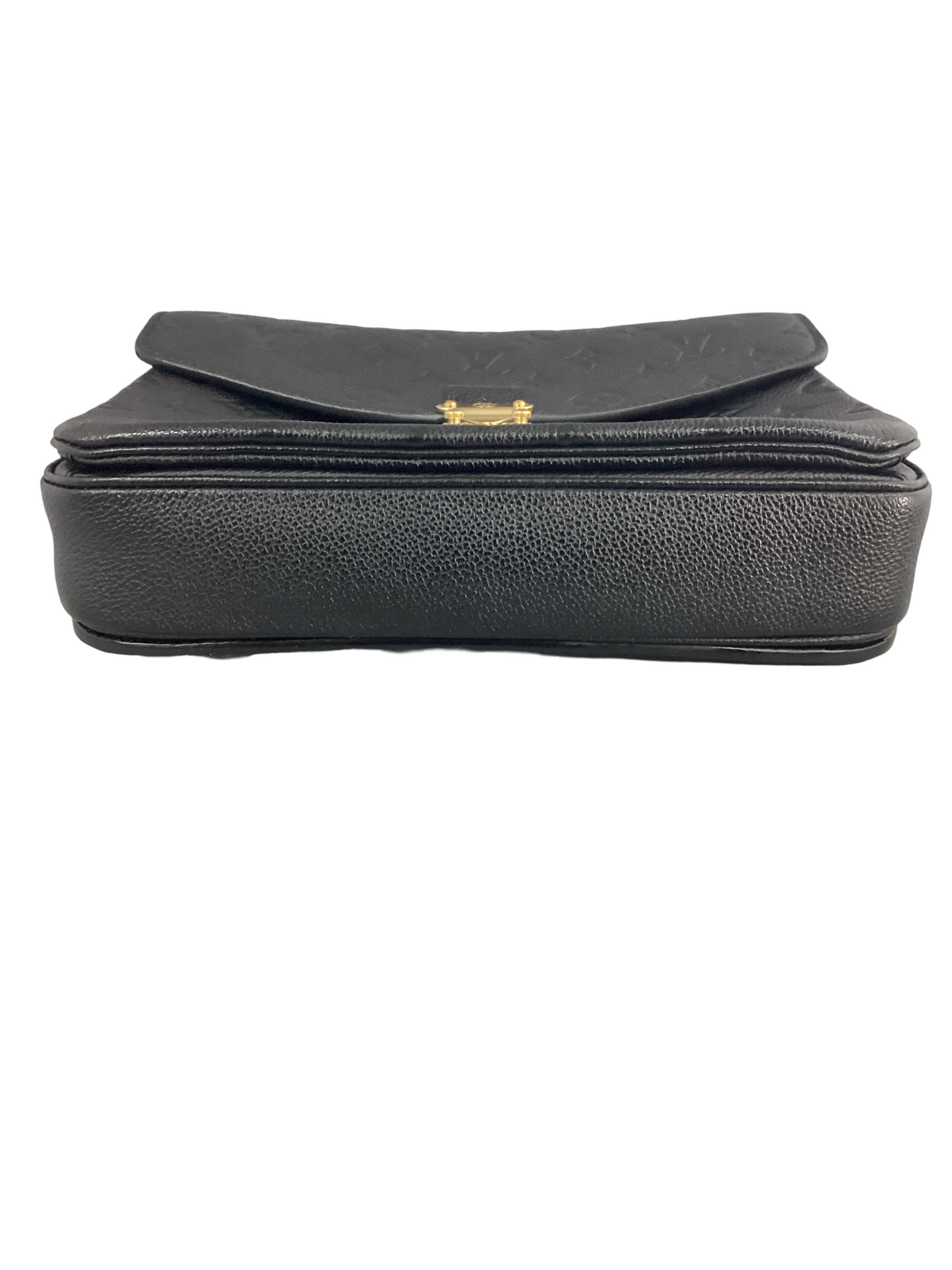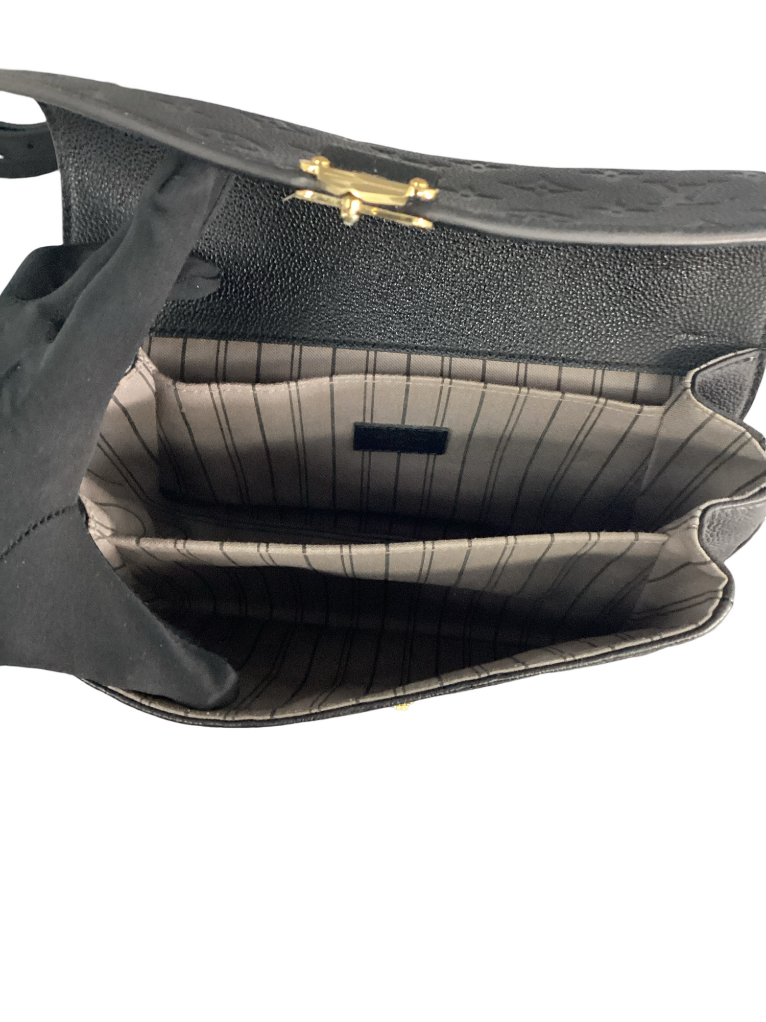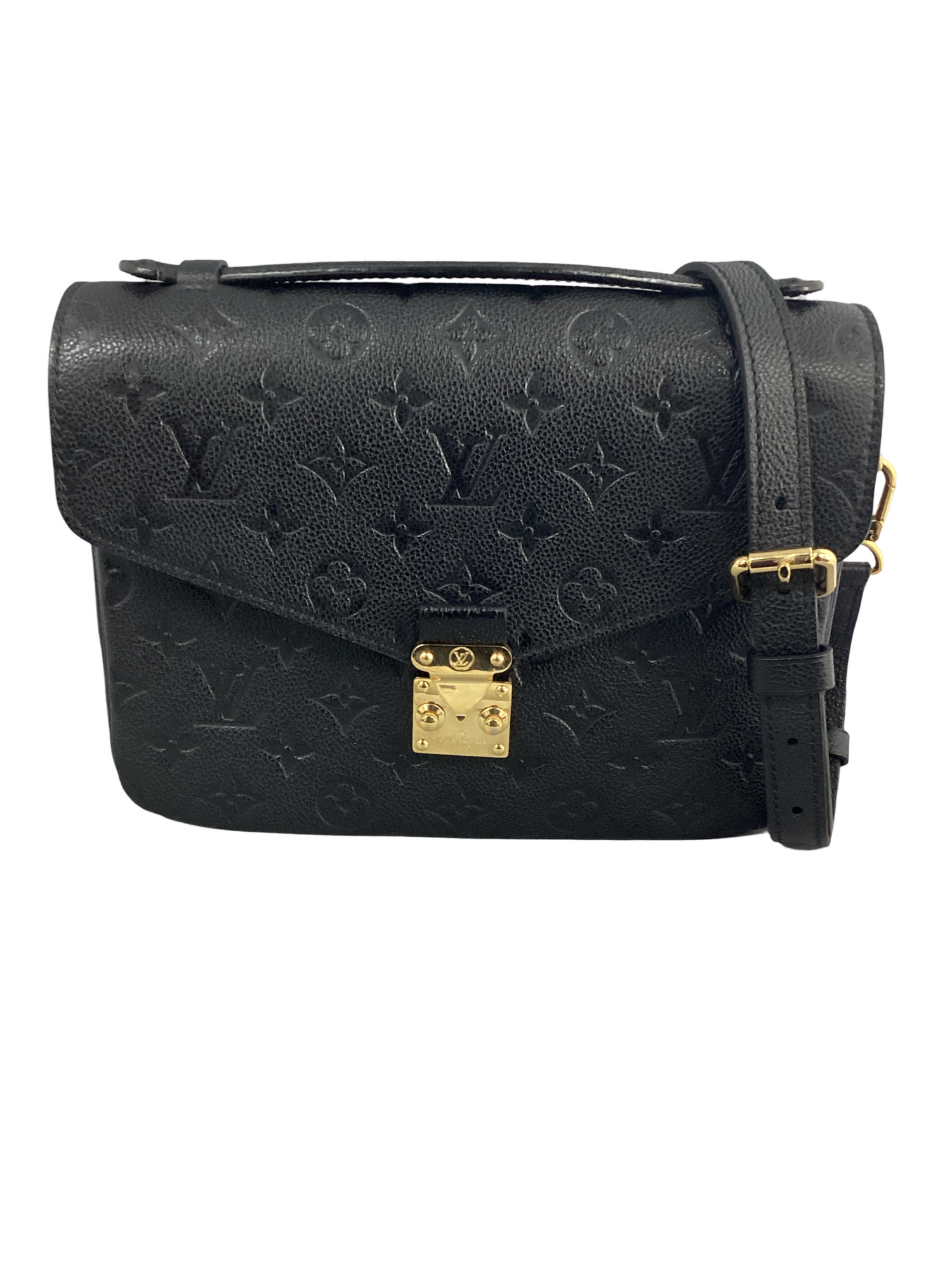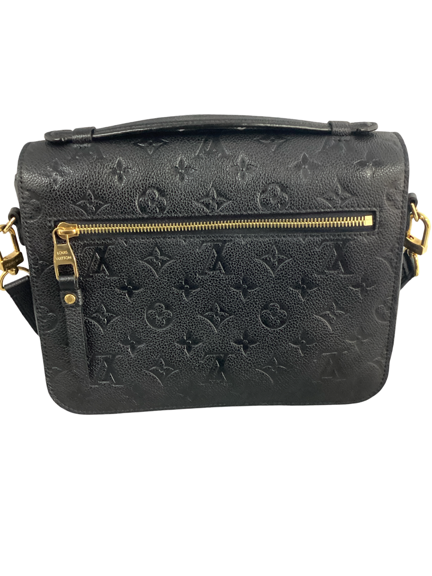 Louis Vuitton Black Empreinte Pochette Metis with gold-toned hardware, crafted of a black monogram embossed leather, a back zipper pocket, a leather top handle and an adjustable detachable strap, with a snap lock closure. Interior features a gray striped fabric interior, two compartments and back slip pocket.