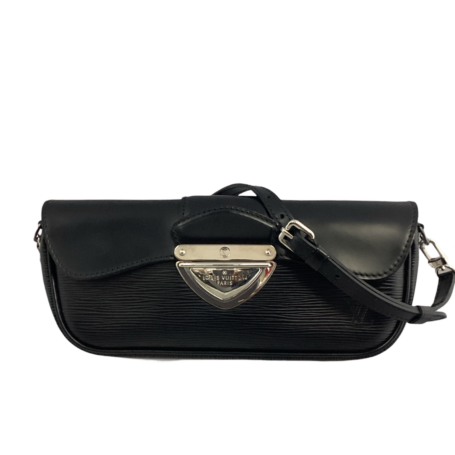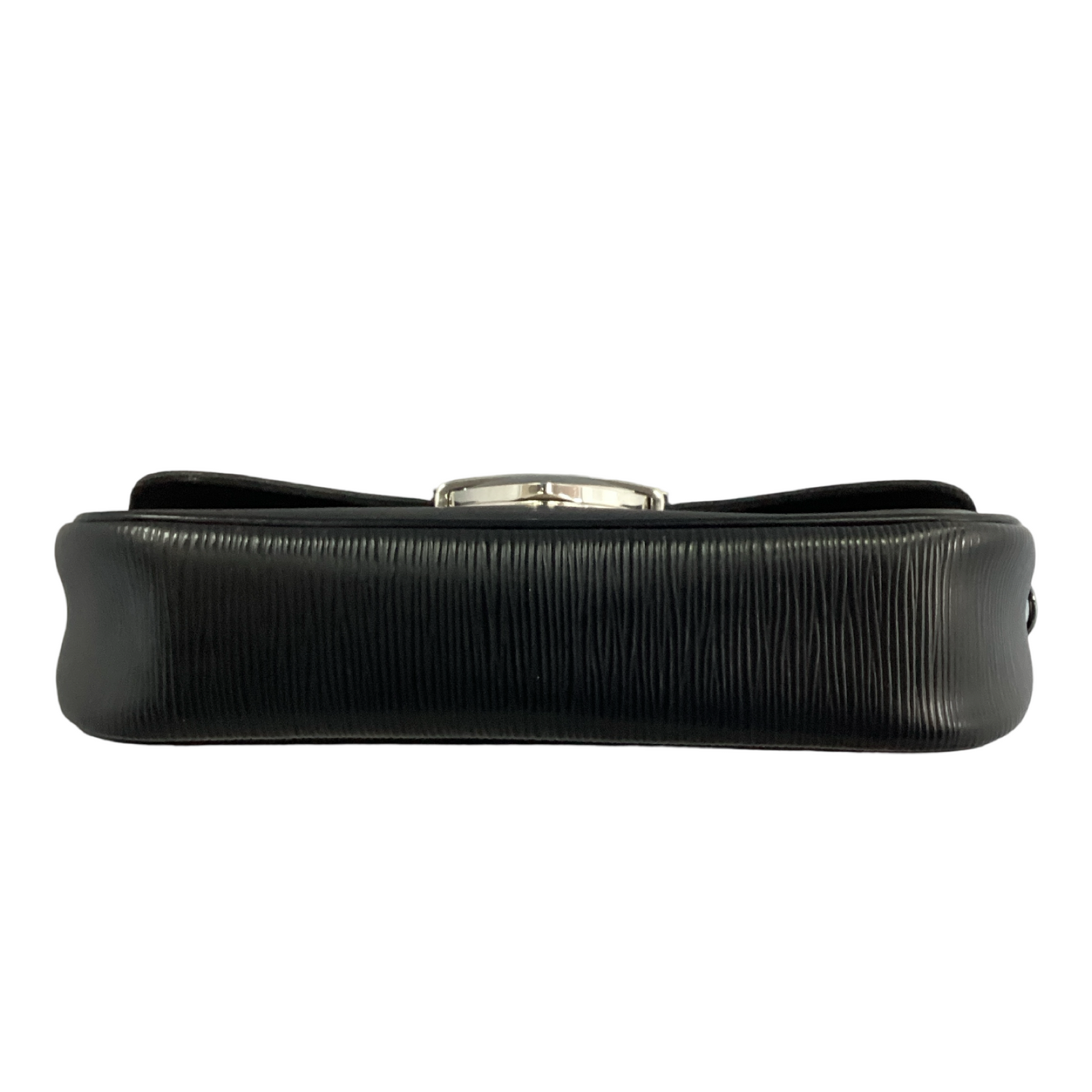 Louis Vuitton-Black Epi Leather Montaigne Shoulder Bag/Clutch with silver-toned, hardware, a stylish baguette is crafted of Louis Vuitton signature textured epi leather in black, a looping flat leather adjustable and detachable shoulder strap and a polished silver press lock. Interior features a matching microfiber interior with a pocket.