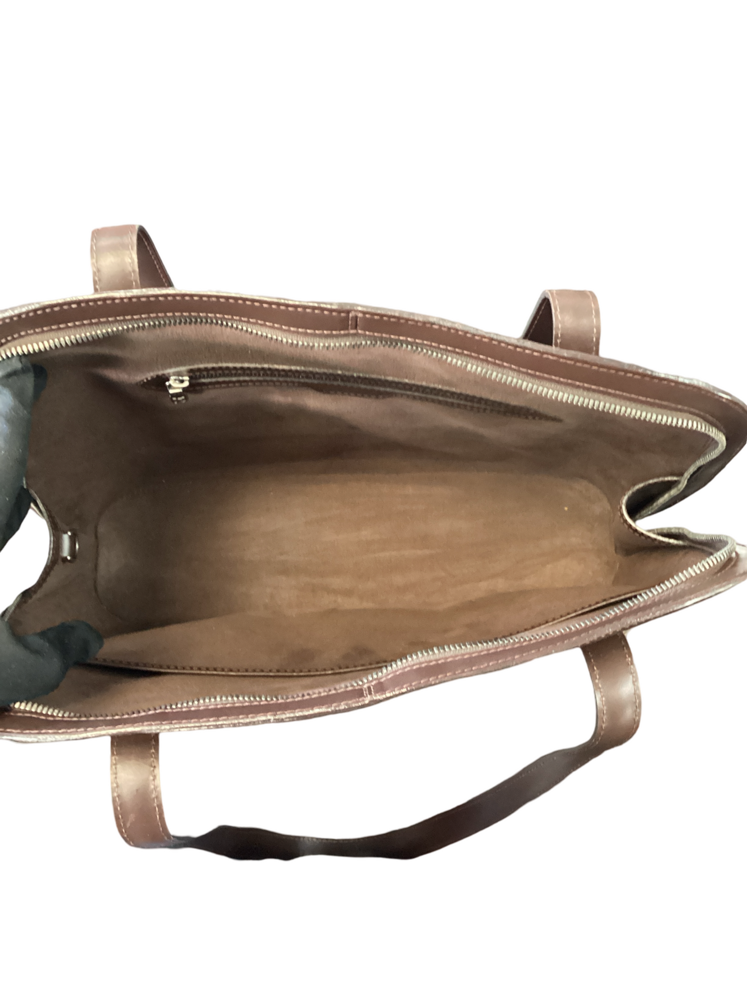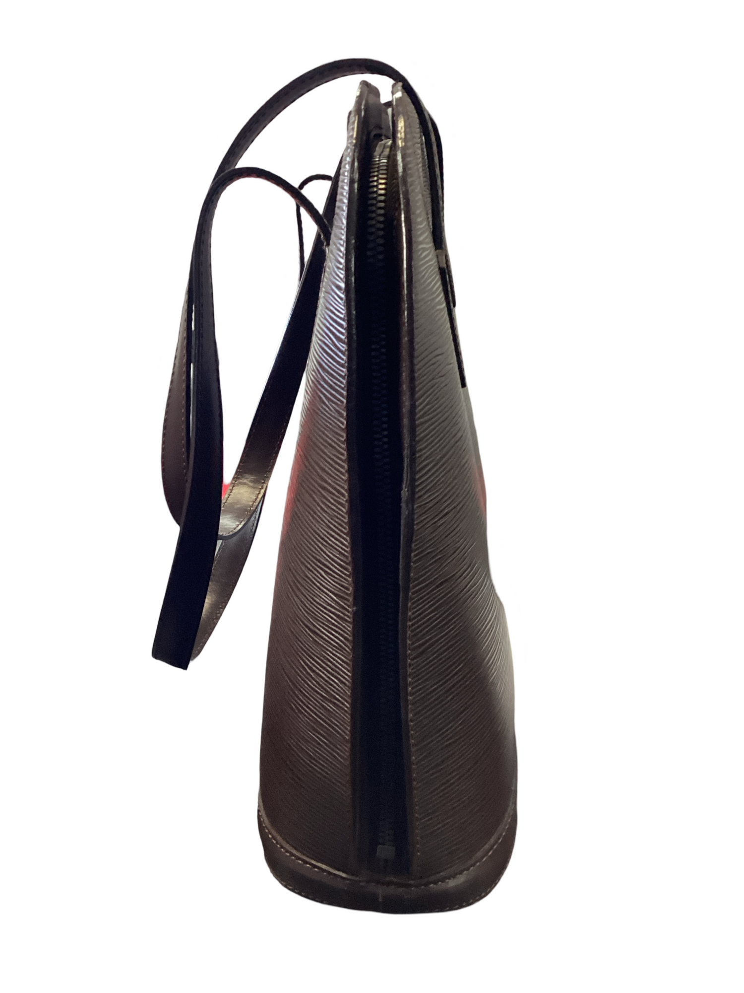 Louis Vuitton brown Epi Lussac Shoulder Bag with silver-tone hardware, dual shoulder straps, zipper closure. Interior features include brown suede lining, 1 zipper pocket, 1 slip pocket.