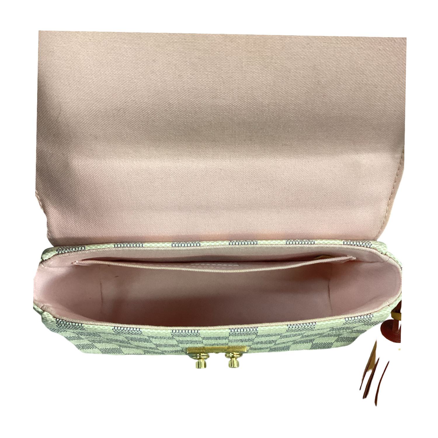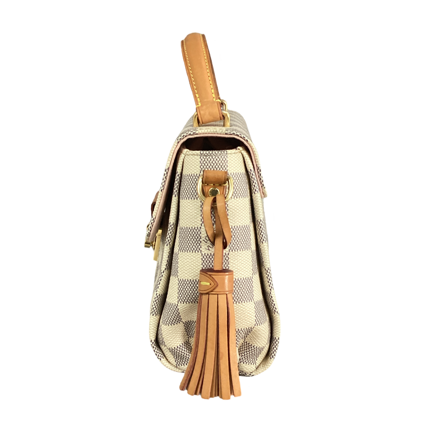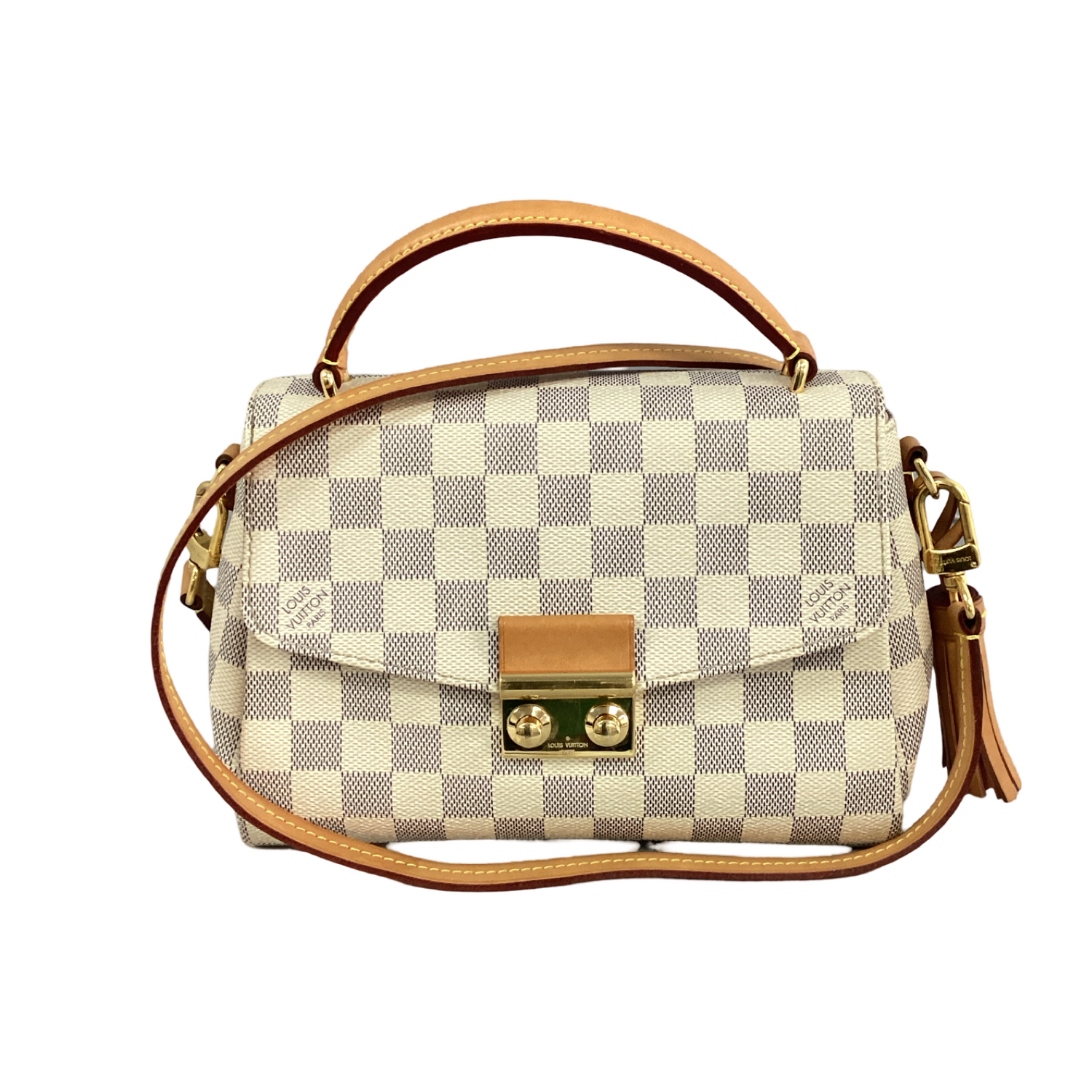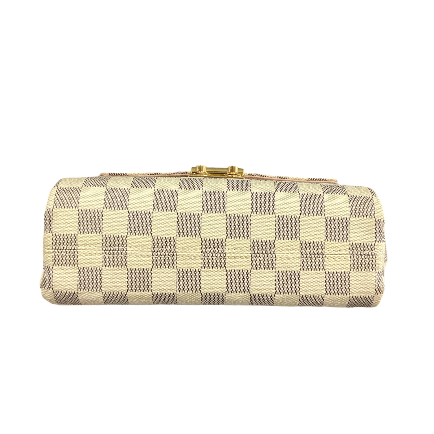 Louis Vuitton-Damier Azur Croisette with gold-tone hardware, single top handle, single detachable adjustable shoulder strap, push lock closure. Interior features include pink canvas lining, 1 slip pocket.