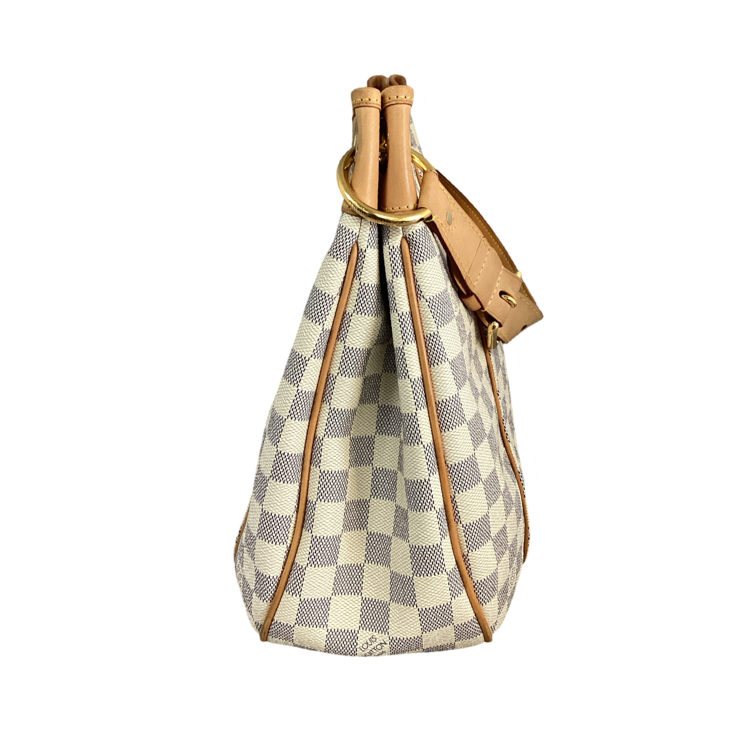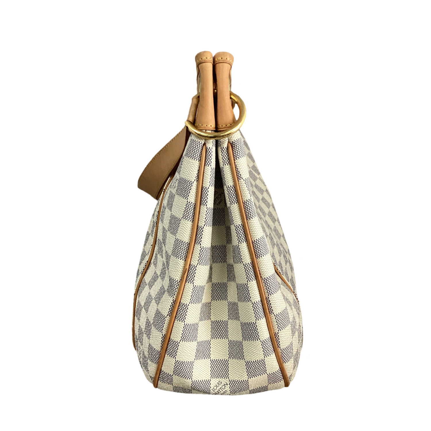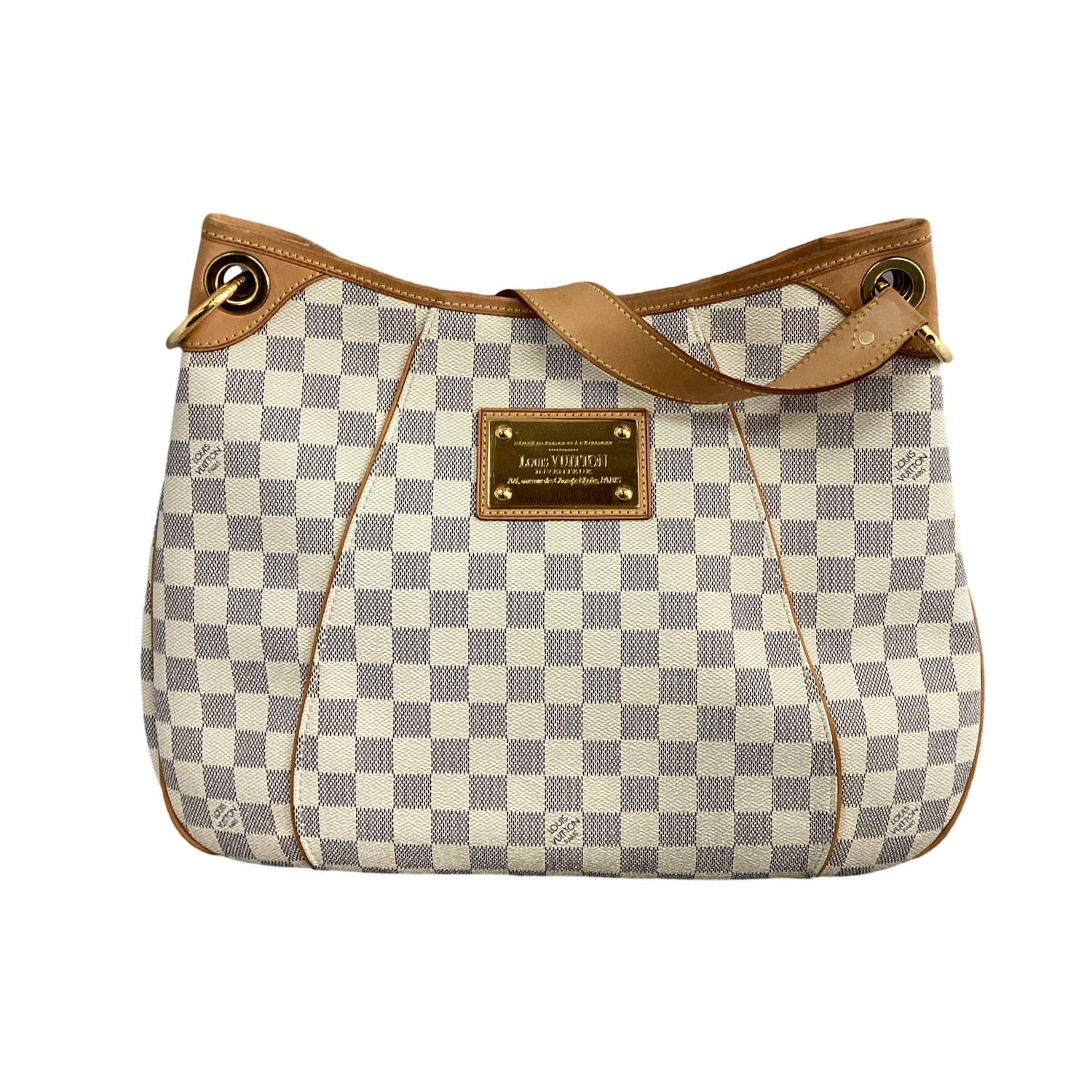 Louis Vuitton-Damier Azur Galliera PM with gold-toned hardware, hobo-style handbag is crafted of Louis Vuitton's canvas in checkered Azur. It features a vachetta cowhide leather shoulder strap and snap top closure. Interior features a beige microfiber interior with a large snap pocket and slip pockets.