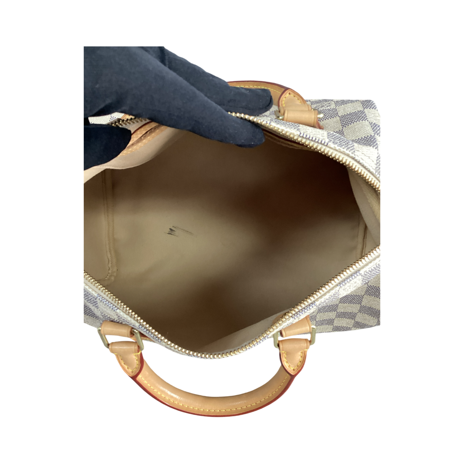 Louis Vuitton-Damier Azur Speedy 30 with gold-tone hardware, dual rolled top handles. Interior features include fabric lining.