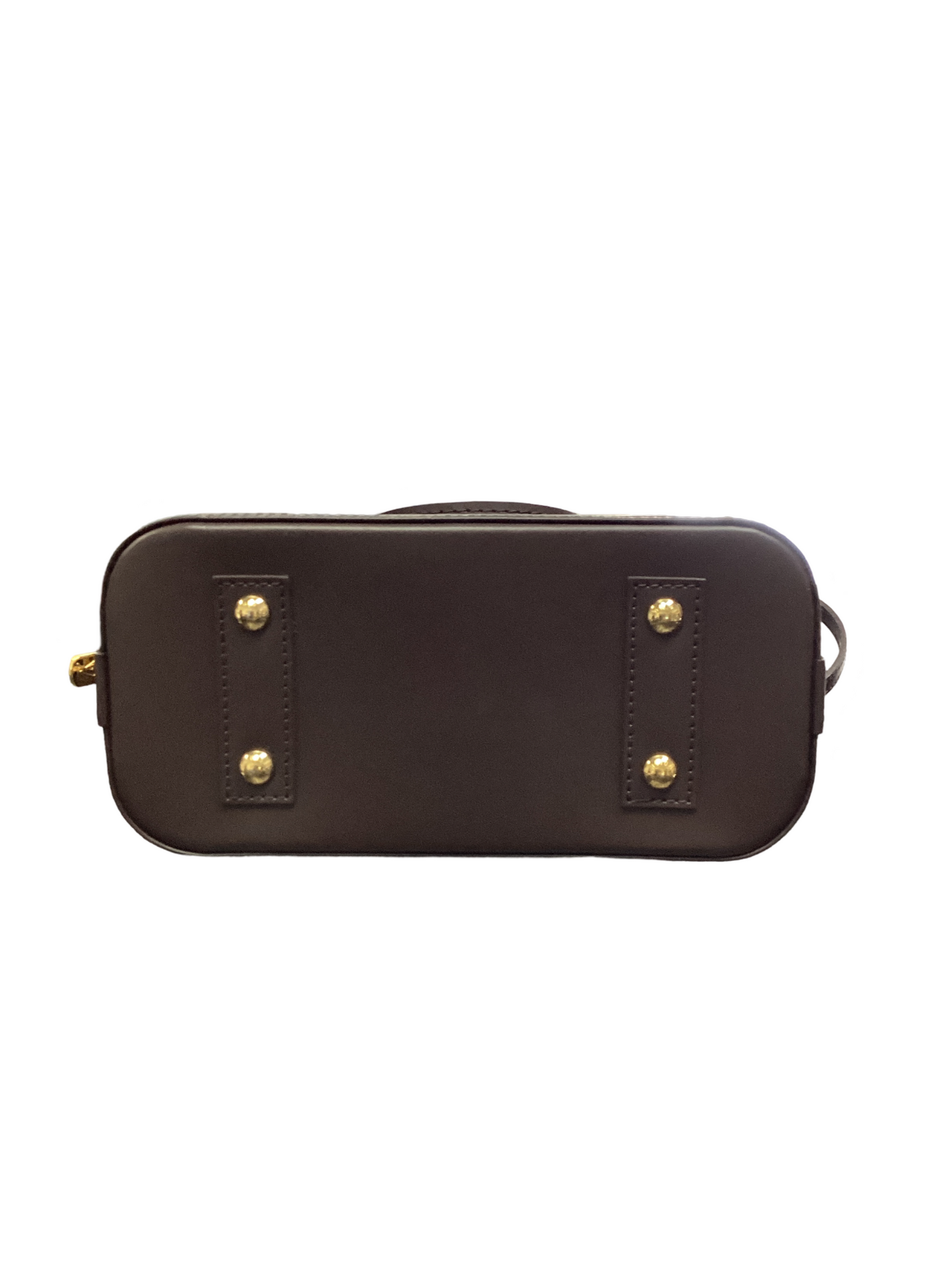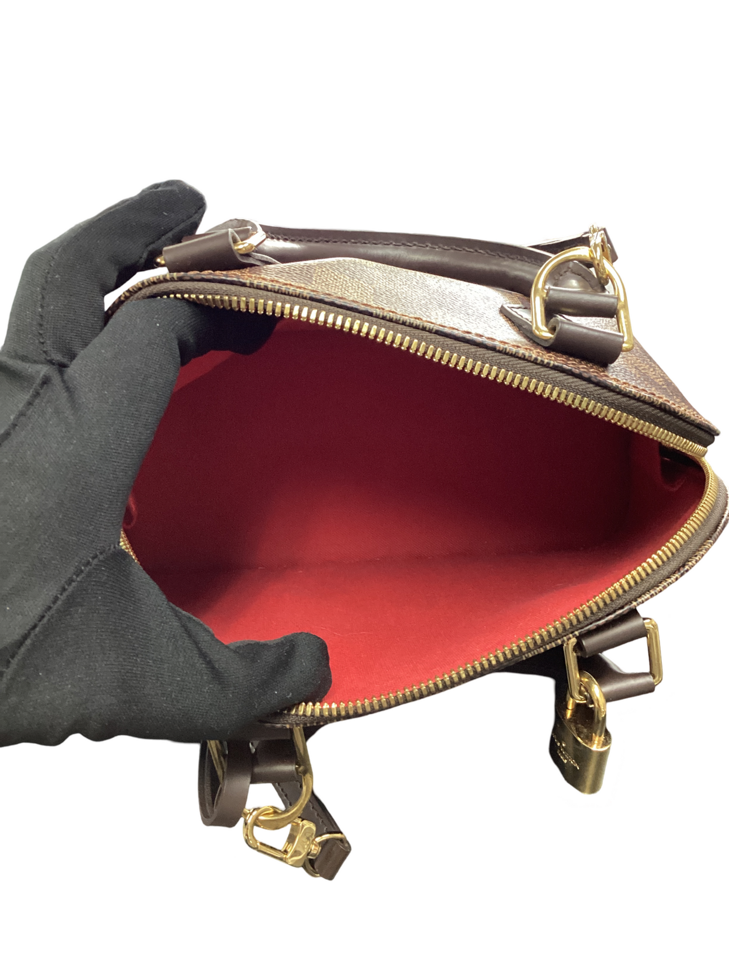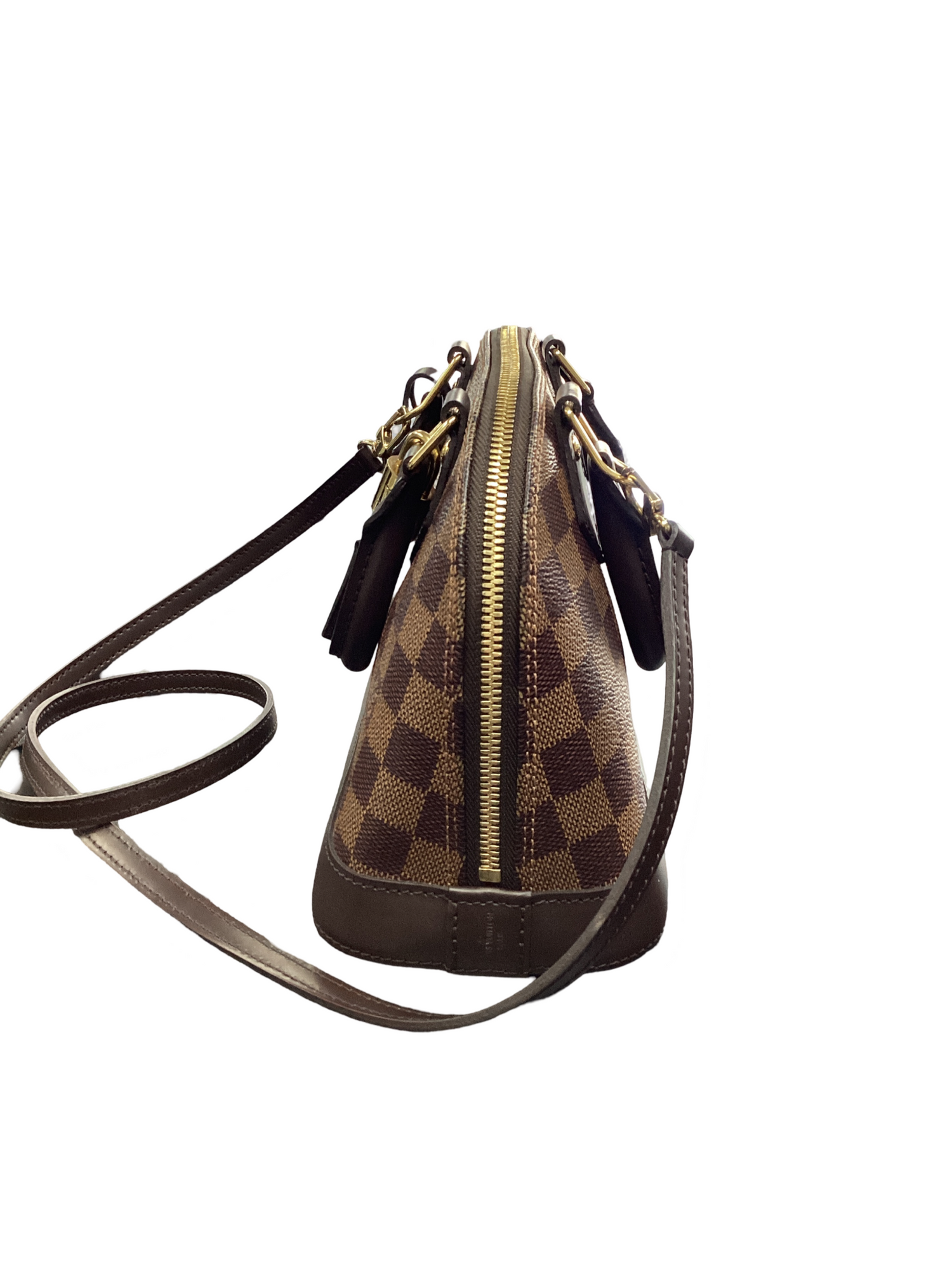 Louis Vuitton Damier Ebene Alma BB with gold-tone hardware, Ebene canvas leather, dual rolled top handles, single detachable adjustable shoulder strap, zipper closure. Interior features include red canvas lining, 1 slip pocket.