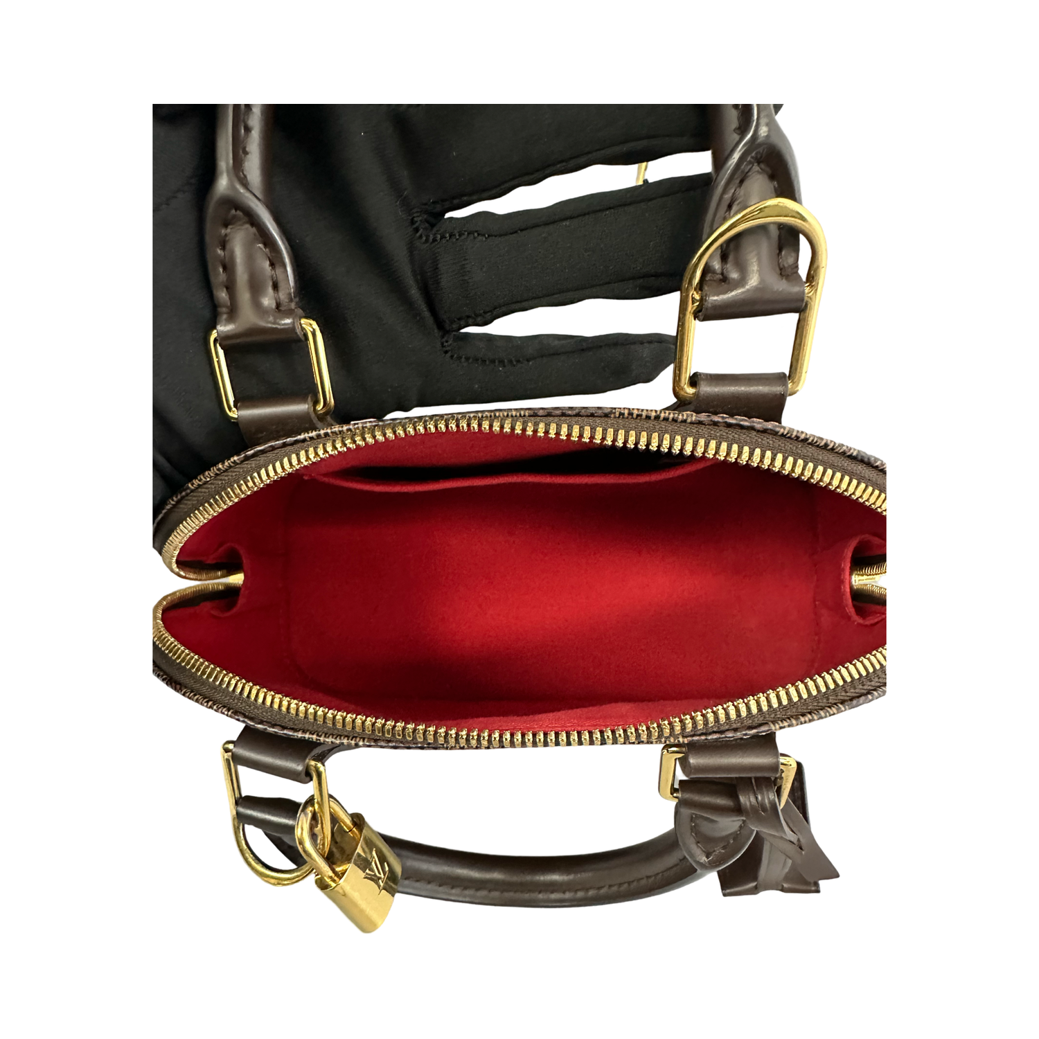 Louis Vuitton-Damier Ebene Alma BB with gold-tone hardware, Ebene canvas leather, dual rolled top handles, single detachable adjustable shoulder strap, zipper closure. Interior features include red canvas lining, 1 slip pocket.