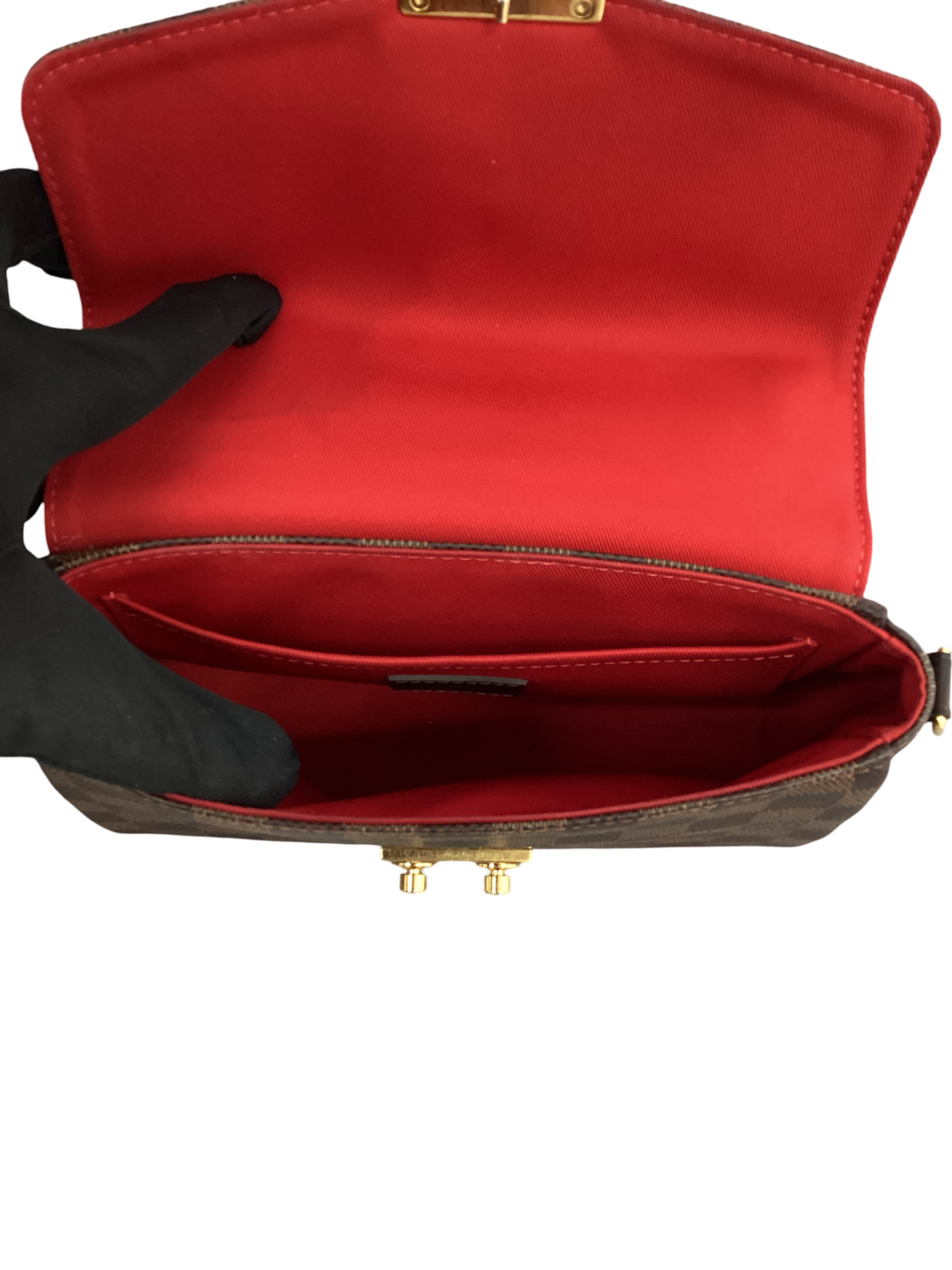 Louis Vuitton Damier Ebene Croisette with gold-toned hardware, crafted of Louis Vuitton checkerboard canvas in brown, a dark brown cowhide leather top handle, an optional leather shoulder strap, the flap is secured by a brass S lock. Interior features a rouge red fabric interior with a patch pocket.
