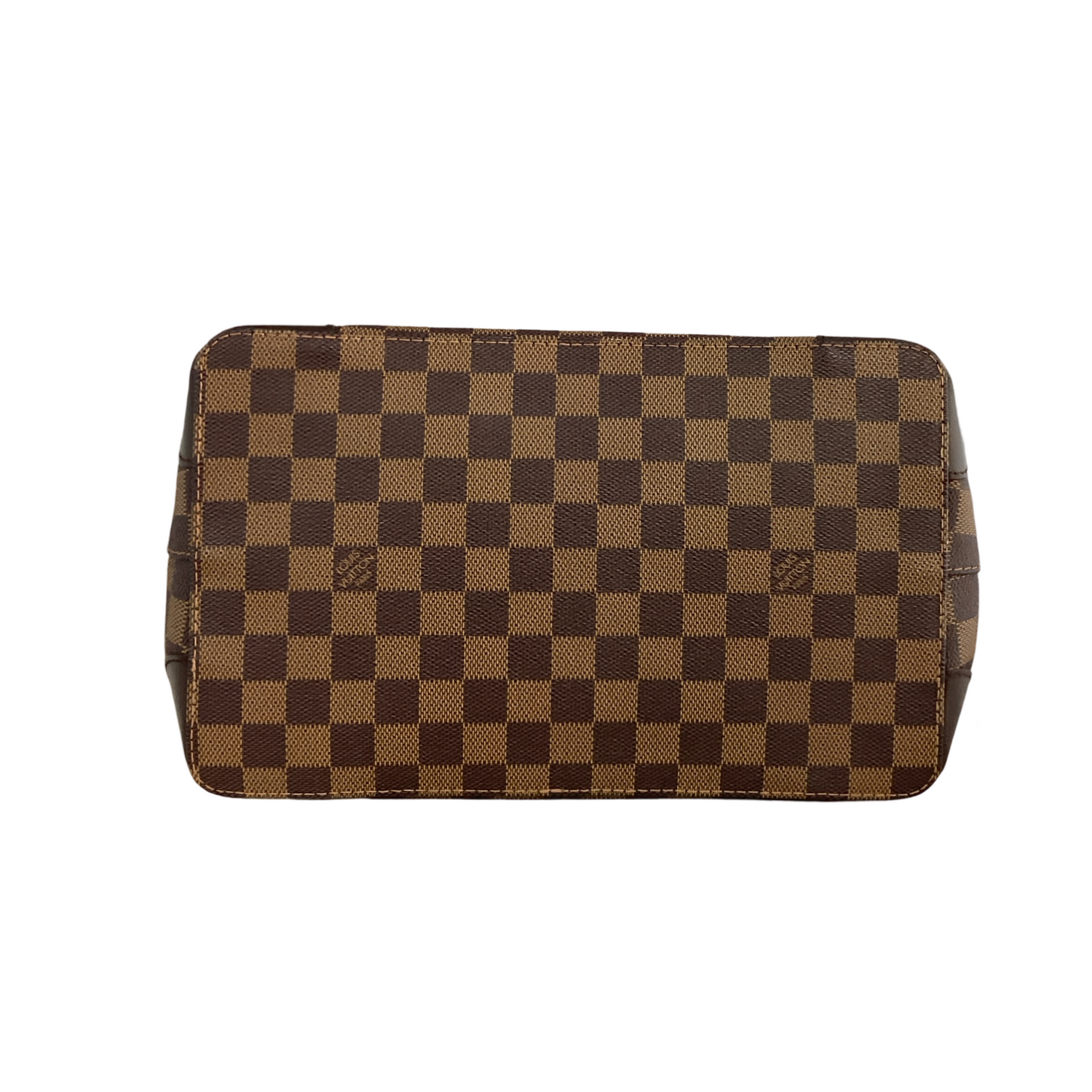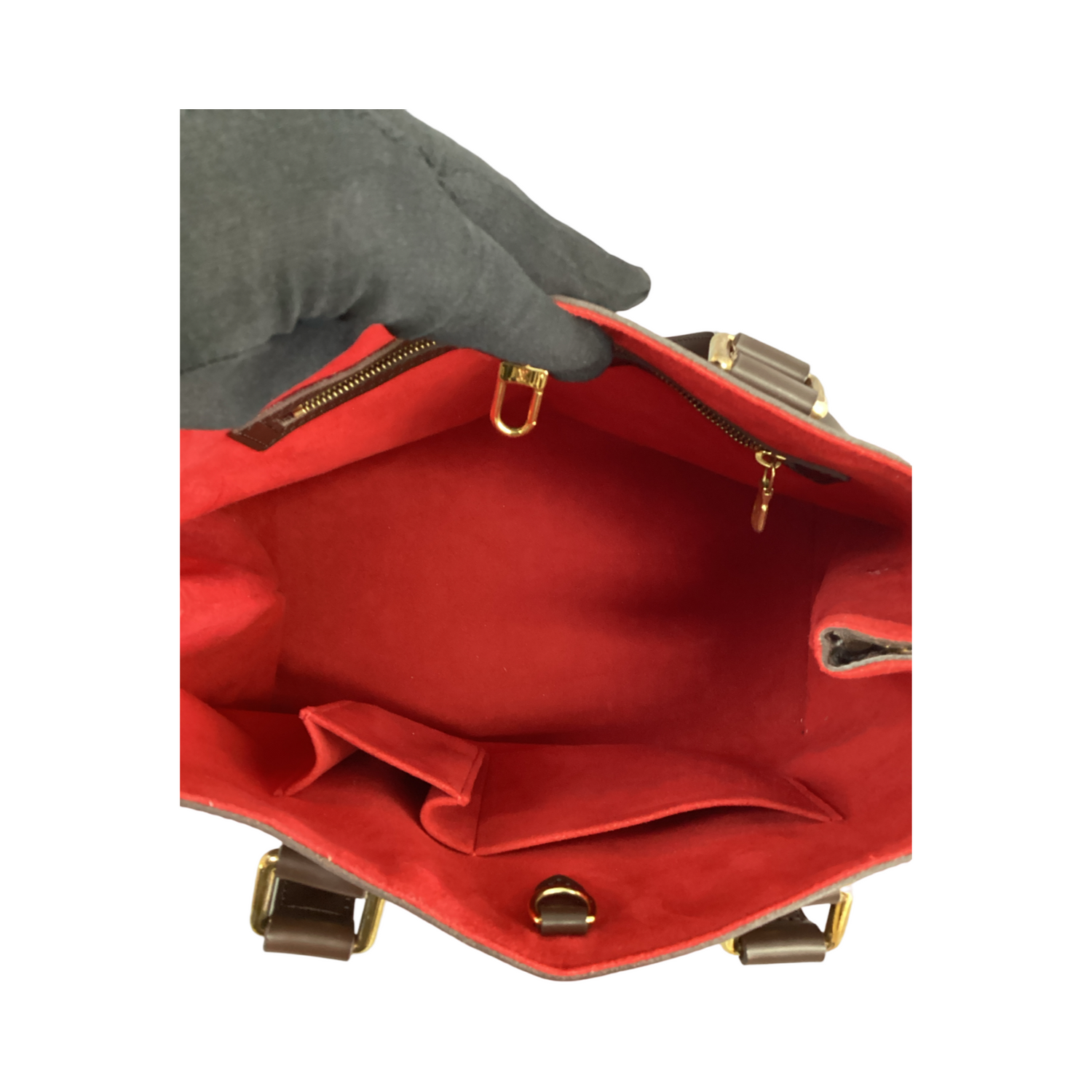 Louis Vuitton-Damier Ebene Hampstead PM with gold-toned hardware, a stylish tote is finely crafted of Louis Vuitton signature damier checkered canvas, dual chocolate brown tall leather handles, reinforced base corners and snap clasp closure. Interior features a rouge red microfiber interior with zipper and patch pockets.