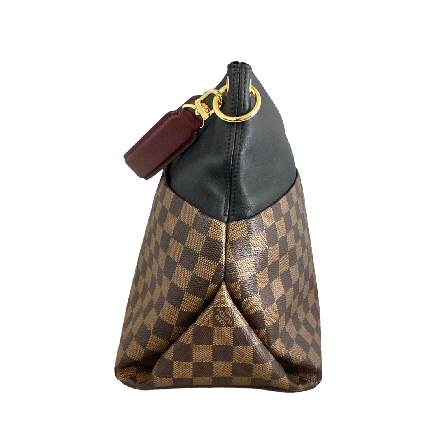 Louis Vuitton Damier Ebene Maida Hobo with gold-tone hardware, a chic tote is crafted of signature Damier toile checkered canvas, with a red top handle leather, a shoulder bag features two front pockets, and an adjustable detachable red leather strap and top zipper closure. Interior features a spacious black microfiber interior with patch pockets.