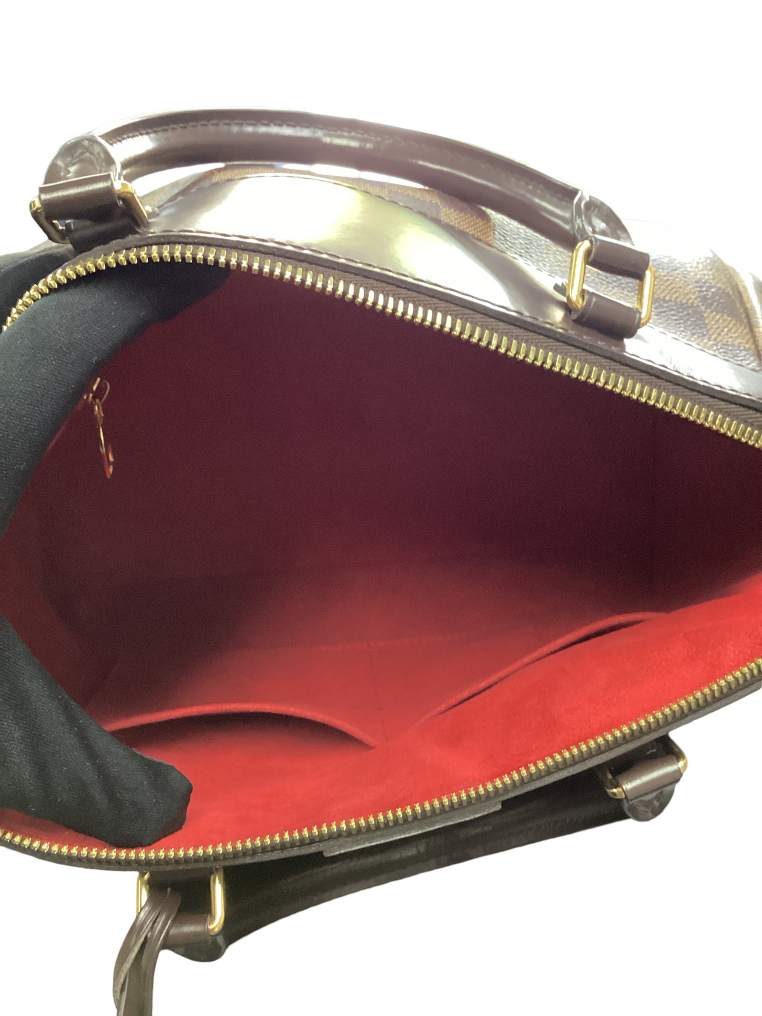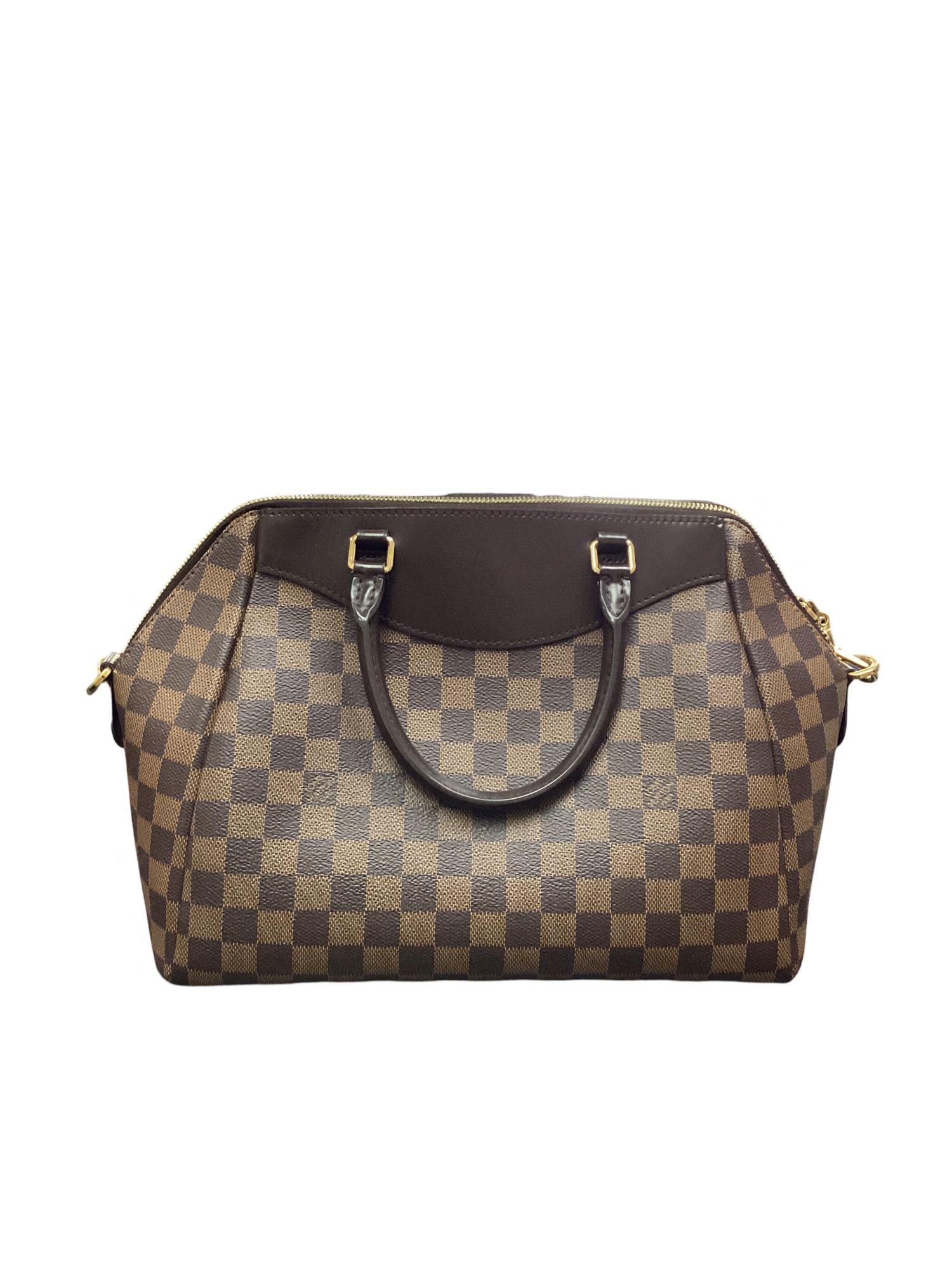 Louis Vuitton Damier Ebene Mews with gold-tone hardware, Damier Ebene checked canvas in brown, dark brown rolled leather top handles, an optional adjustable shoulder strap, and top zipper closure. Interior features red microfiber interior with zipper and 2 patch pockets.