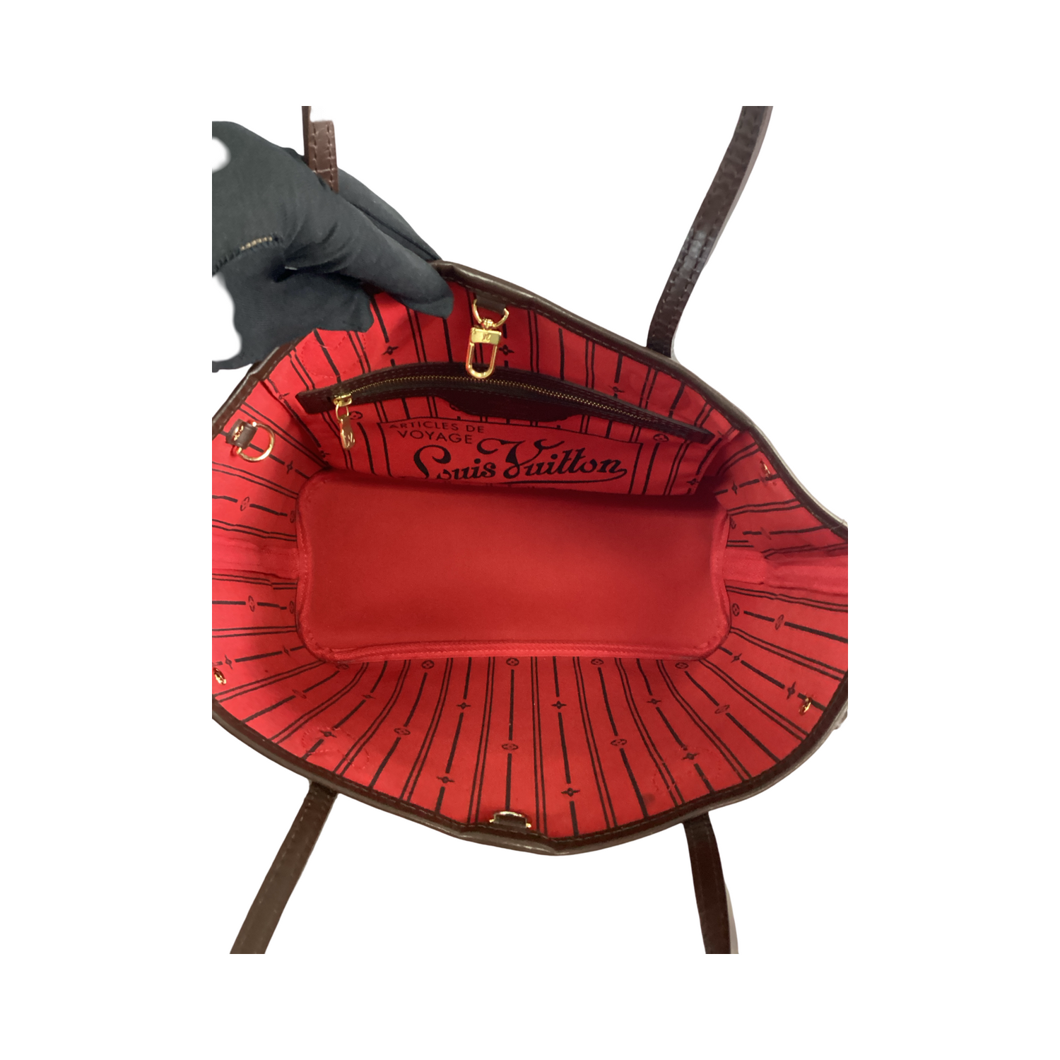 Louis Vuitton-Damier Ebene Neverfull PM with gold-tone hardware, dual top handle and side cinches. Interior features include red canvas lining, 1 zipper pocket.