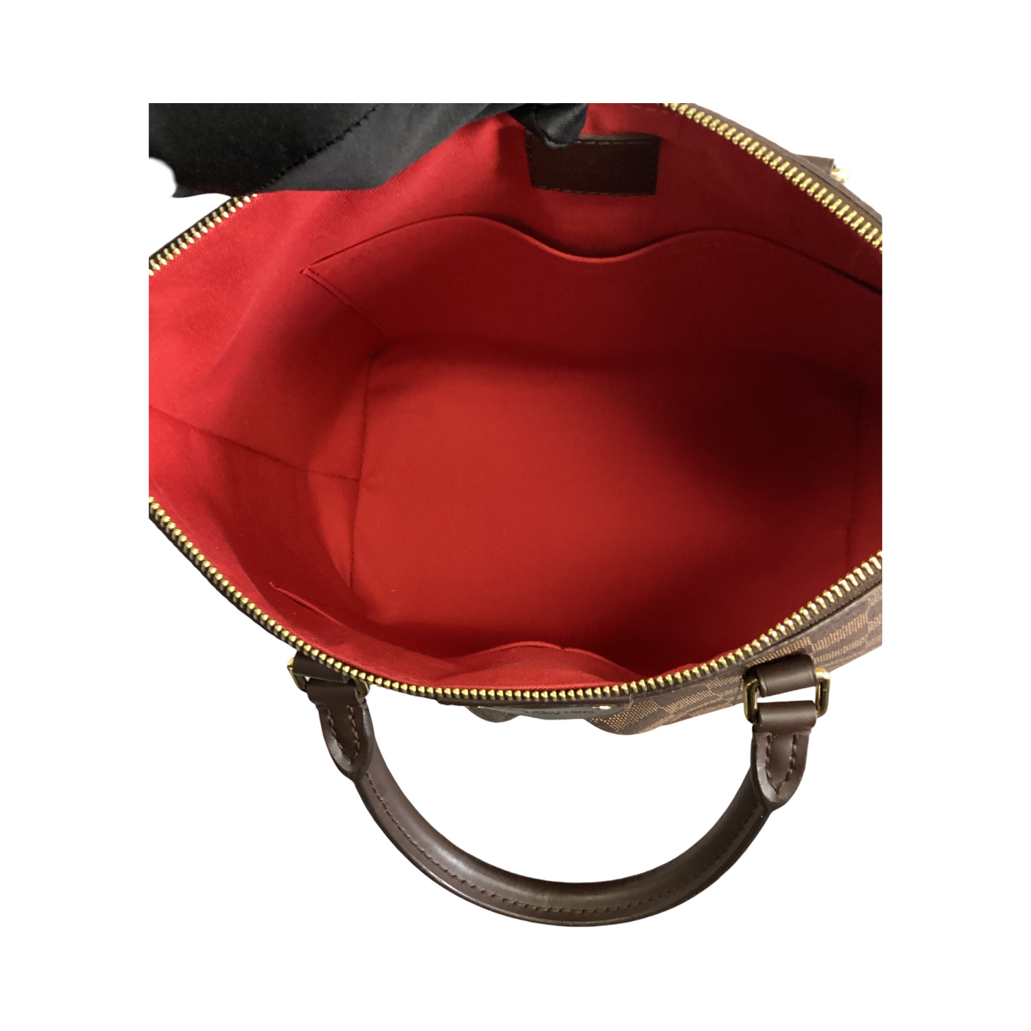 Louis Vuitton Damier Ebene Siena MM with gold-toned, hardware, crafted of Louis Vuitton checkerboard on pleated, coated canvas in brown, a chocolate brown leather trim, rolled top handles, a detachable adjustable strap and a top zipper closure. Interior features a red fabric interior with 3 patch pockets.