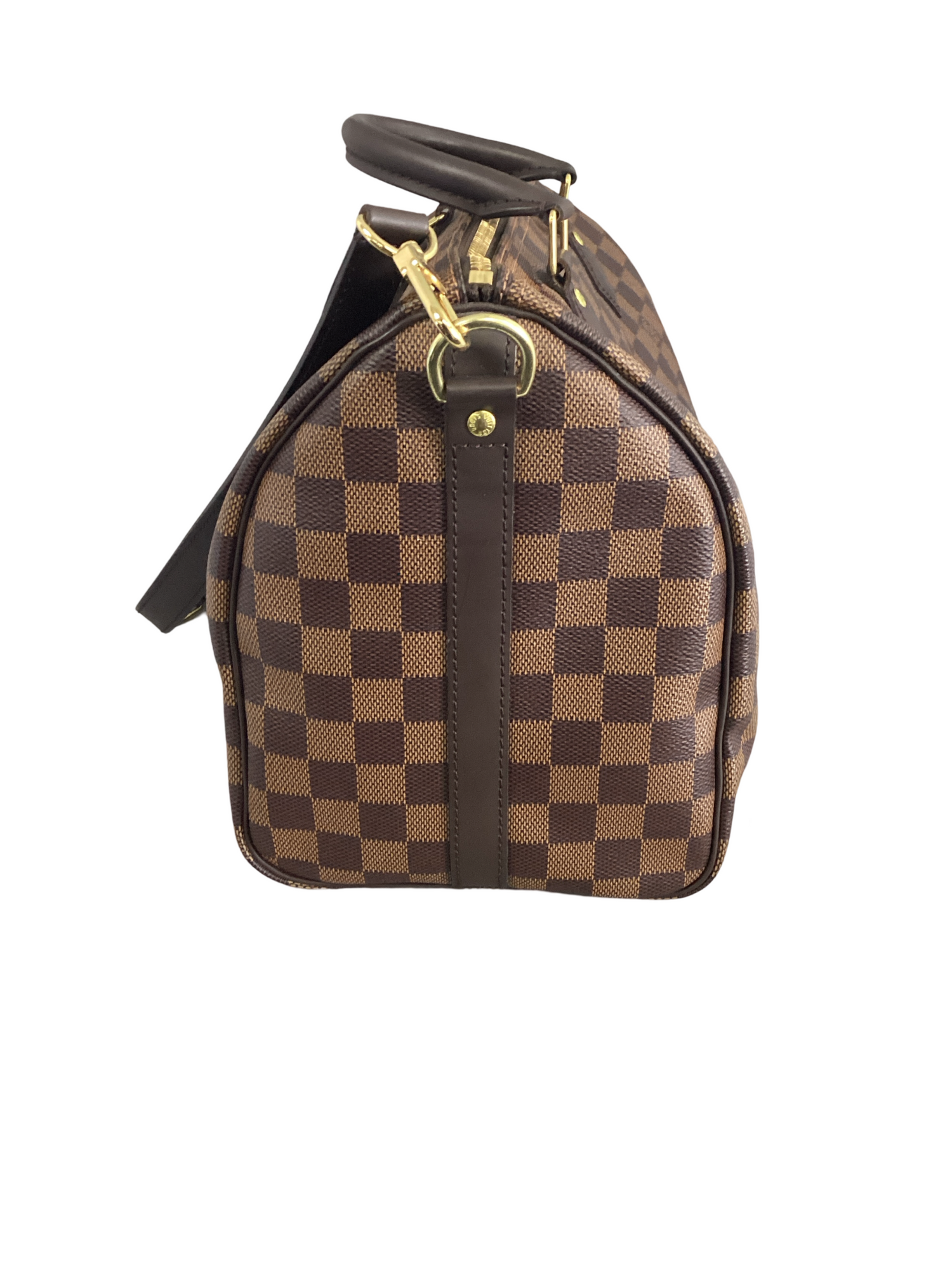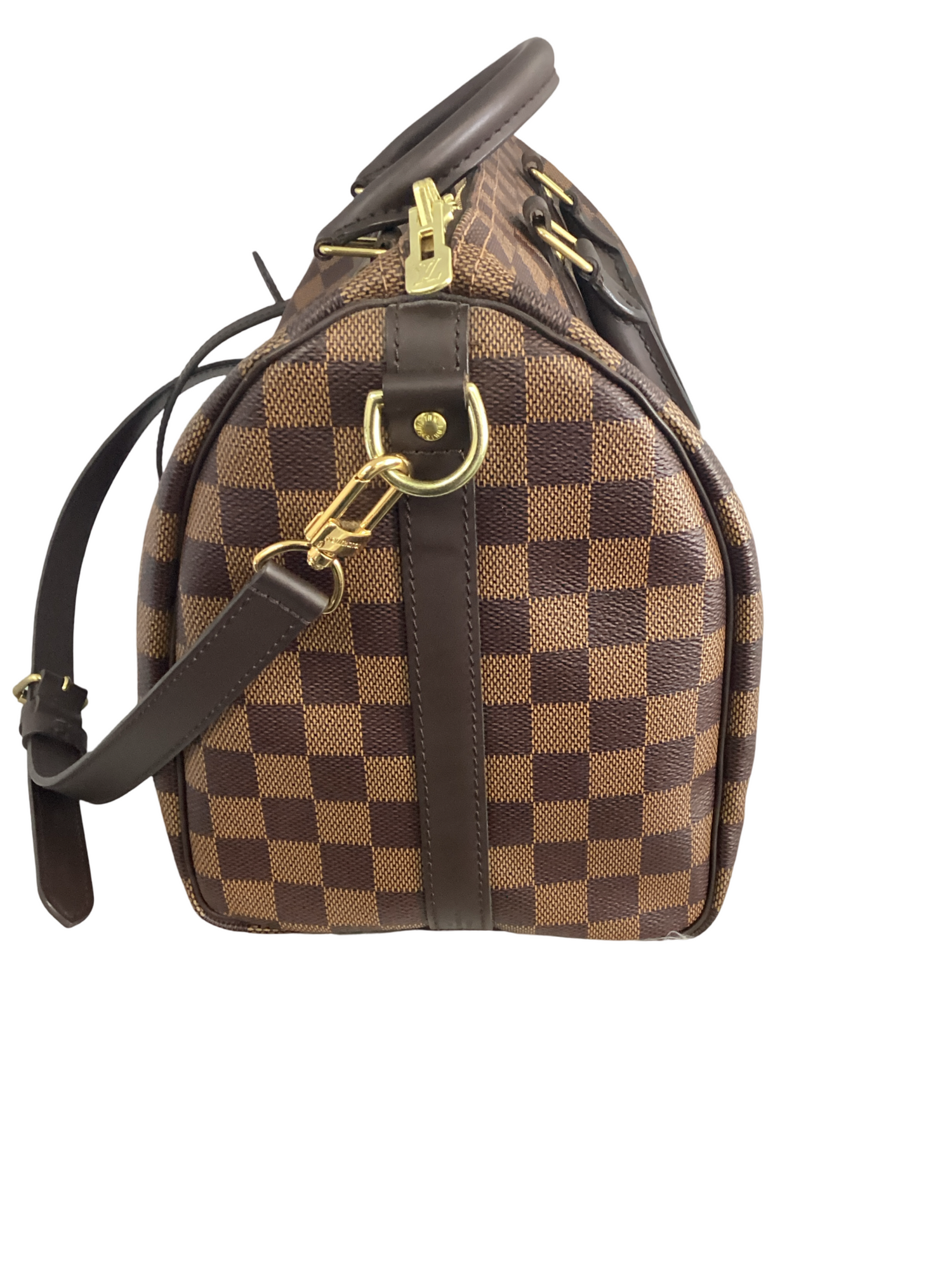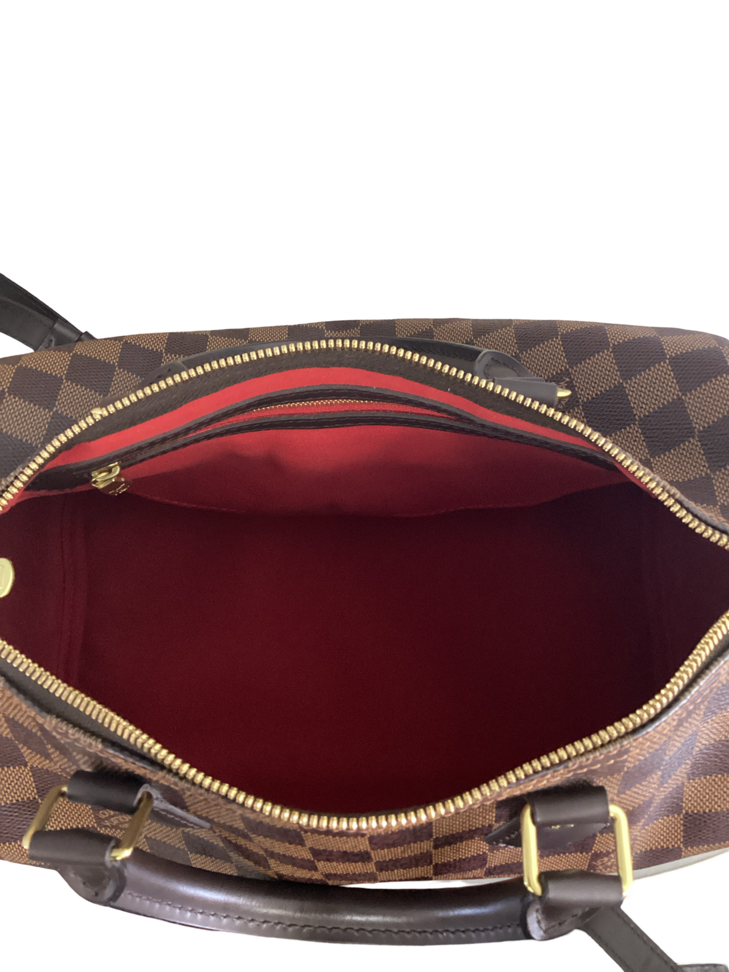 Louis Vuitton Damier Ebene Speedy 30 with gold-tone hardware, dual rolled top handles, single detachable adjustable shoulder strap. Interior features include red canvas lining, 1 zipper pocket, comes with padlock and keys.