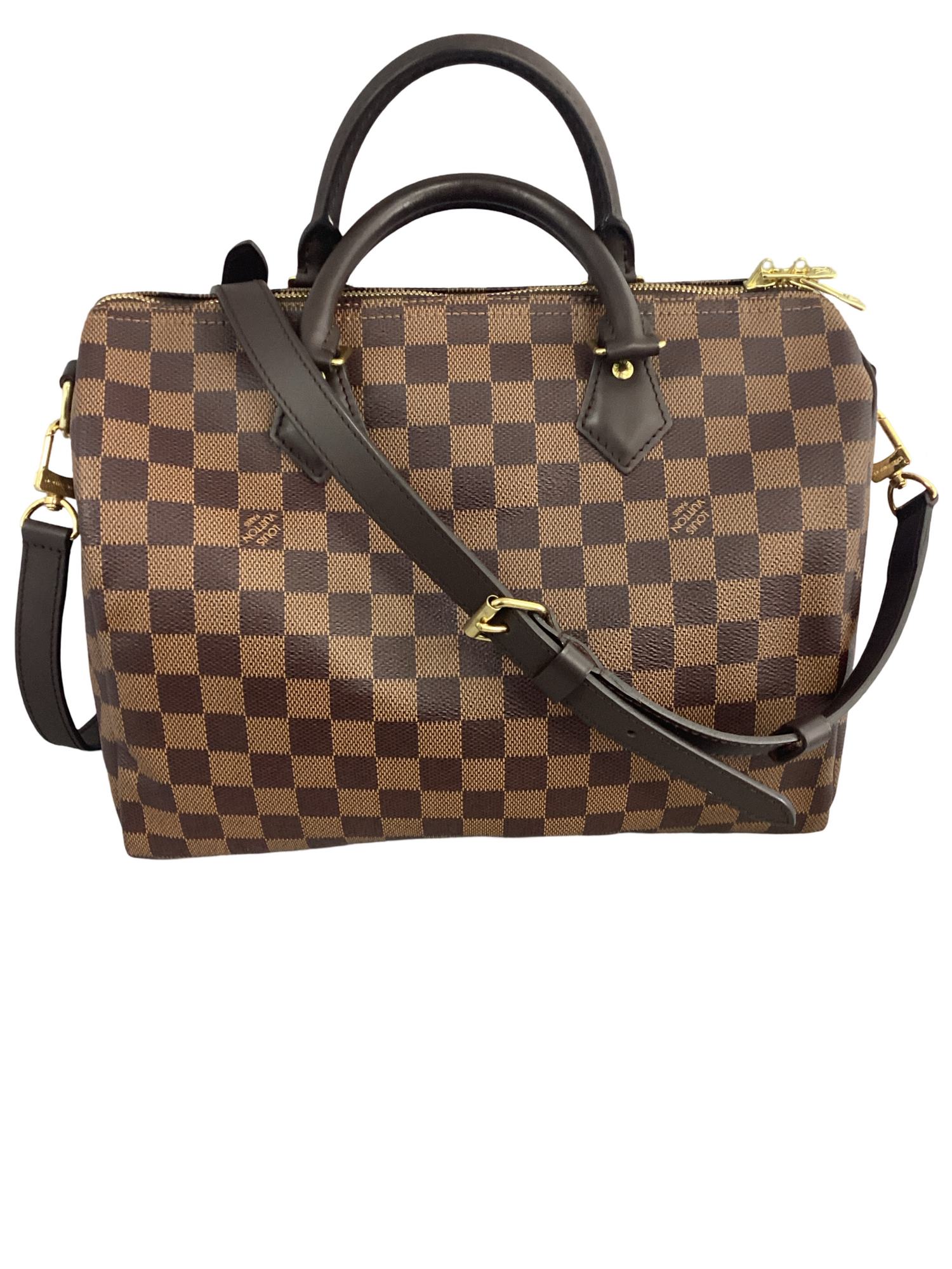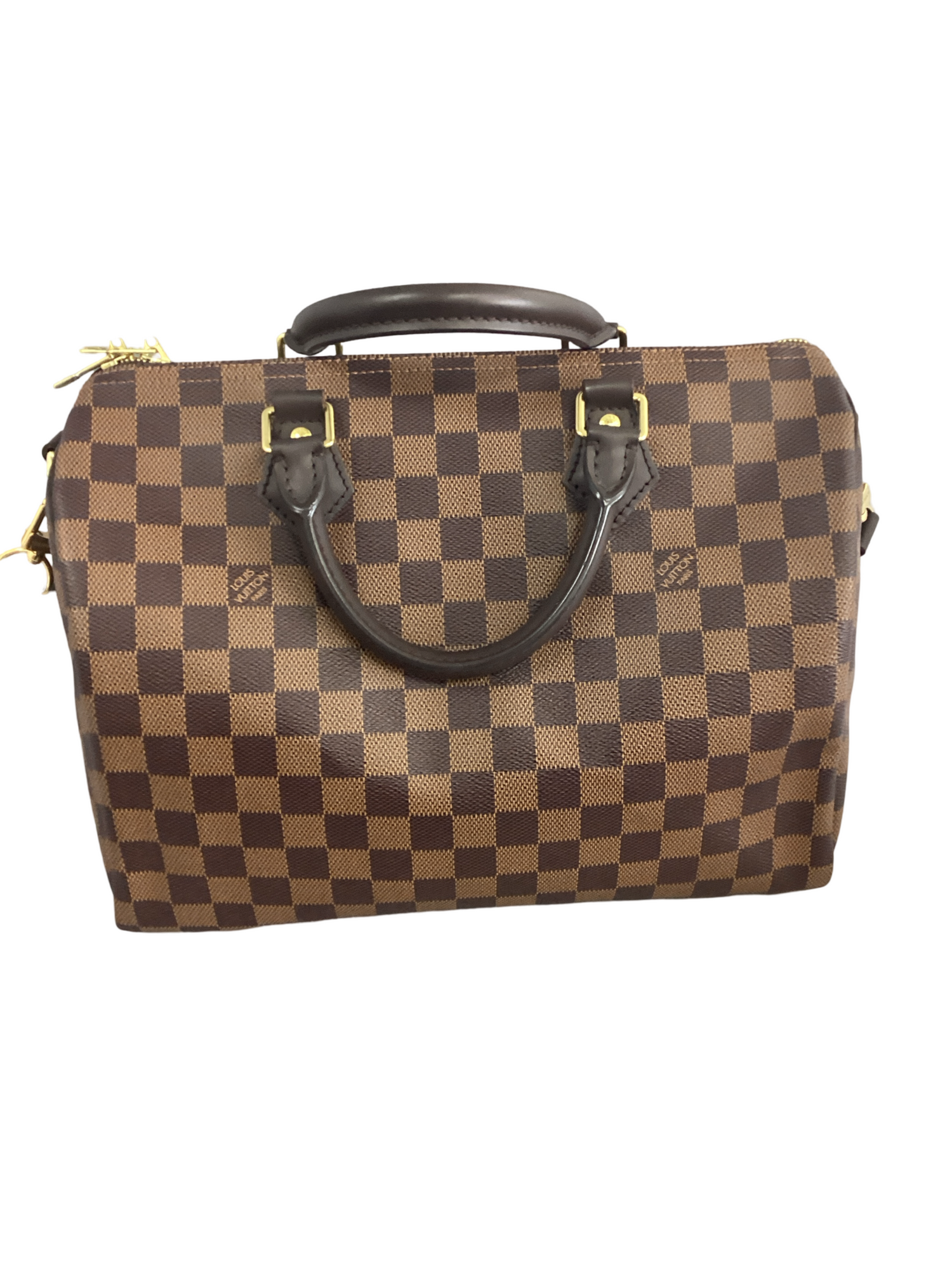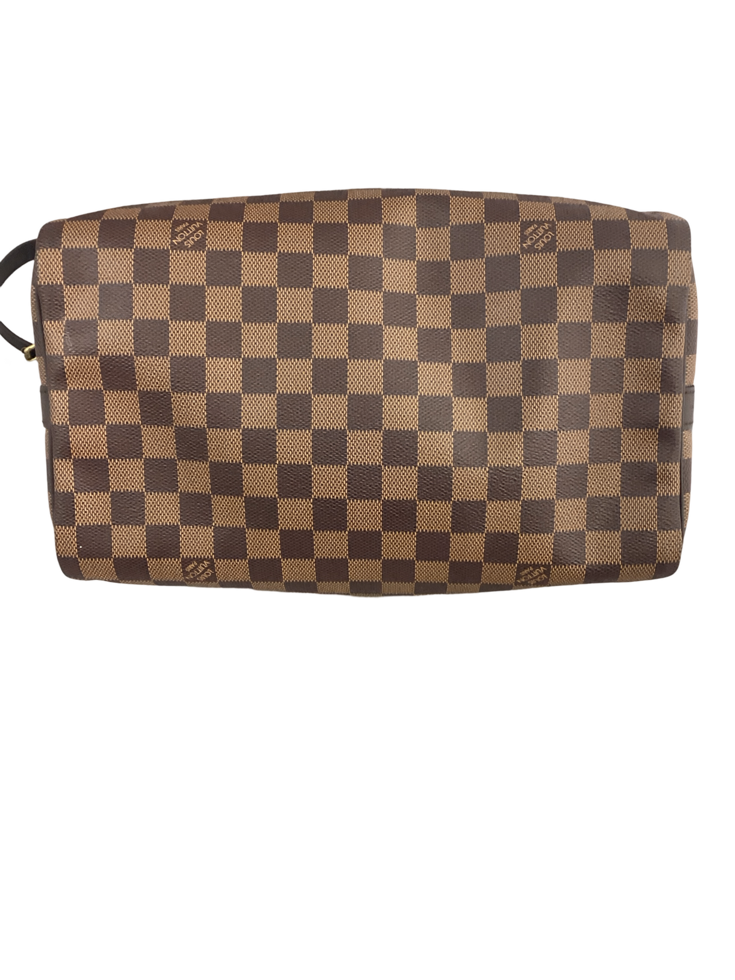 Louis Vuitton Damier Ebene Speedy 30 with gold-tone hardware, dual rolled top handles, single detachable adjustable shoulder strap. Interior features include red canvas lining, 1 zipper pocket, comes with padlock and keys.