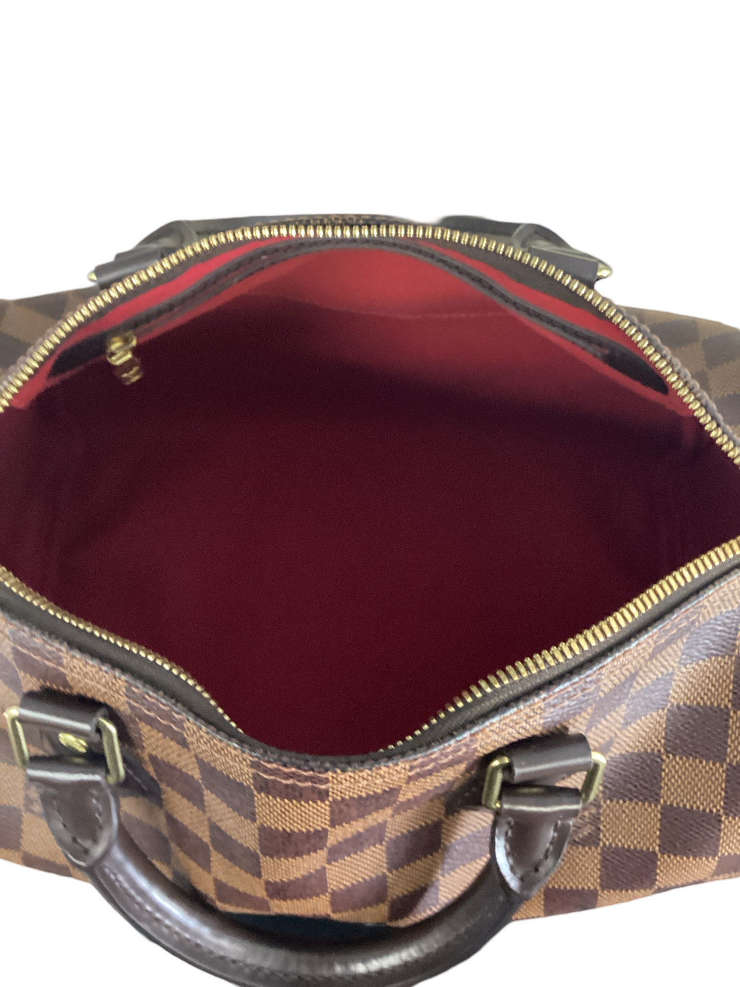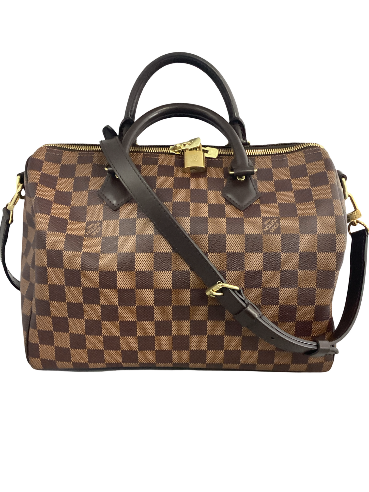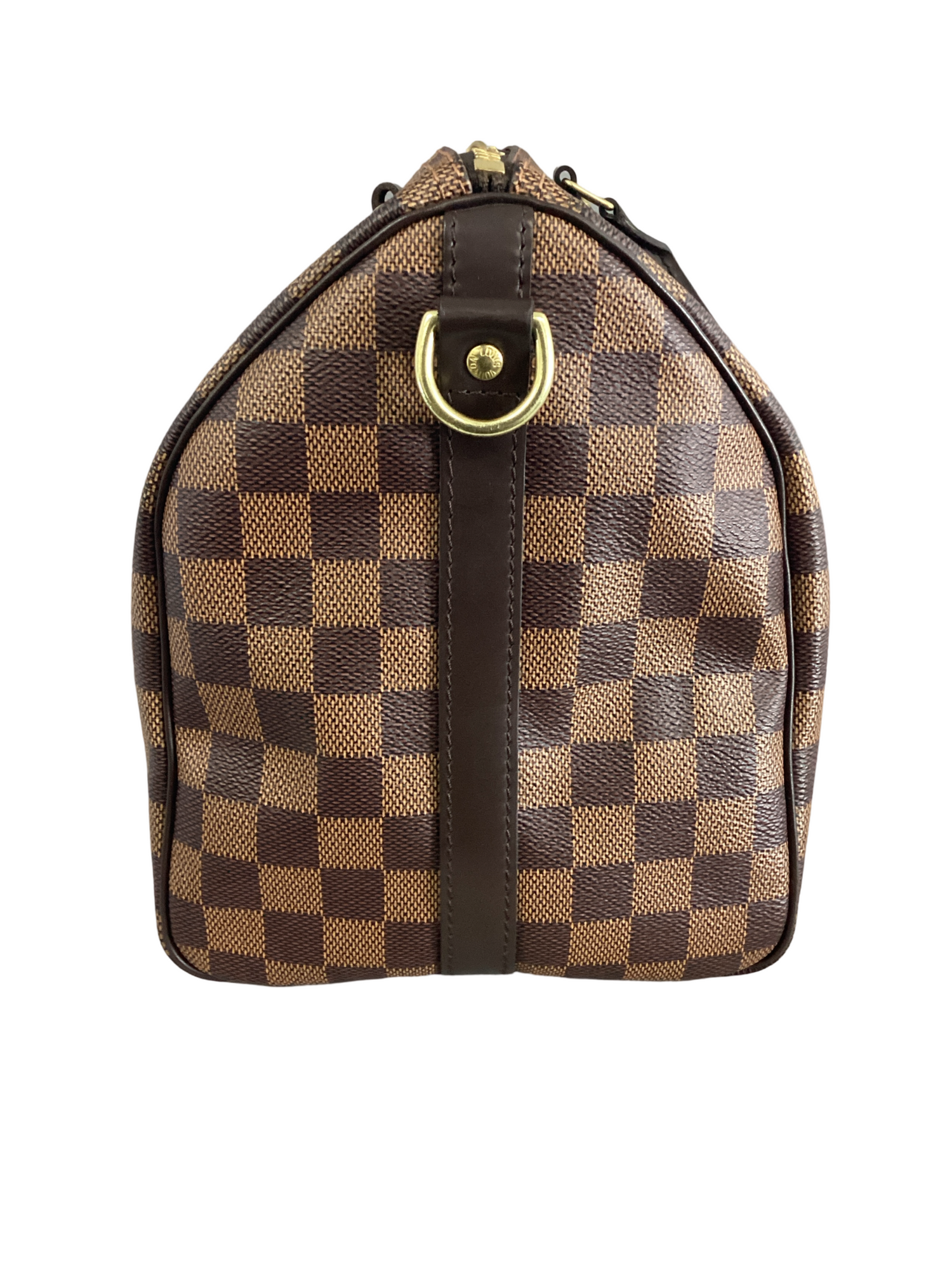 Louis Vuitton-Damier Ebene Speedy 30 w/ Strap with gold-tone hardware, dual rolled top handles, single detachable adjustable shoulder strap. Interior features include red canvas lining, 1 zipper pocket, comes with padlock and keys.