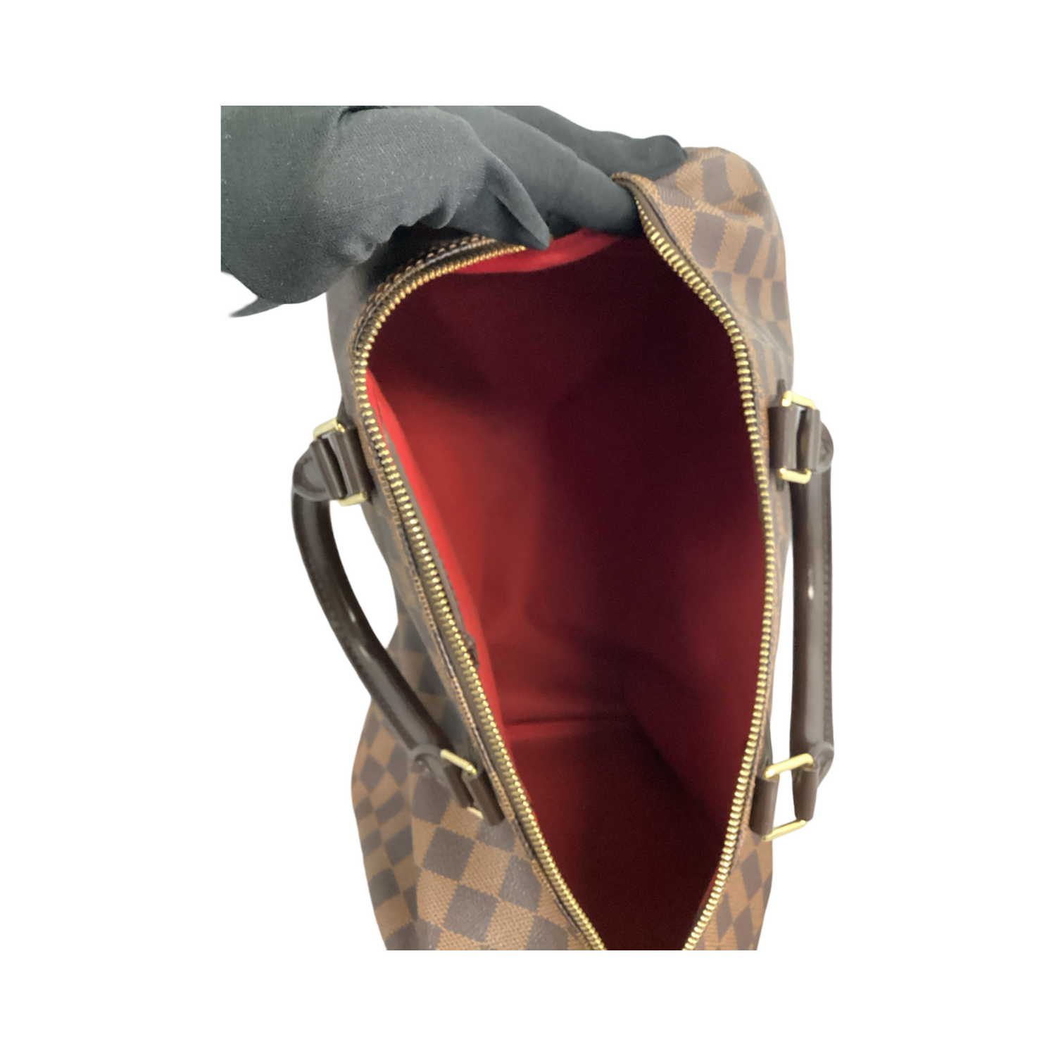 Louis Vuitton-Damier Ebene Speedy 35 with gold-tone hardware, dual rolled top handles. Interior features include red canvas lining, 1 zipper pocket, comes with padlock and keys.