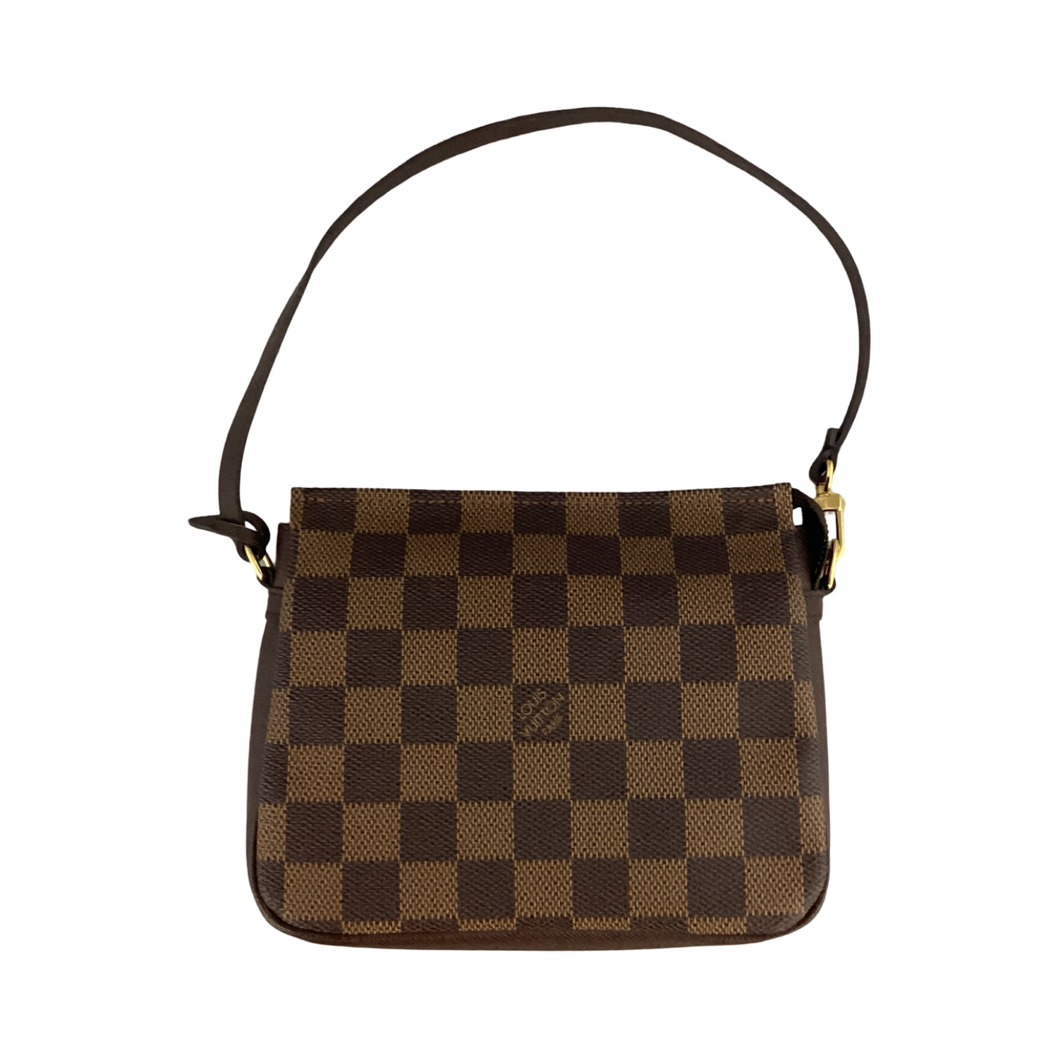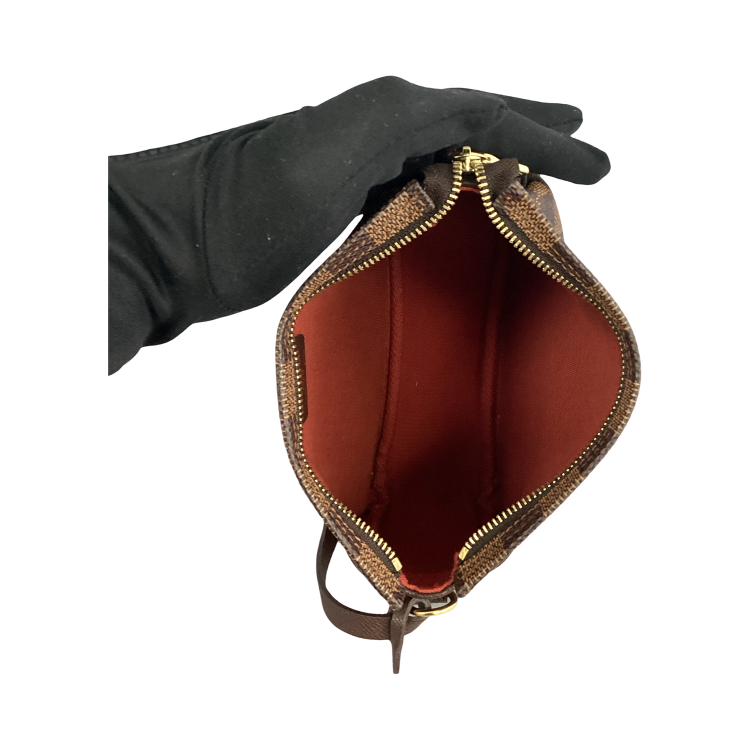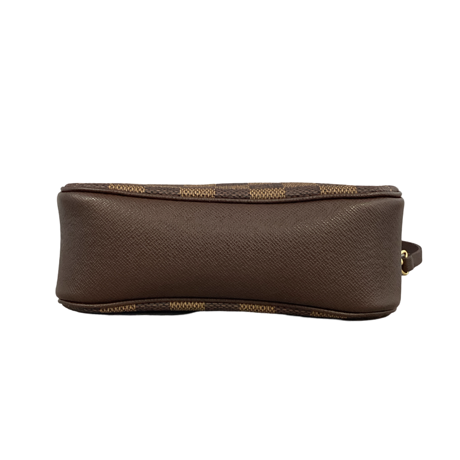 Louis Vuitton-Damier Ebene Trousse Pochette with gold-toned hardware, crafted of traditional Louis Vuitton Damier checkered coated canvas with mocha brown leather trim, a removable leather strap and top zipper closure. Interior features a compact burnt orange fabric interior.