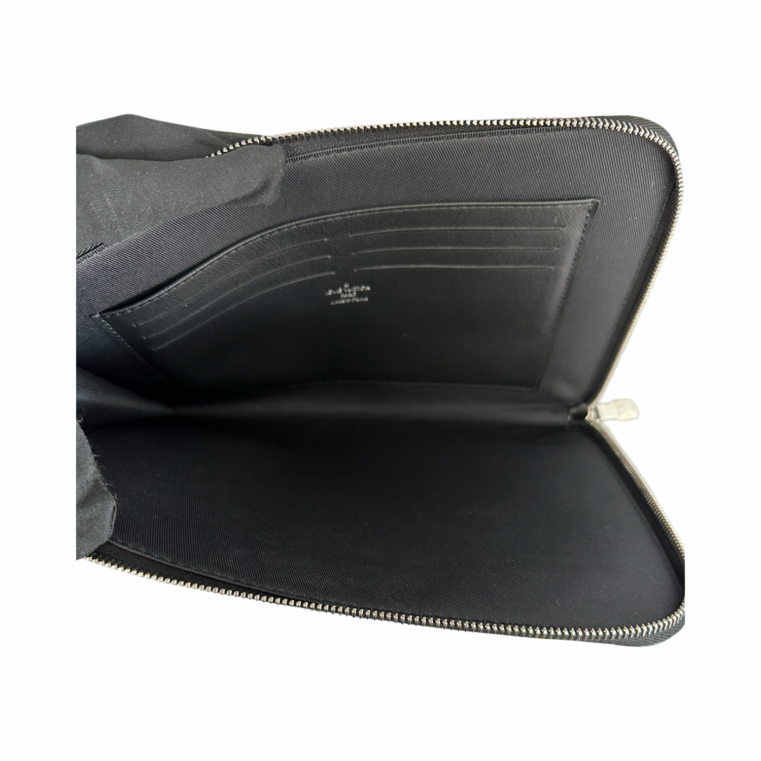 Louis Vuitton-Damier Graphite Pochette MM with silve-toned hardware, crafted of signature Louis Vuitton damier canvas in black and gray, and features a wrap-around polished silver zipper that opens to a black fabric interior with patch pocket and 6 card slots.