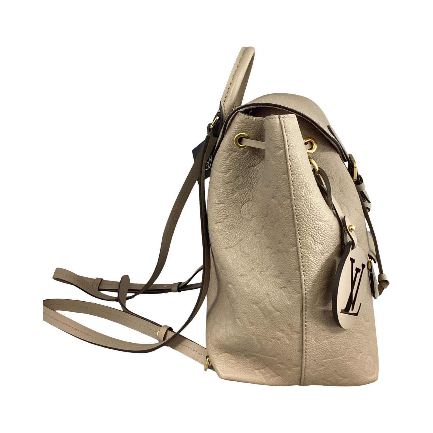 Louis Vuitton Empreinte Tourterelle Montsouris with gold-toned hardware, crafted of tan calfskin leather embossed with the Louis Vuitton monogram, a leather top handle, adjustable shoulder straps, a front zipper pocket, and crossover flap closure with a leather drawstring. Interior features a light pink microfiber interior with a patch pocket.