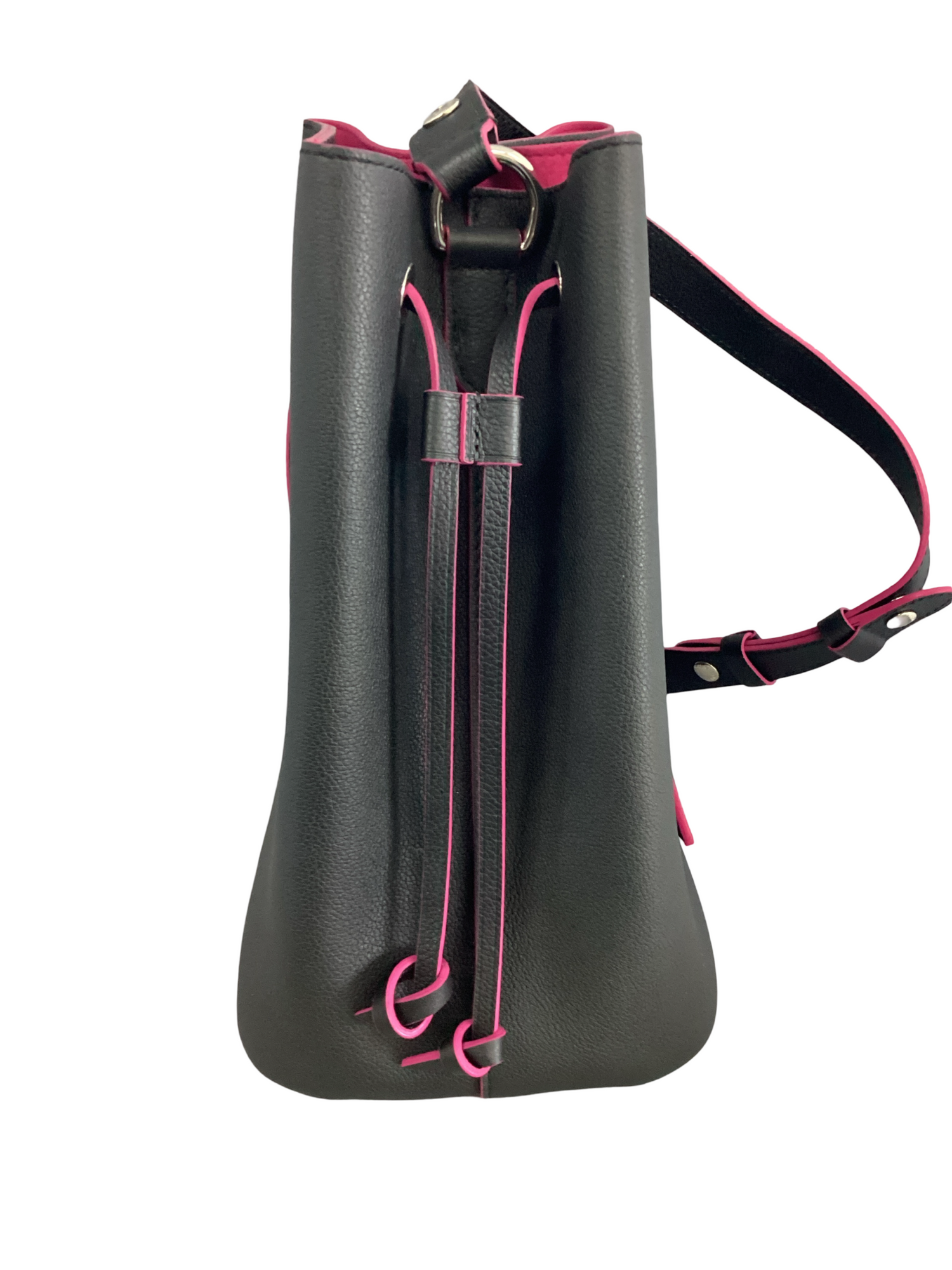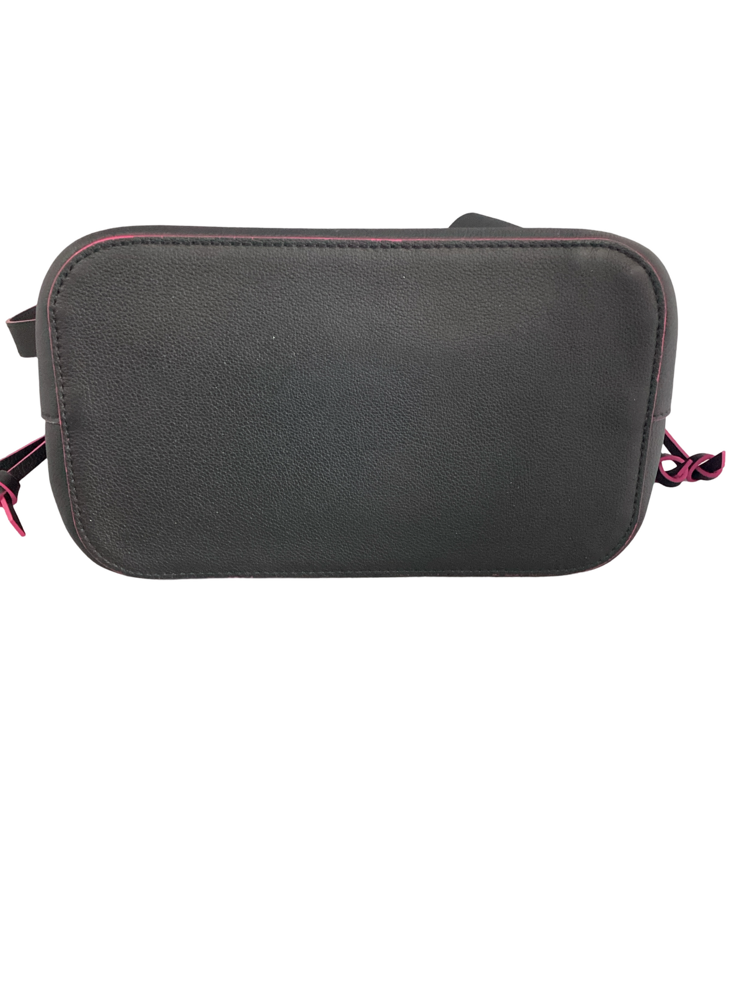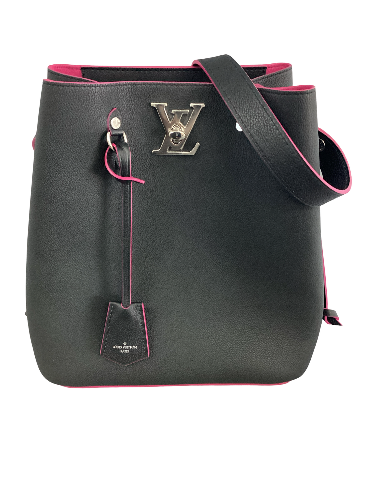 Louis Vuitton Lockme Bucket Bag with silver-toned hardware, crafted of textured calfskin leather in black, with vibrant pink resin glazing, an adjustable leather shoulder strap and side cinch cords and twist lock closure. Interior features a matching pink microfiber interior with hanging zipper and patch pockets.