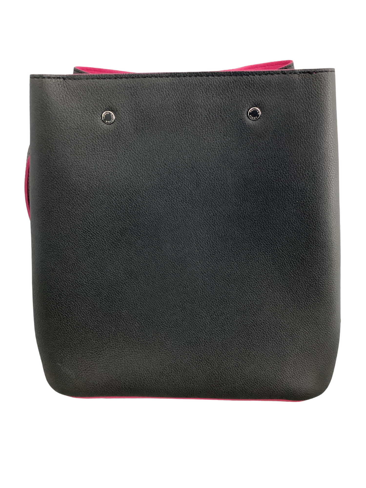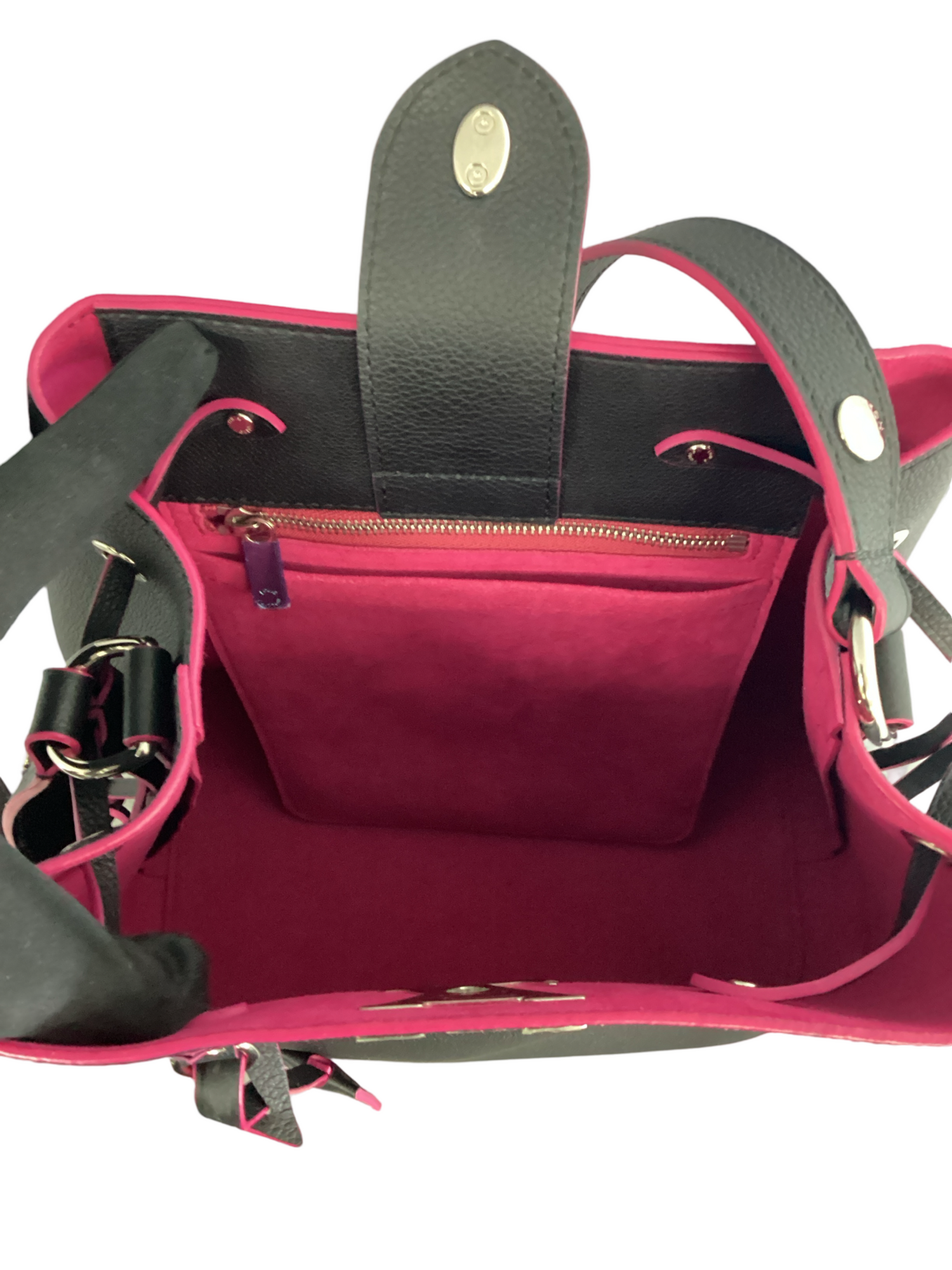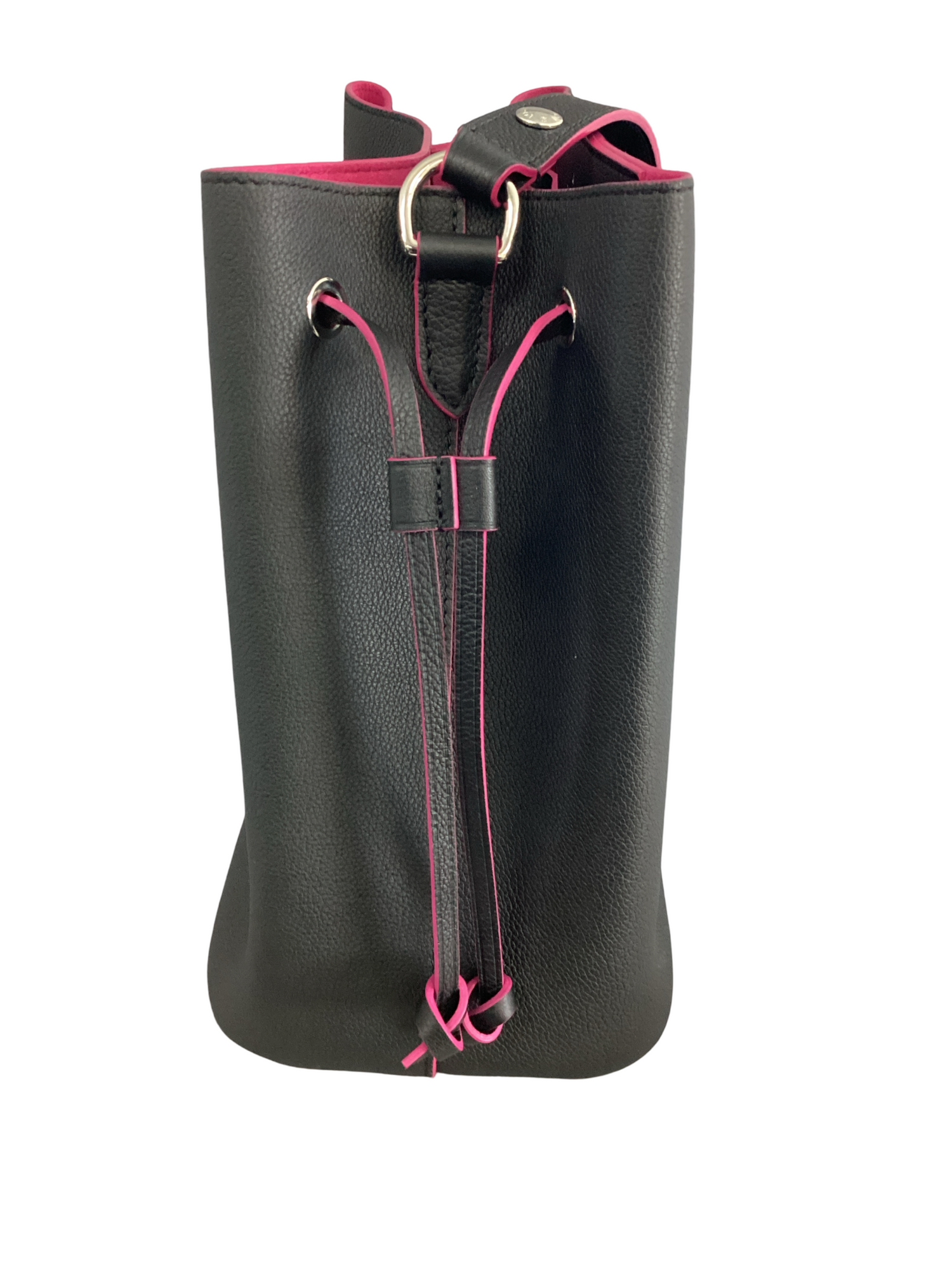 Louis Vuitton Lockme Bucket Bag with silver-toned hardware, crafted of textured calfskin leather in black, with vibrant pink resin glazing, an adjustable leather shoulder strap and side cinch cords and twist lock closure. Interior features a matching pink microfiber interior with hanging zipper and patch pockets.