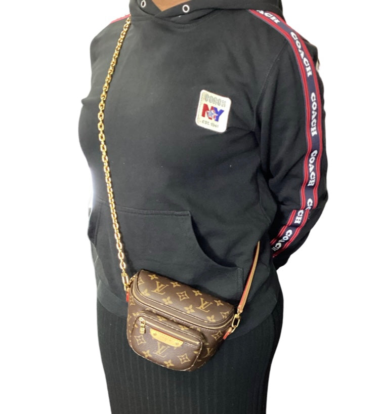 Louis Vuitton-Mini Bumbag Monogram Canvas with gold-tone hardware, a stylish belt bag is crafted of Louis Vuitton's traditional monogram on coated canvas, a removable, adjustable vachetta cowhide leather strap as well as a removable gold chain strap, bag has two compartments, a main zipper compartment and a front zippered pocket. Interior features a brown microfiber-lined interior.