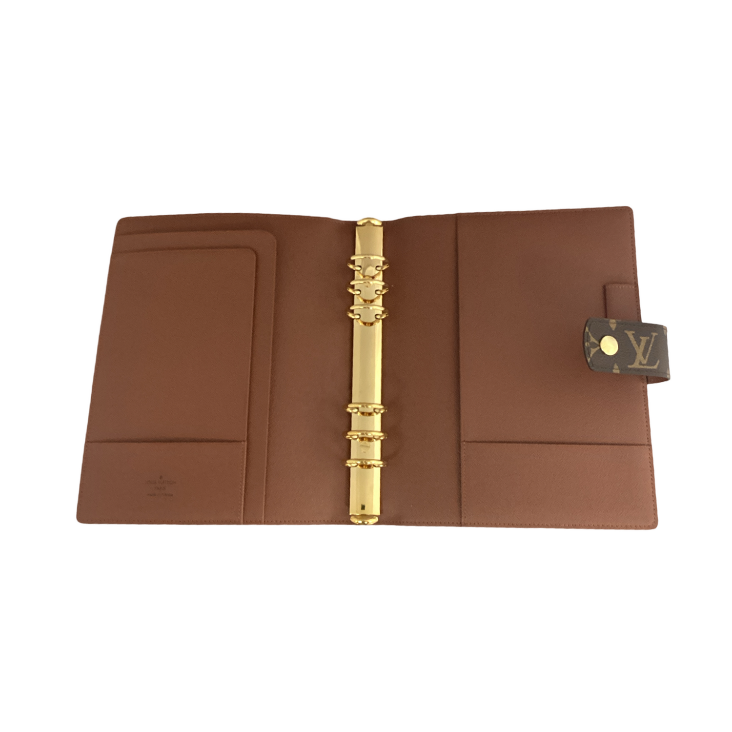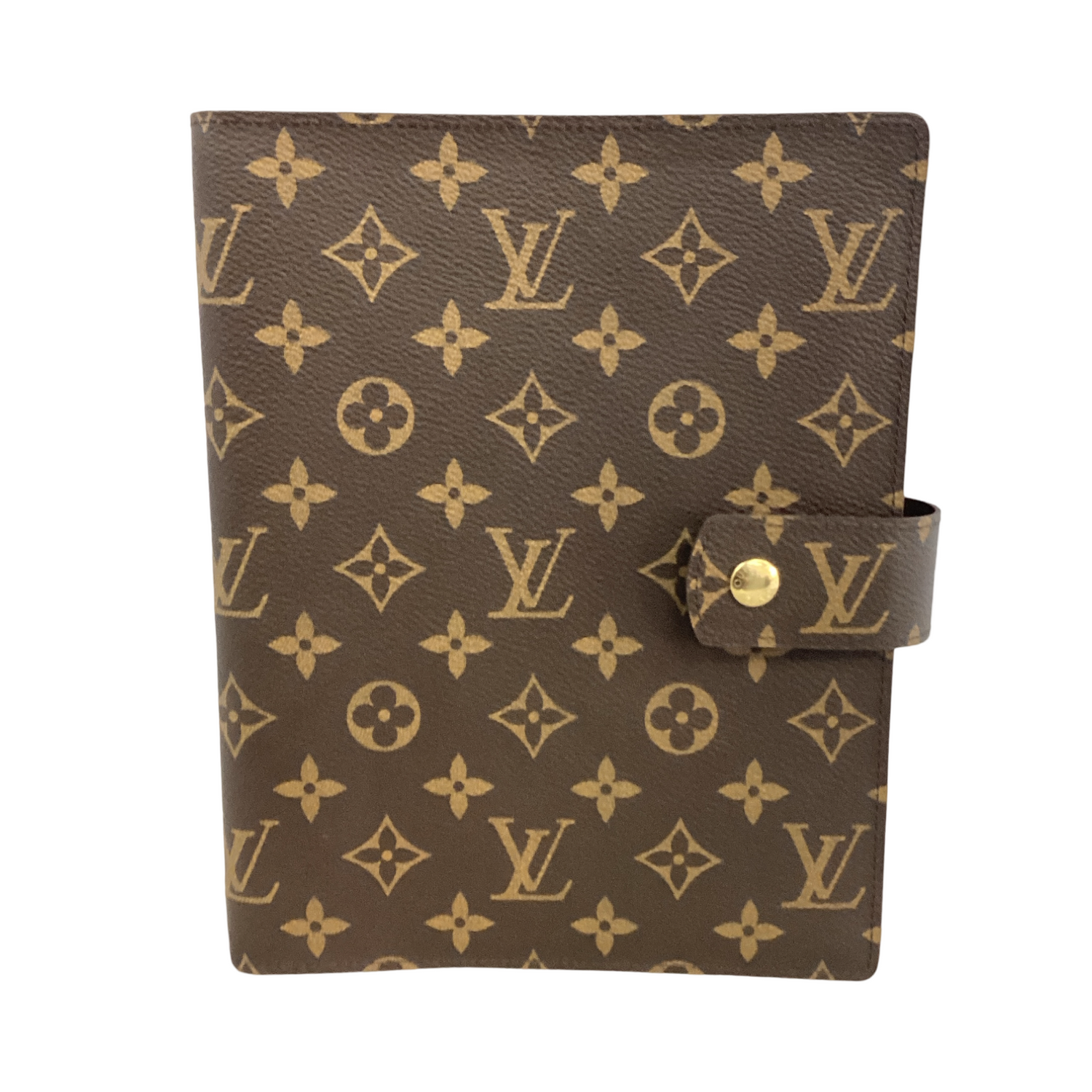 Louis Vuitton-Monogram Agenda GM with gold-toned hardware, crafted of classic Louis Vuitton monogram on toile canvas and has a snap closure. Interior features a terra cotta cross grain leather interior with patched pockets and 2 card slots.