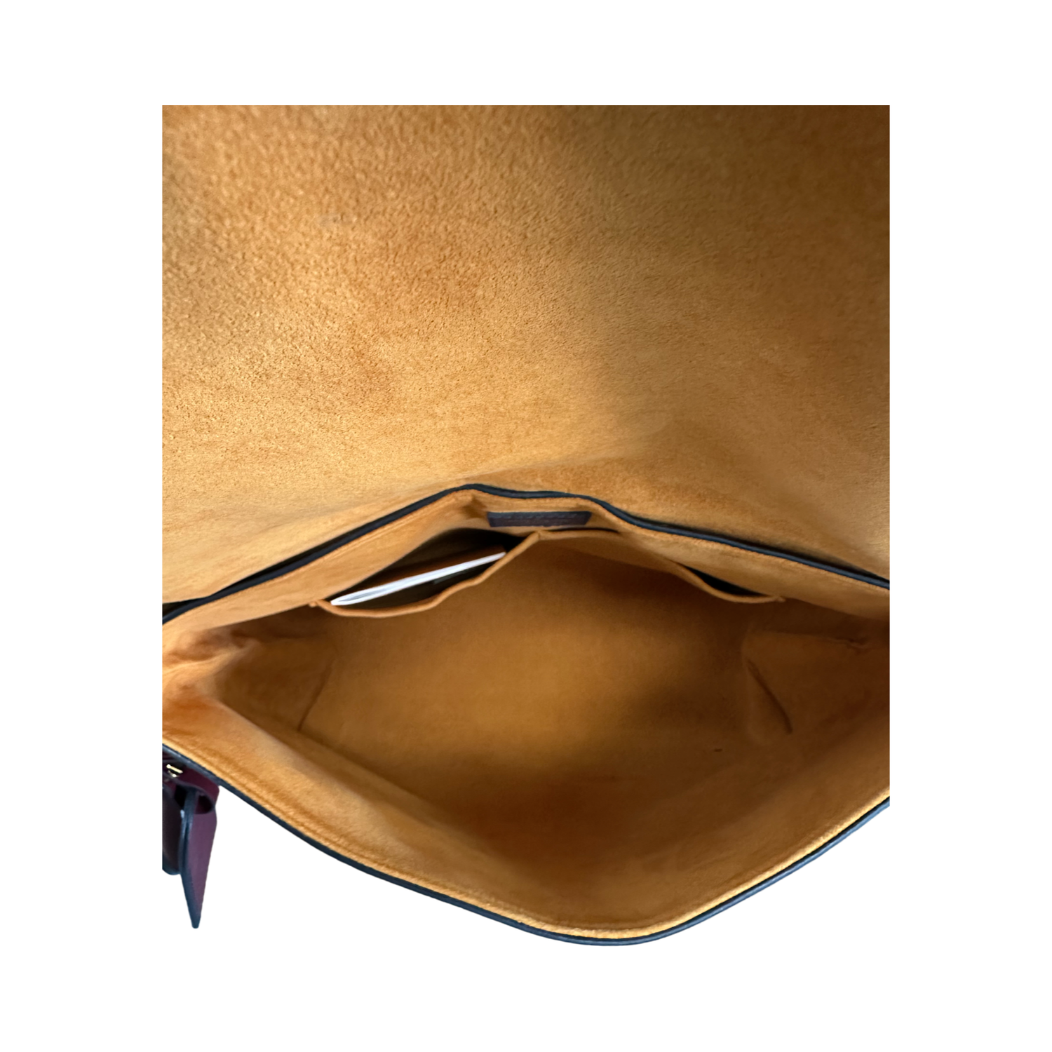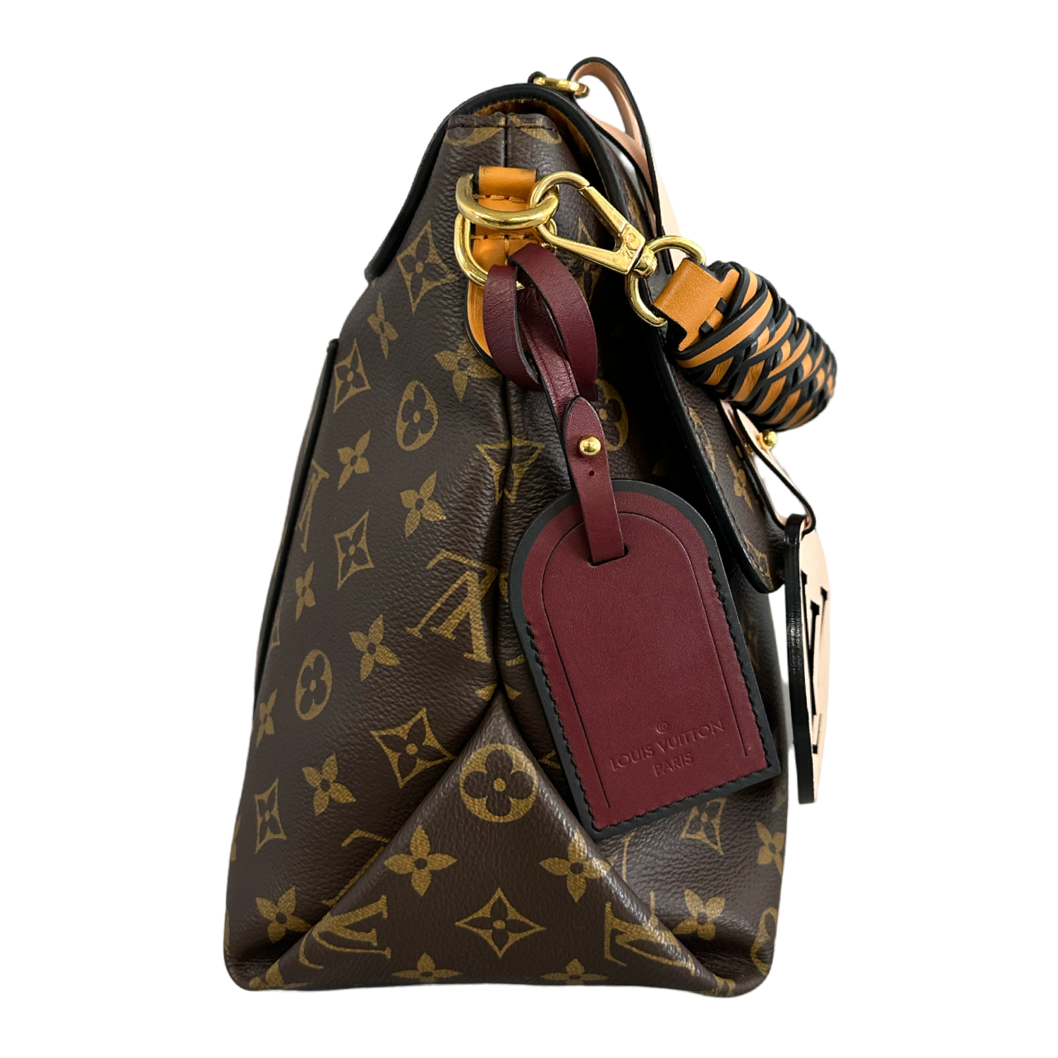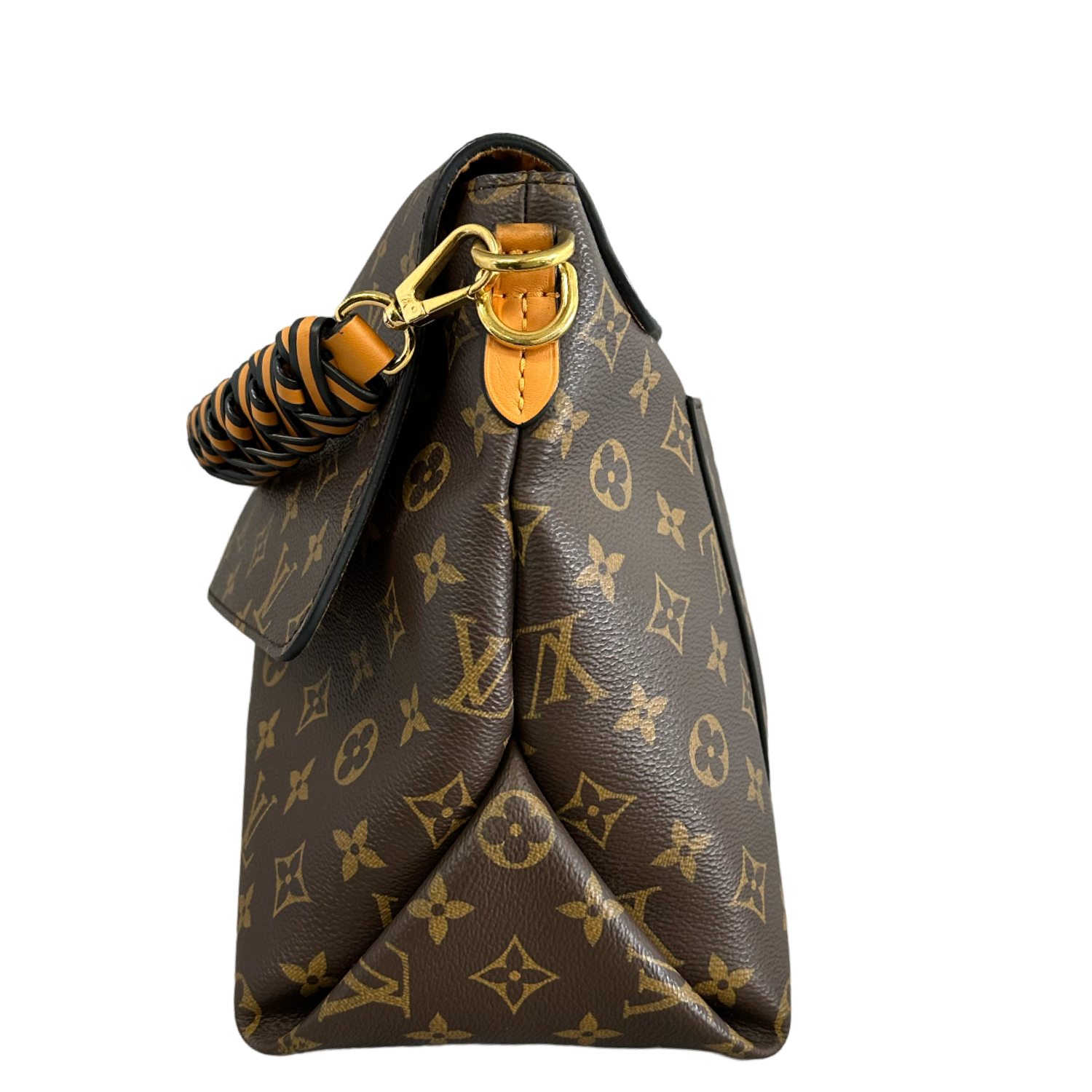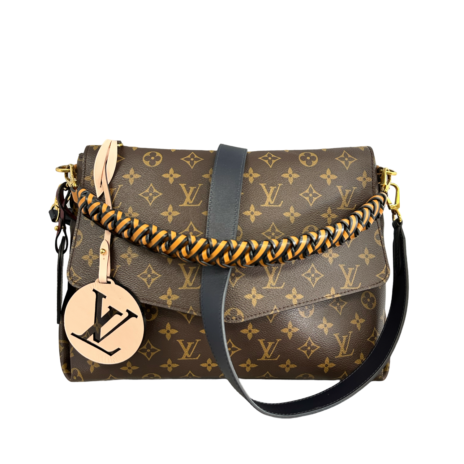 Louis Vuitton-Monogram Beaubourg MM Safran Imperial with gold-toned hardware, crafted of classic Louis Vuitton monogram on toile canvas, a detachable braided yellow strap, an optional shoulder strap in navy, a back patch pocket and a flap snap closure. Interior features T an envelope style flap that leads to a yellow suede interior with 2 patch pockets.