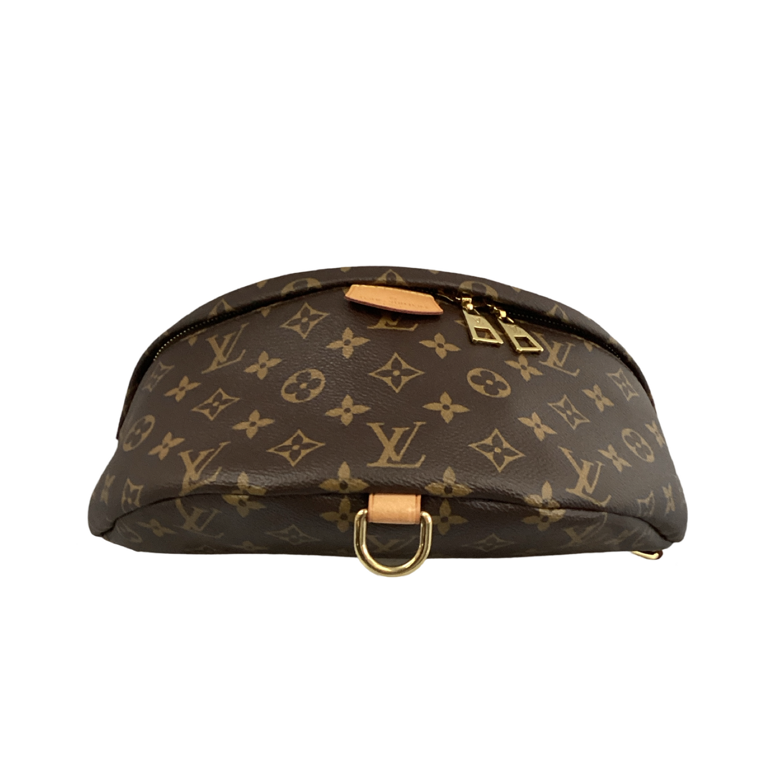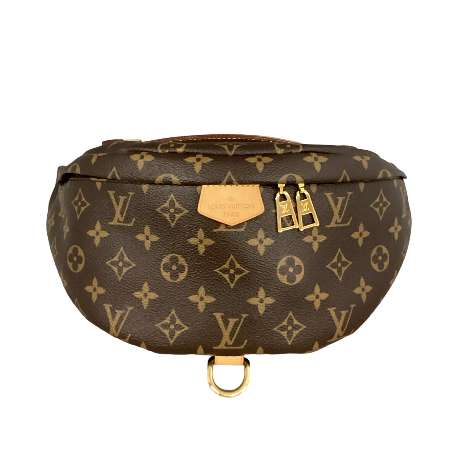 Louis Vuitton-Monogram BumBag with gold-toned hardware, a Louis Vuitton monogram on toile canvas, a vachetta cowhide leather top handle, an adjustable waist strap and a front and rear zipper pocket. Interior features a black fabric interior.