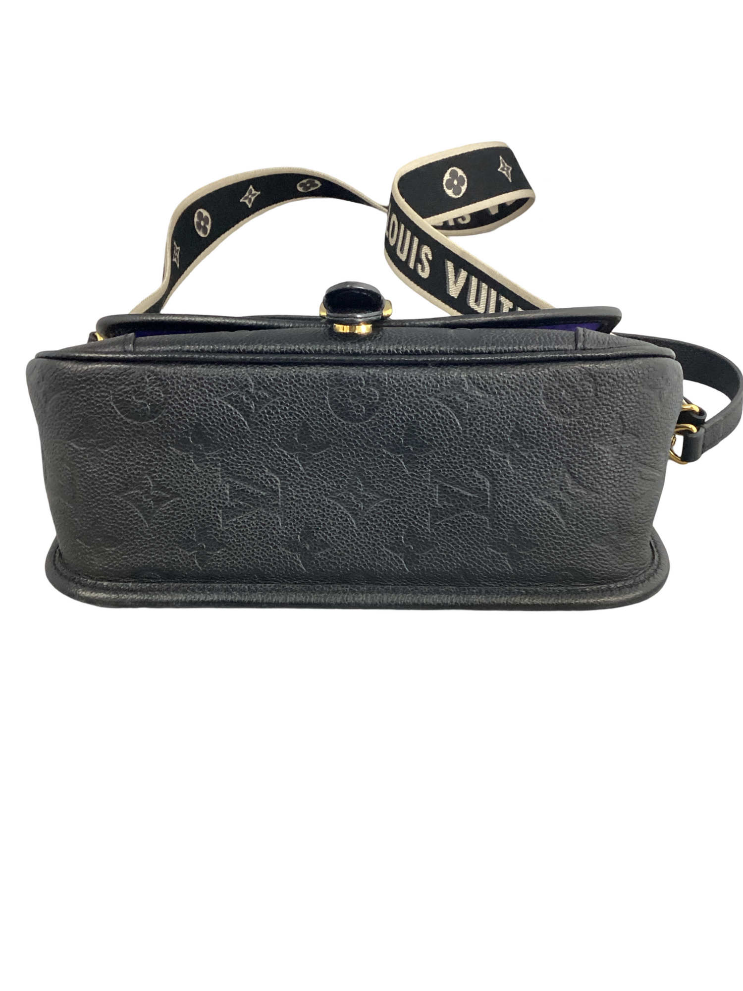 Louis Vuitton Monogram Empreinte Diane with gold-toned hardware, crafted of oversized Louis Vuitton monogram embossed on grained calfskin leather in black, a back slip pocket, a leather strap handle, an optional adjustable shoulder strap, and front flap magnetic faux buckle snap closure. Interior features opens with a matching microfiber interior and interior zipper pocket.
