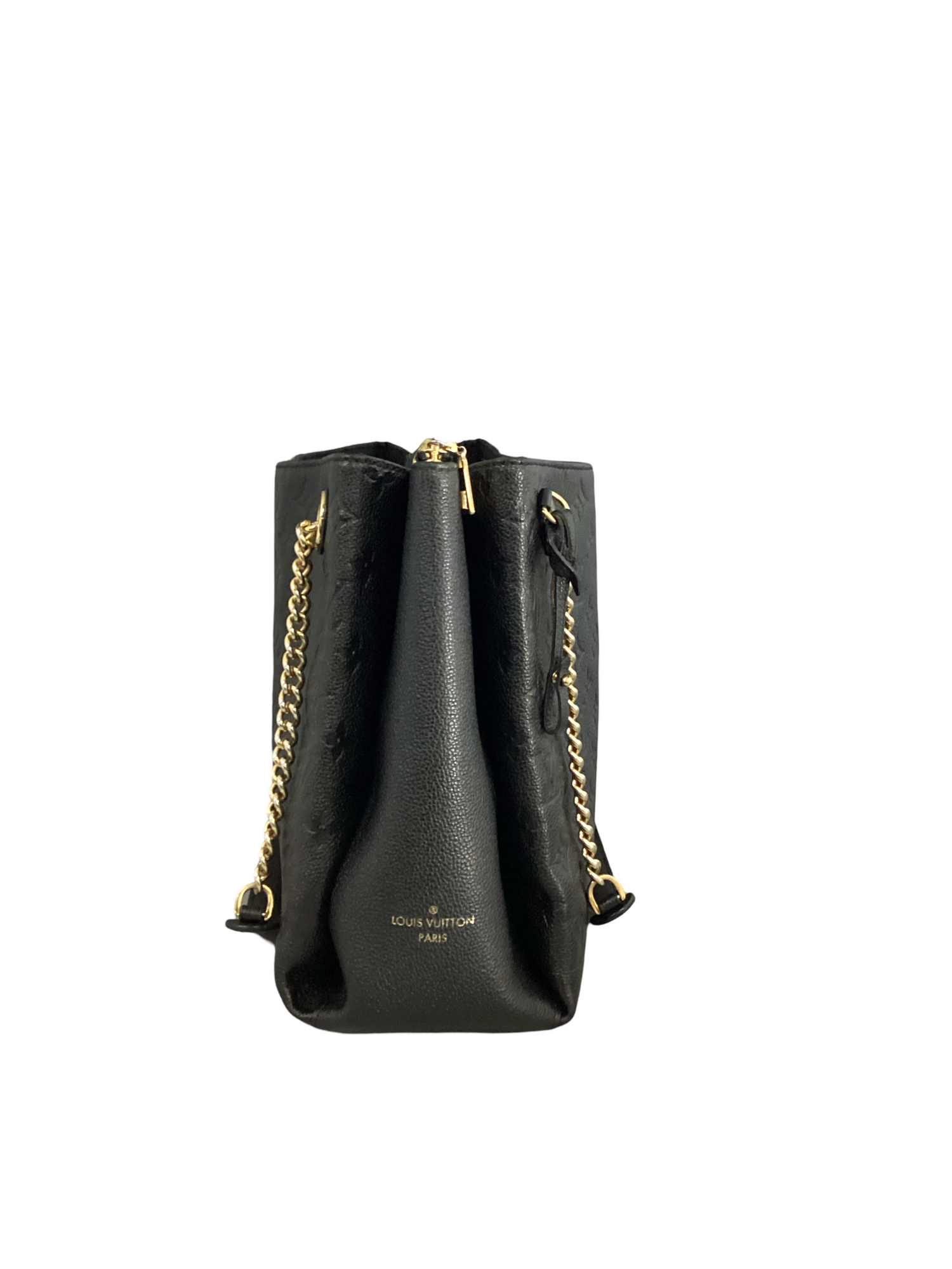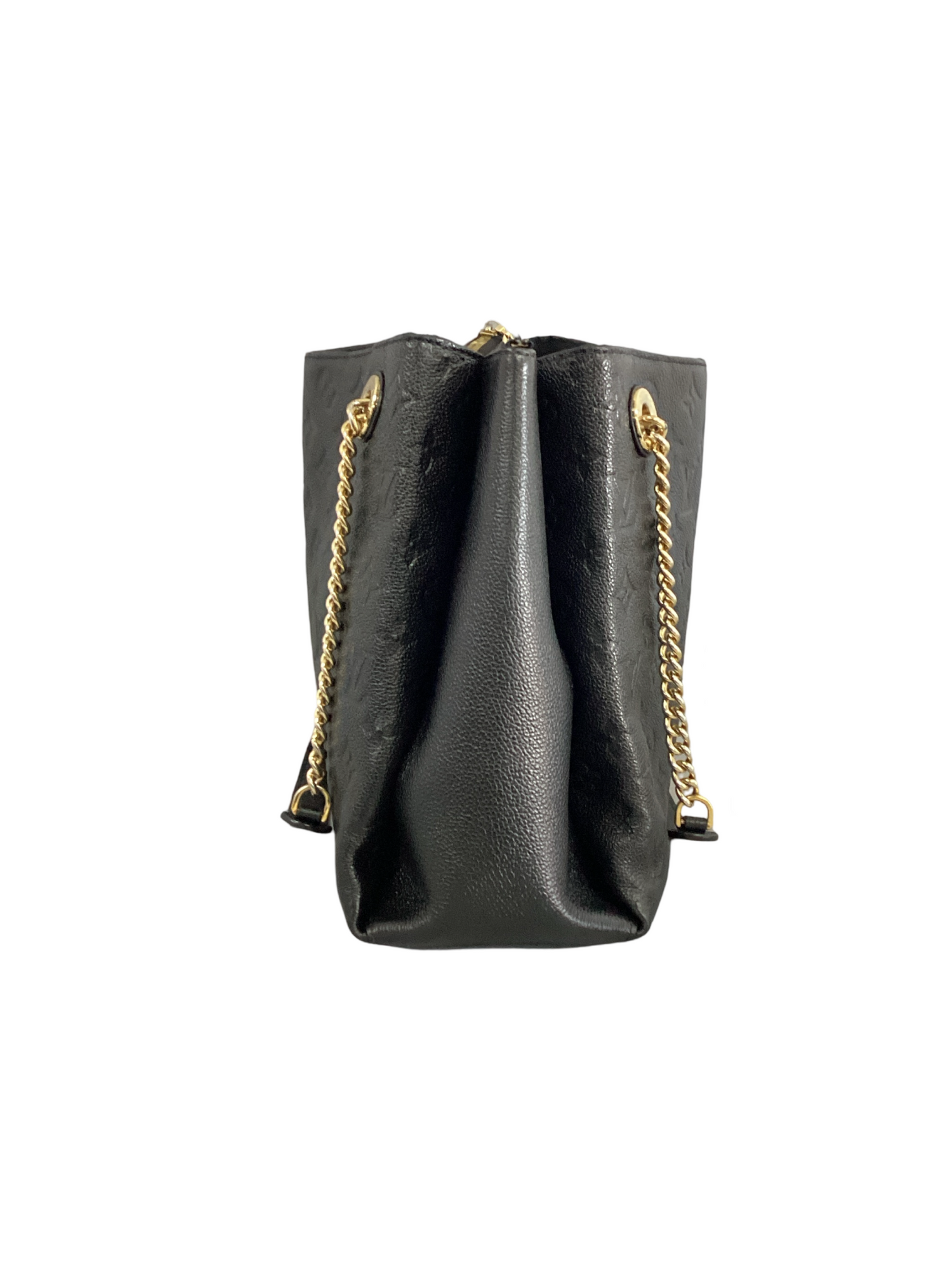 Louis Vuitton Monogram Empreinte Surene MM with gold-tone hardware, front and back compartments, dual shoulder straps, zipper closure on middle compartment. Interior features include black fabric lining, 2 slip pockets.