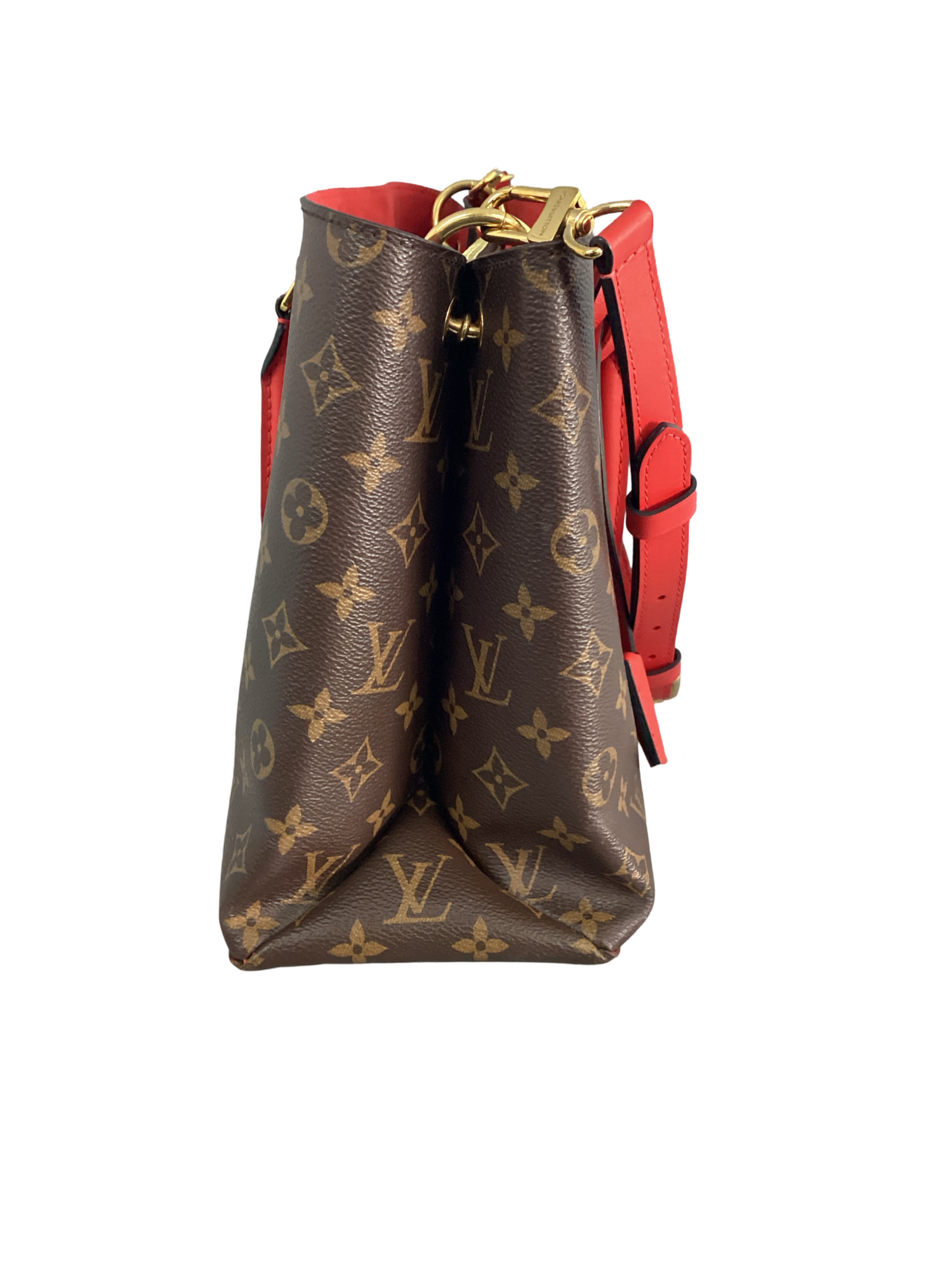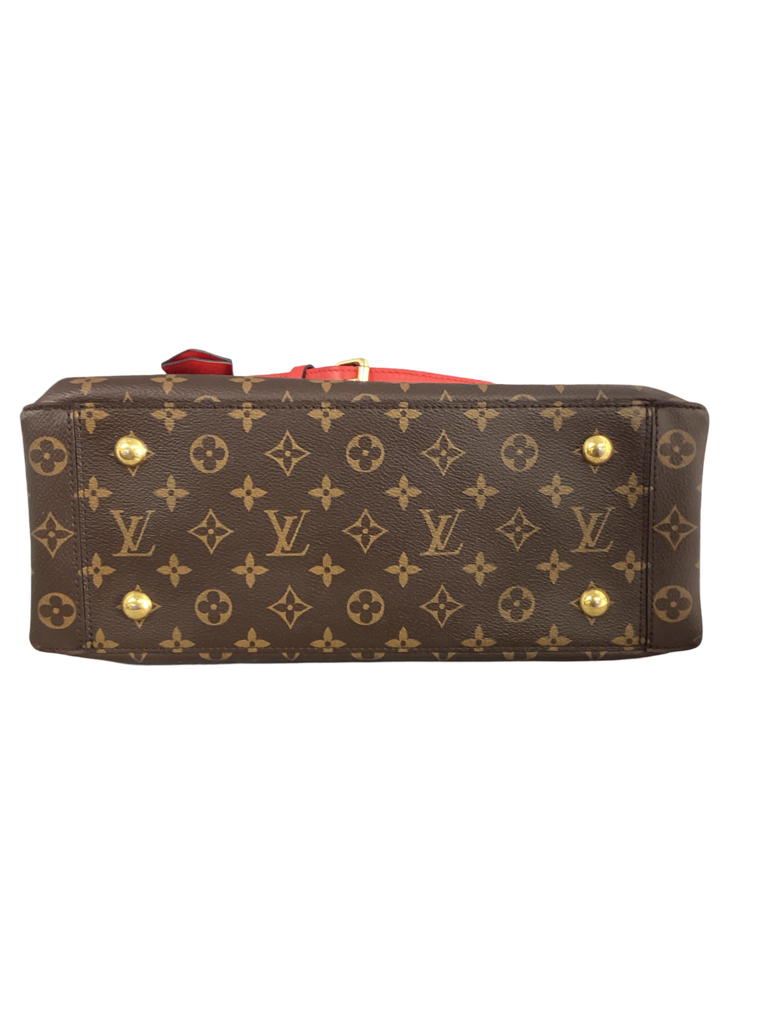 Louis Vuitton Monogram Flower Tote with gold-toned hardware, finely crafted of classic Louis Vuitton monogram coated canvas in brown, rolled red leather top handles, an optional adjustable leather shoulder strap, and a facing turn lock with fleur detail. Interior features red partitioned black microfiber interior with a patch pocket and a central zipper compartment.