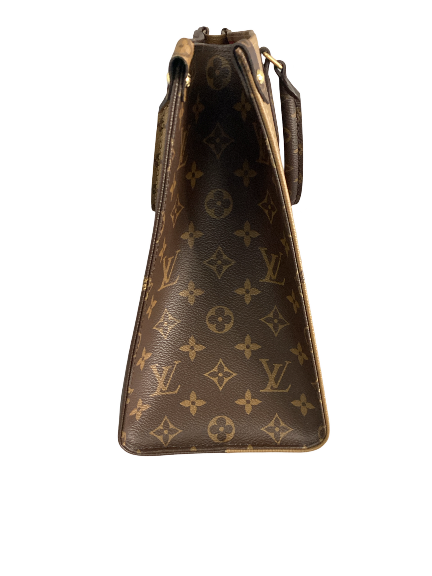 Louis Vuitton Monogram Giant Pattern OnTheGo MM with gold-tone hardware, oversized Louis Vuitton monogram canvas in dark and light brown, dual rolled top handles and dual black leather shoulder straps, and a clip hook closure. Interior features a spacious red fabric interior with zipper and patch pockets.