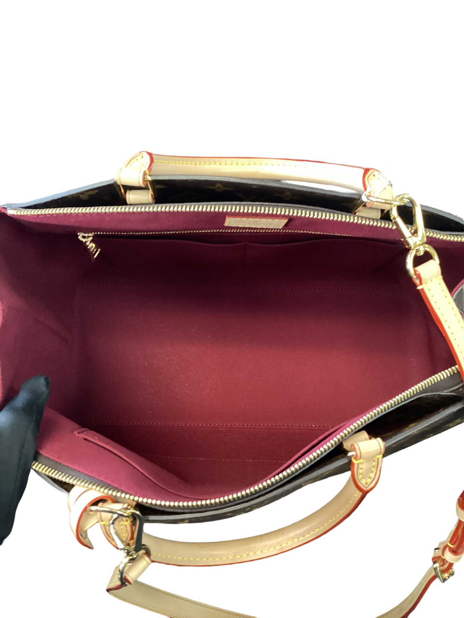 Louis Vuitton Monogram Grand Palais with gold-tone hardware, Louis Vuitton monogram dark brown canvas, vachetta leather rolled top handles, an optional detachable adjustable shoulder strap and zipper top closure. Interior features burgundy fabric interior with zipper and patch pockets.