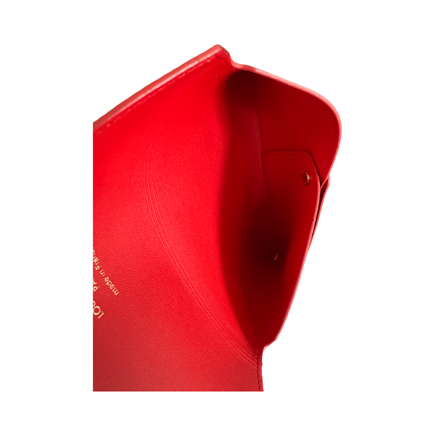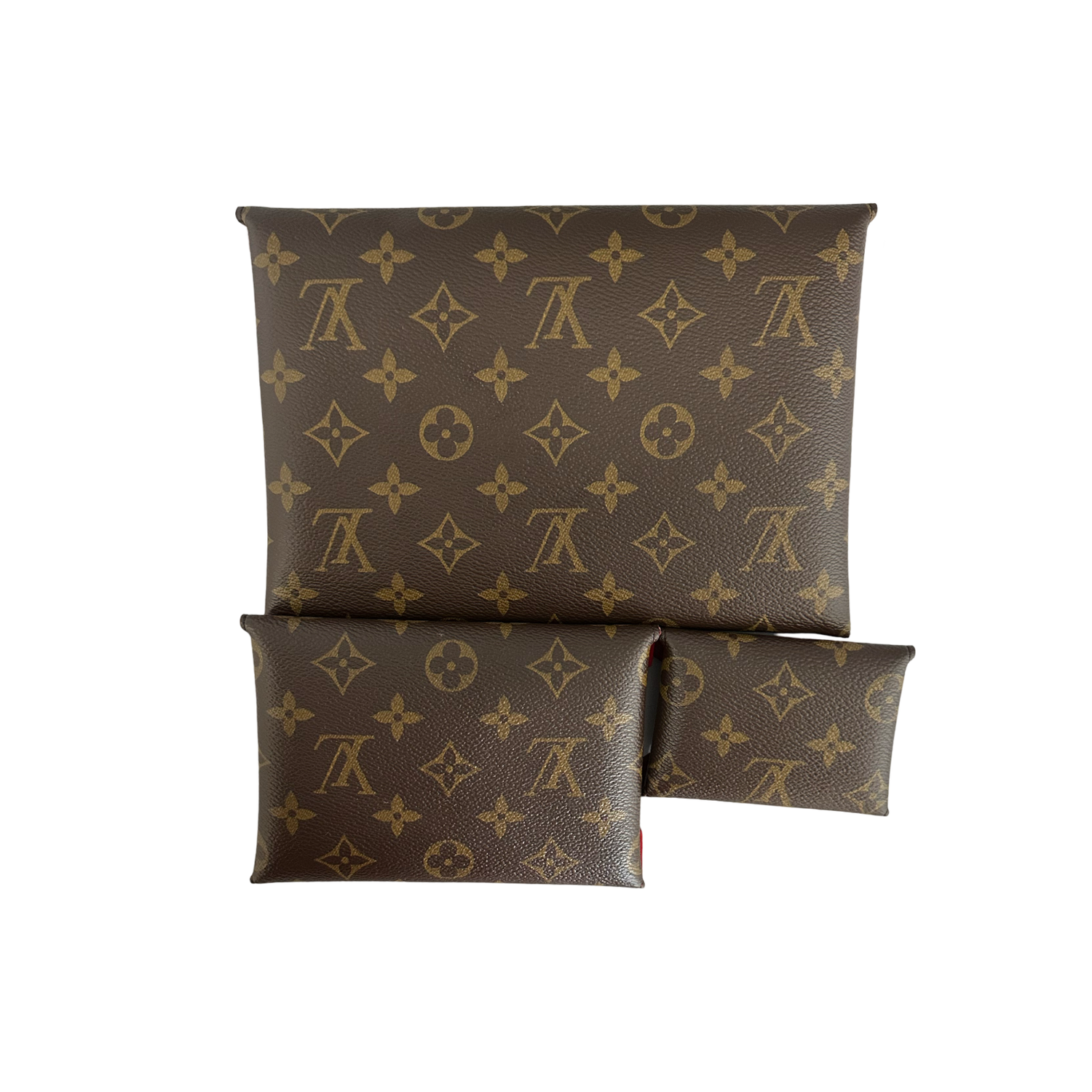 Louis Vuitton-Monogram Kirigami Pochette Set with gold-toned hardware, a chic pouch set is crafted of Louis Vuitton monogram on toile canvas, the pouches come in three sizes; large, medium, and small and snap button closure. Interior features a light pink, red, or dark red leather interior respectively.