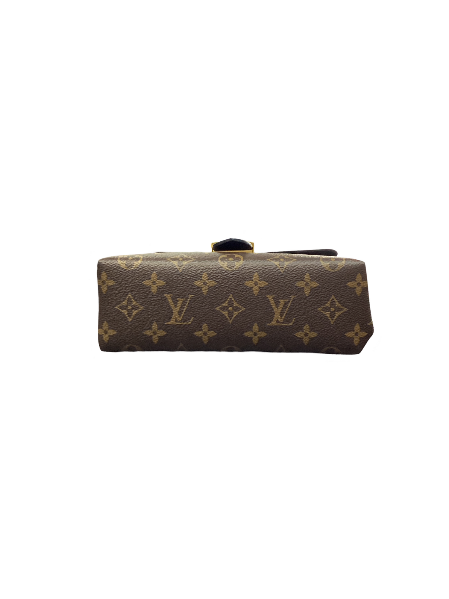 Louis Vuitton Monogram Locky BB with gold-tone hardware, monogram canvas leather, single top handle and adjustable detachable leather strap. Interior features black suede lining and one slip pocket.