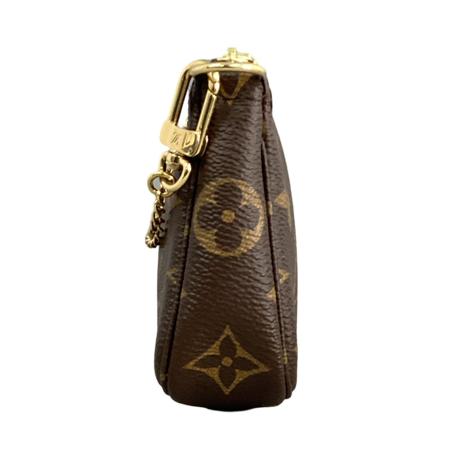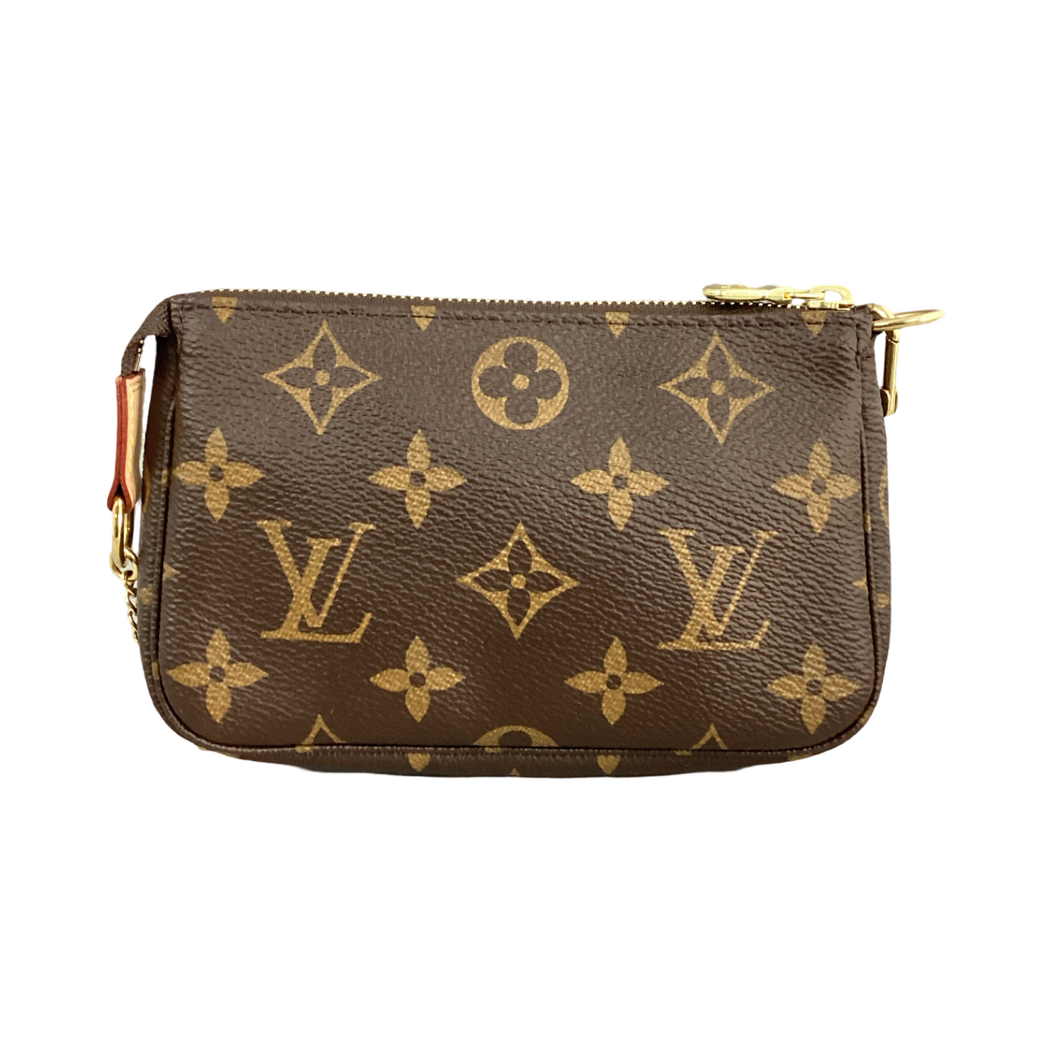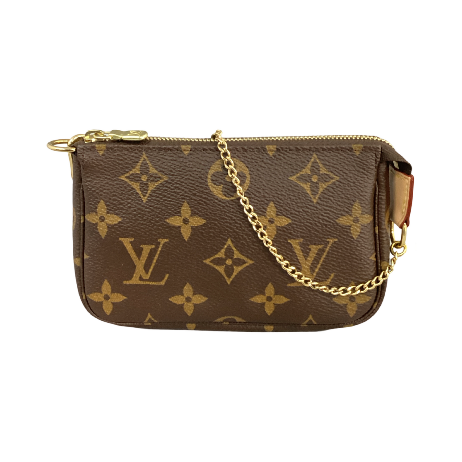 Louis Vuitton-Monogram Mini Pochette Accessoires with gold-toned hardware, crafted of classic Louis Vuitton monogram on coated canvas, a gold-toned chain strap and top zipper closure. Interior features that a cocoa brown fabric interior.