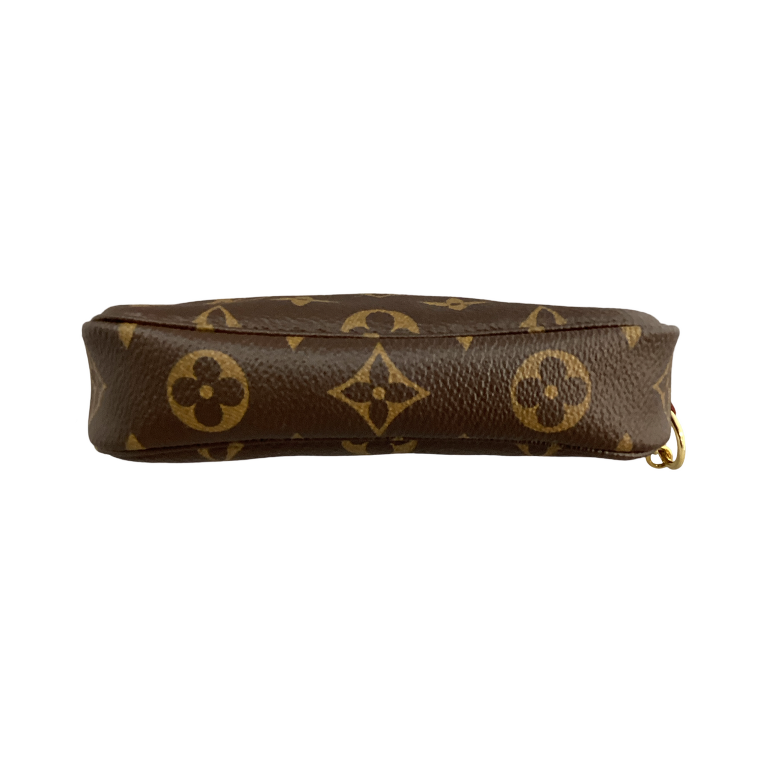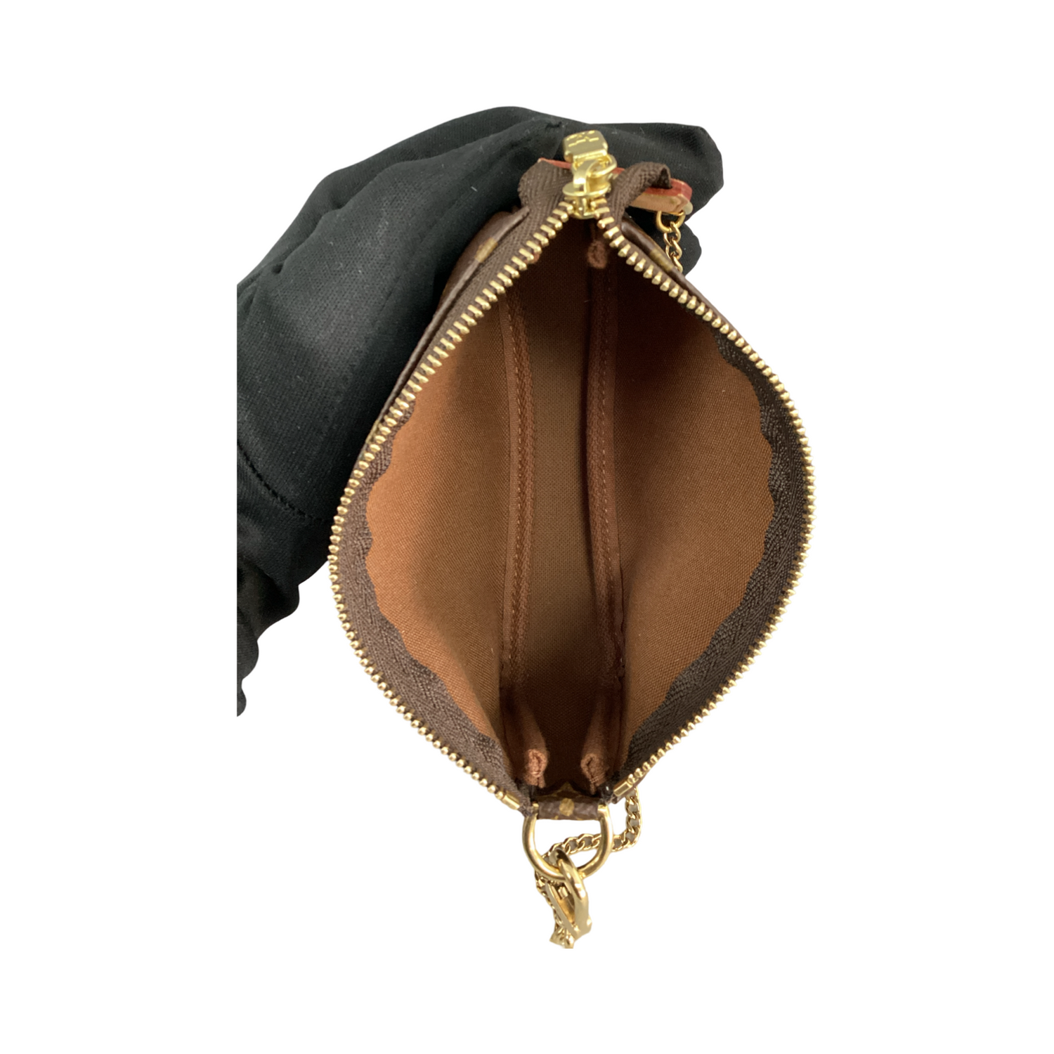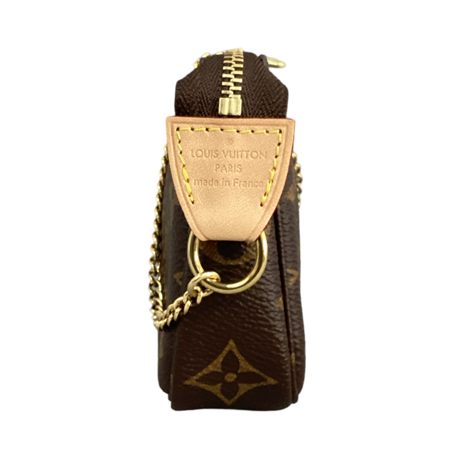 Louis Vuitton-Monogram Mini Pochette Accessoires with gold-toned hardware, crafted of classic Louis Vuitton monogram on coated canvas, a gold-toned chain strap and top zipper closure. Interior features that a cocoa brown fabric interior.