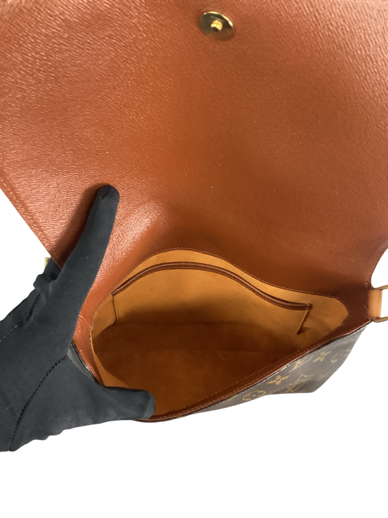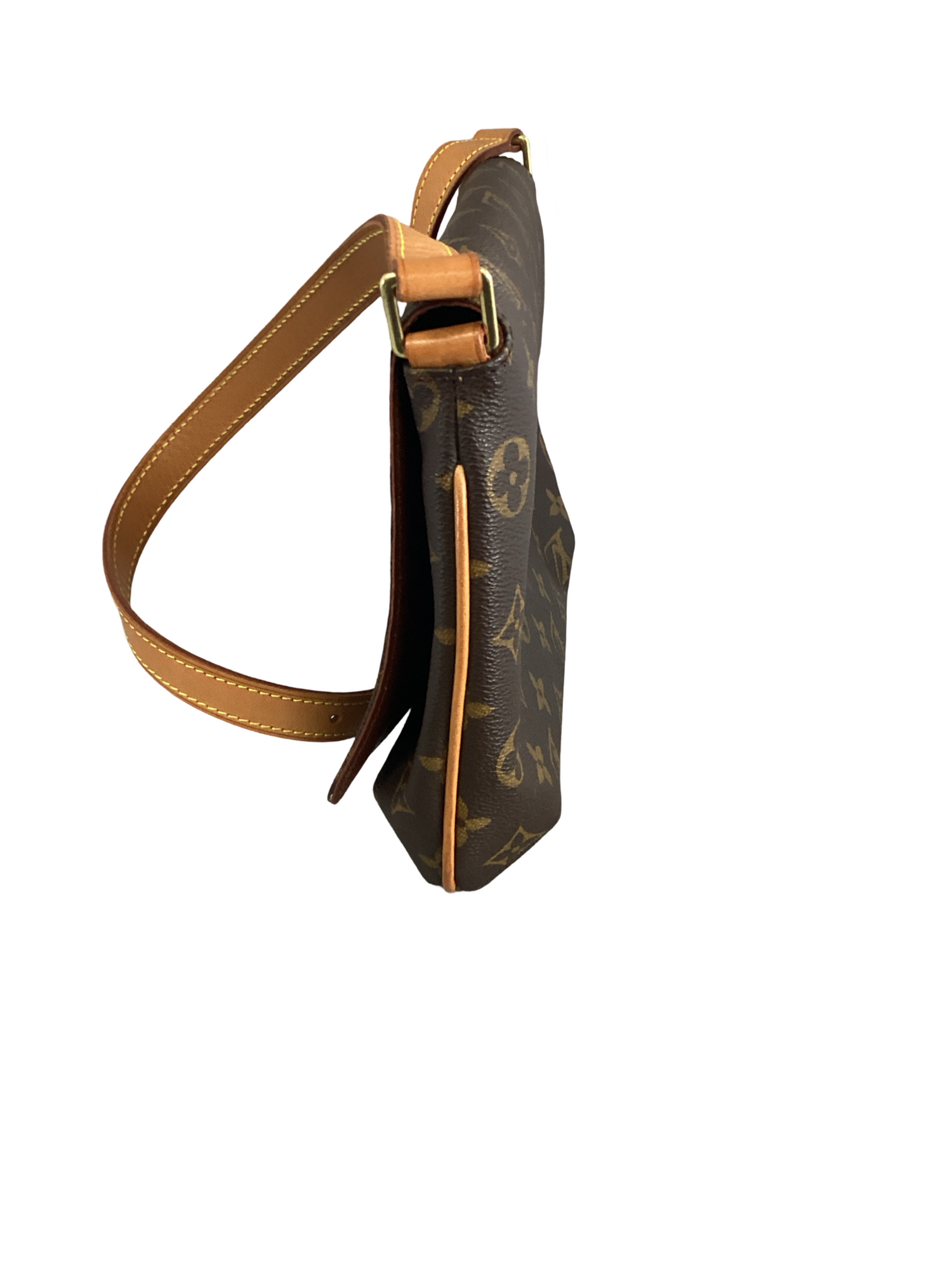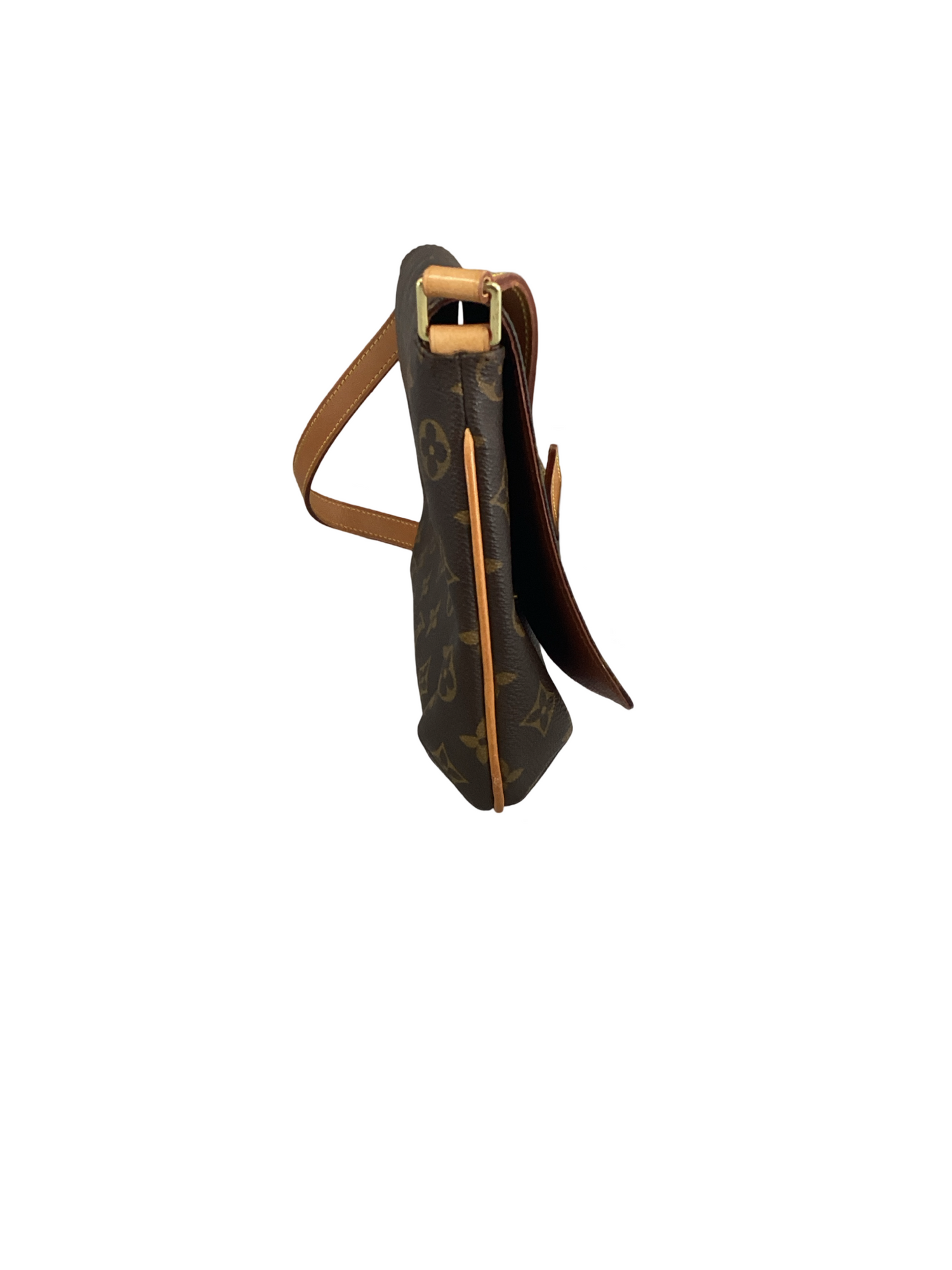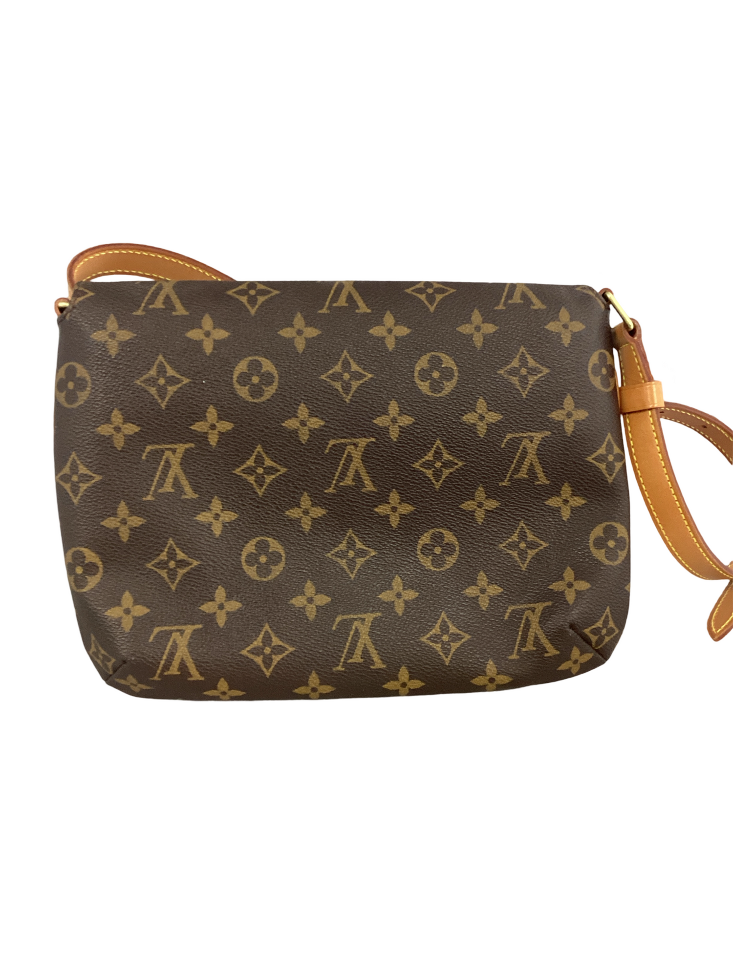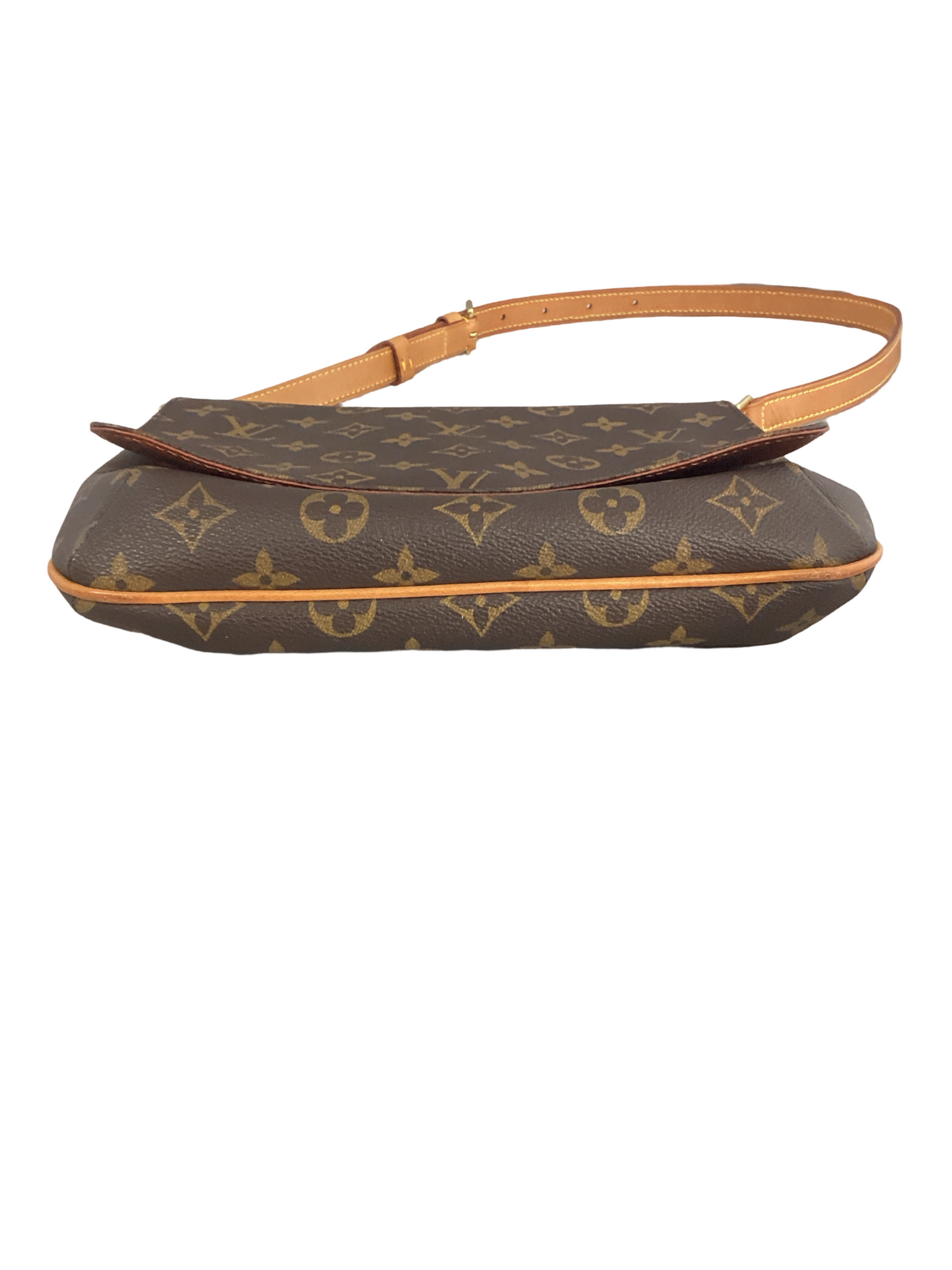 Louis Vuitton Monogram Musette Tango with gold-toned hardware, a Louis Vuitton monogram on coated canvas, a vachetta adjustable leather shoulder strap and a frontal flap snap closure. Interior features saffron alcantara microfiber interior with a patch pocket.