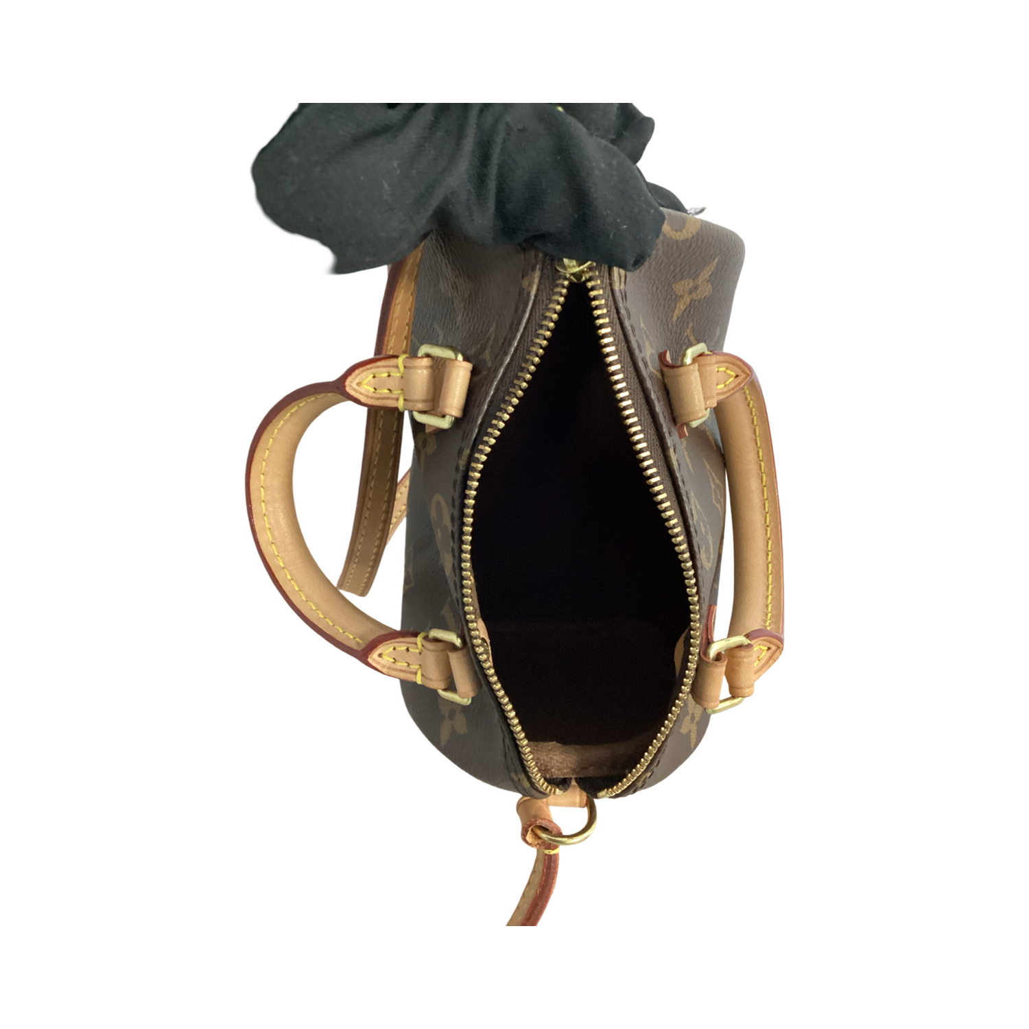 Louis Vuitton-Monogram Nano Speedy with gold-toned hardware, crafted of Louis Vuitton monogram on toile canvas, vachetta cowhide rolled leather top handles and a vachetta leather cross body shoulder strap and top zipper closure. Interior features a cocoa fabric interior.
