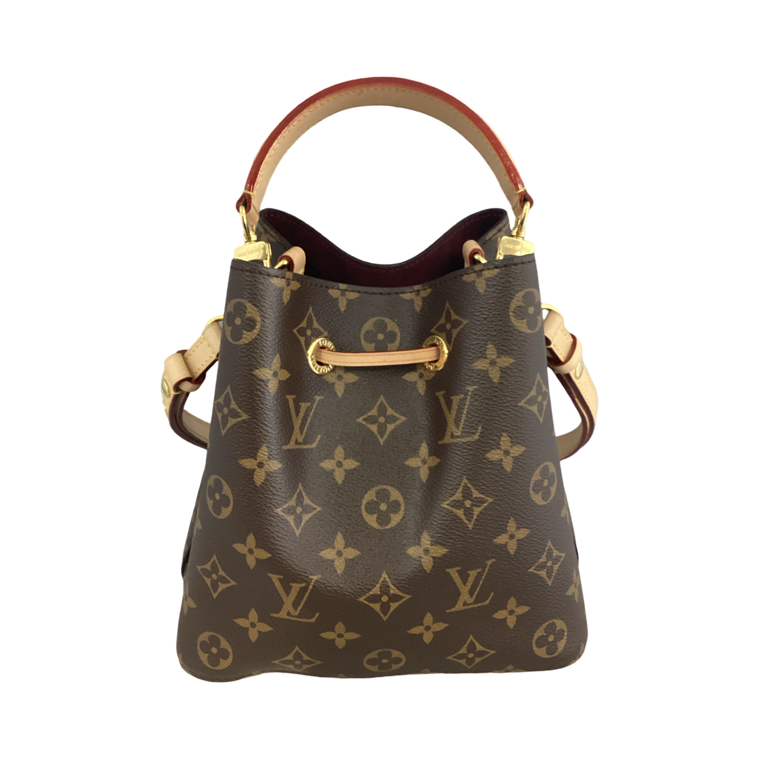 Louis Vuitton Monogram Neo Noe BB Bucket Bag with gold-tone hardware, detachable single top handle, detachable adjustable shoulder strap, drawstring closure. Interior features include maroon fabric lining, two separate compartments, single snap closure pocket.